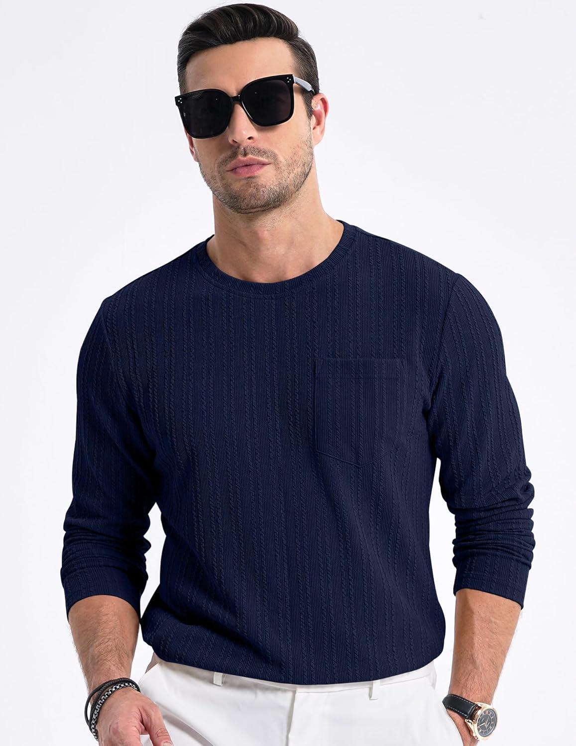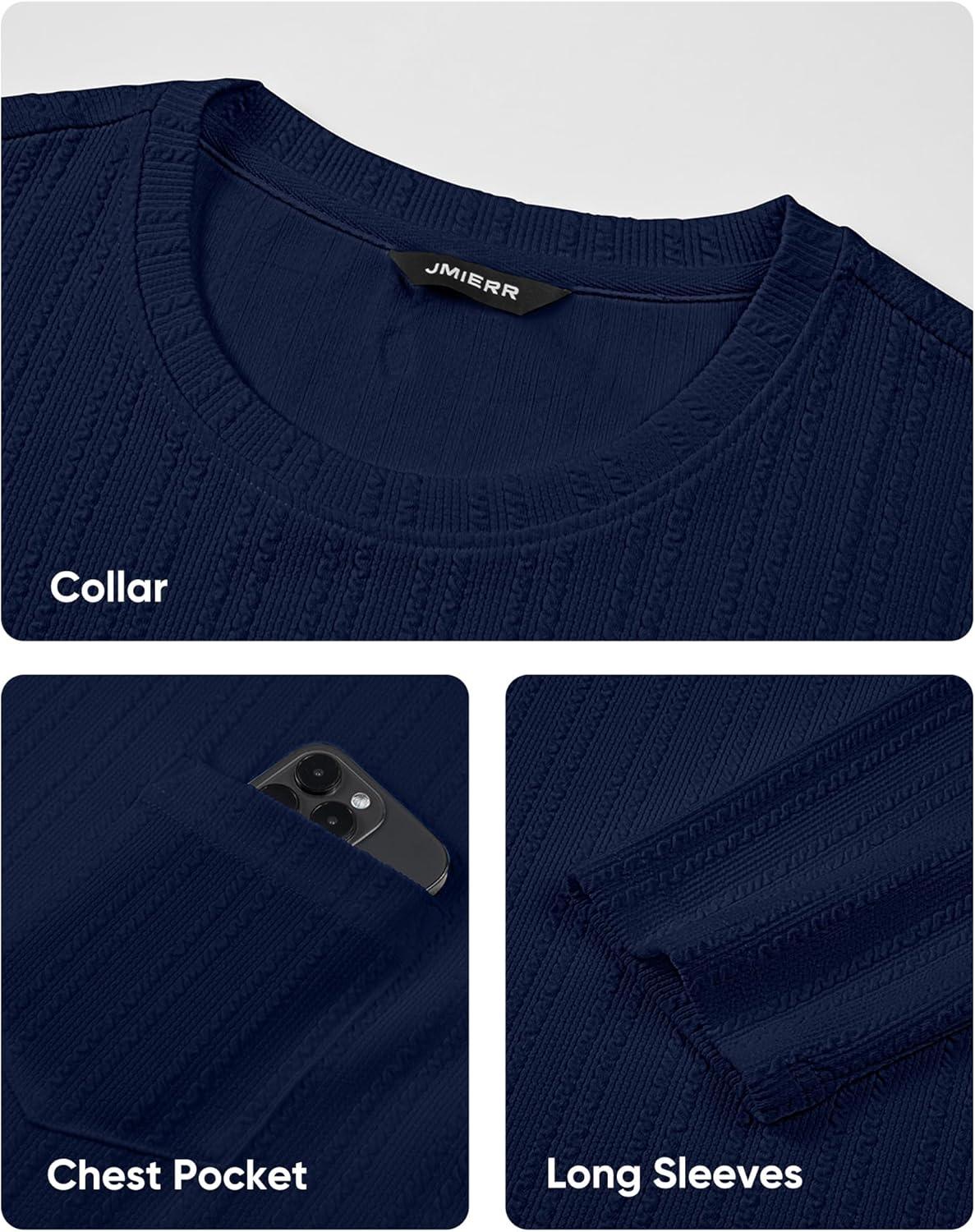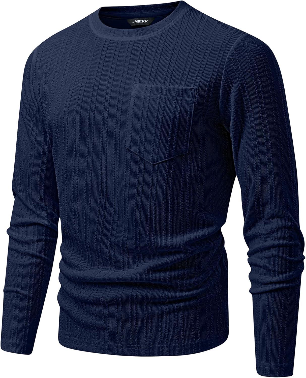 JMIERR Men’s Long Sleeve Shirts Casual Crewneck Pullover T-Shirt Stretch Textured Knit Tee with Pocket(02 Navy Blue)
