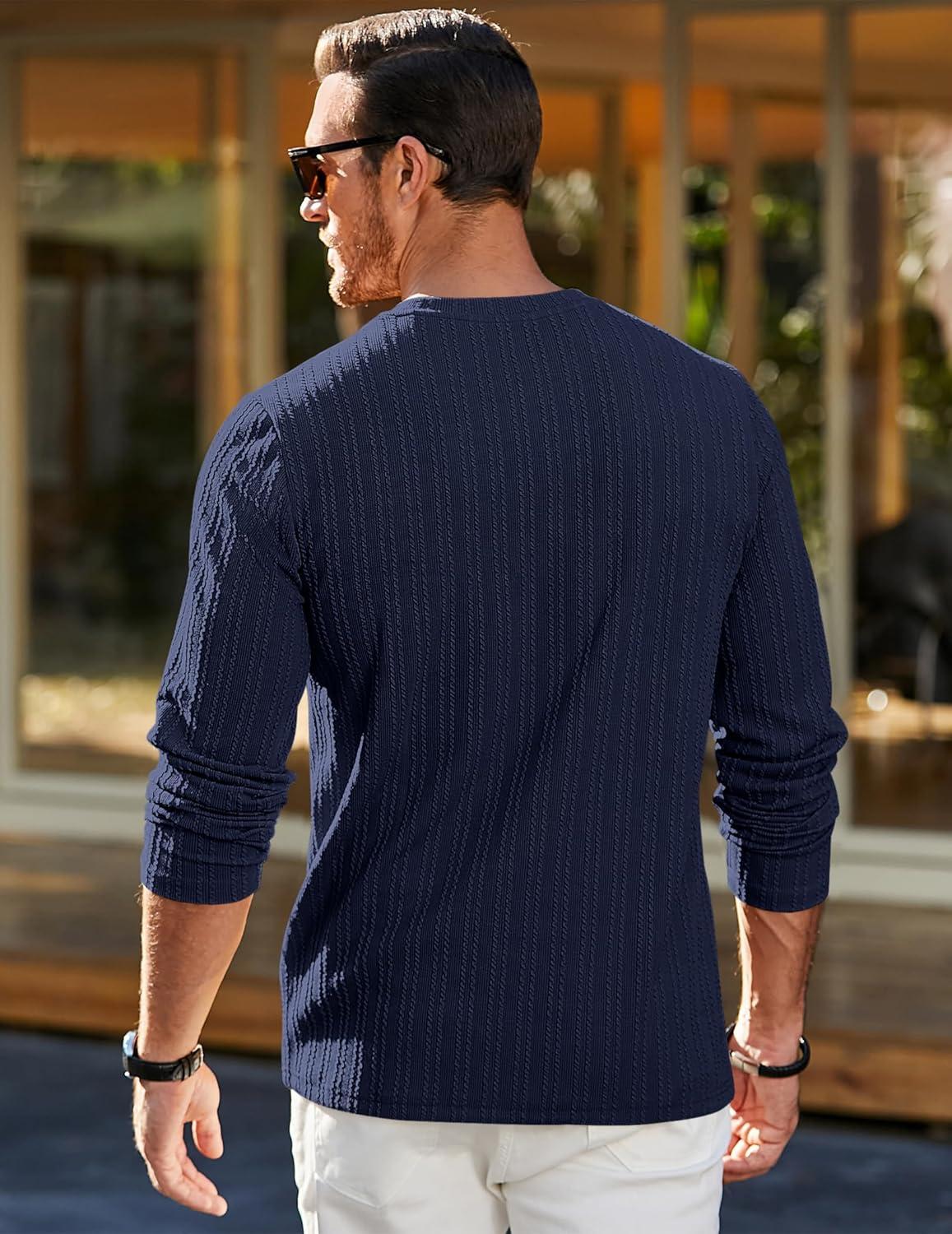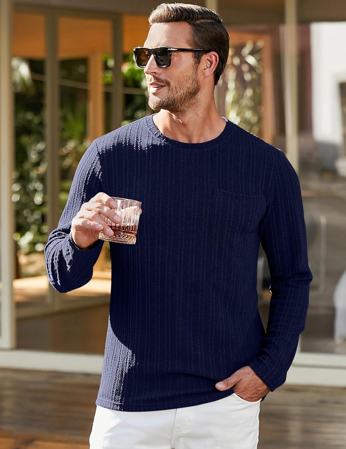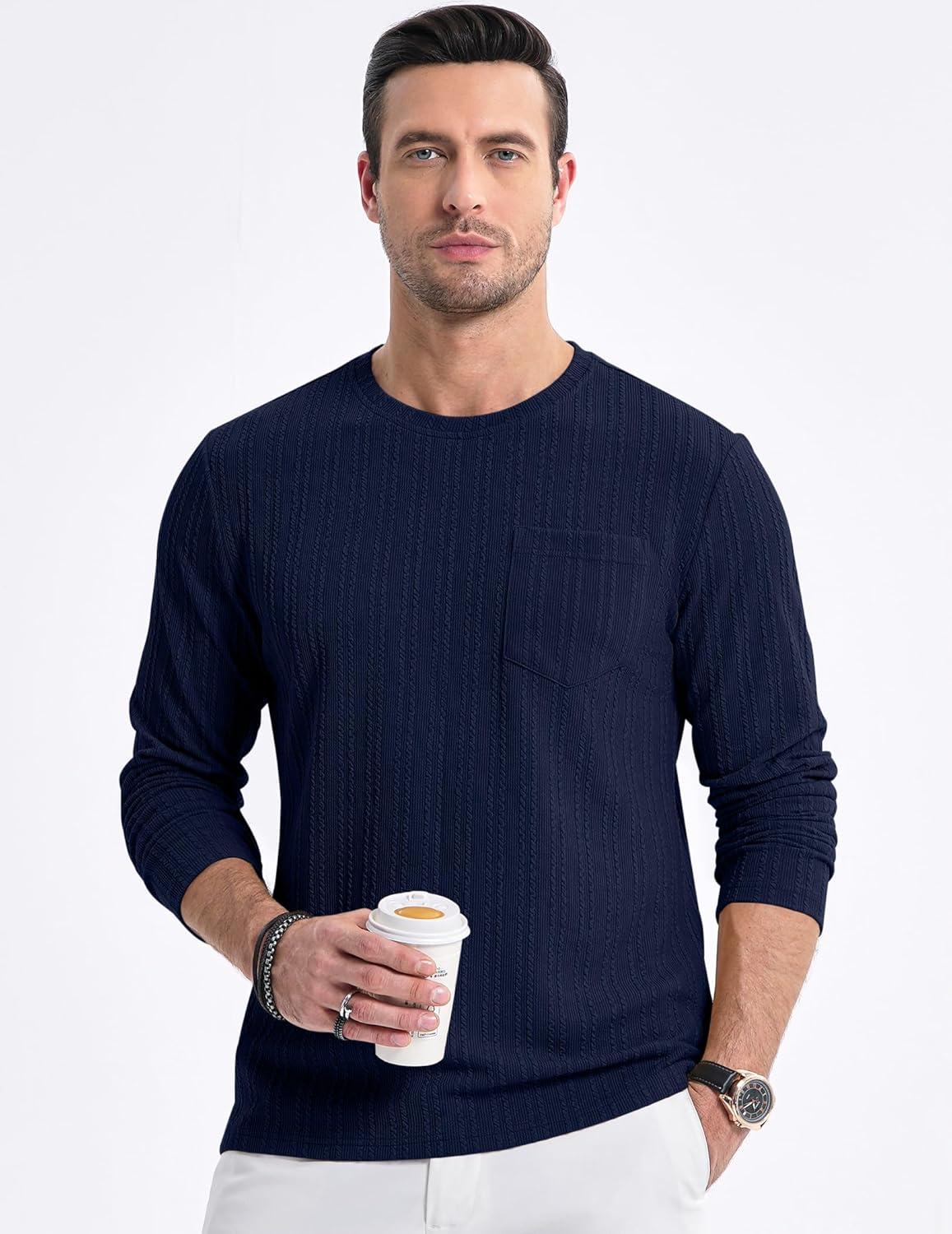 JMIERR Men’s Long Sleeve Shirts Casual Crewneck Pullover T-Shirt Stretch Textured Knit Tee with Pocket(02 Navy Blue)