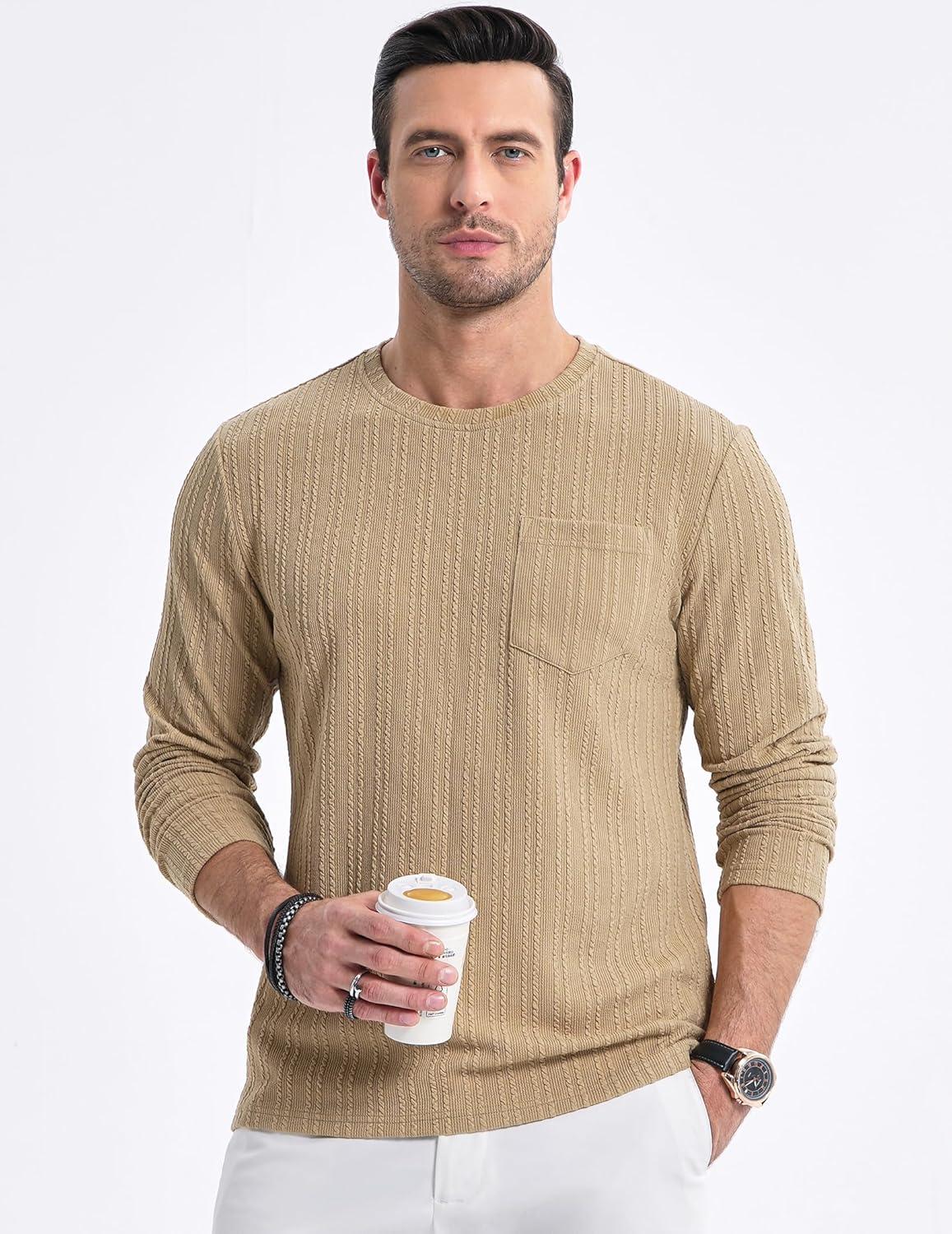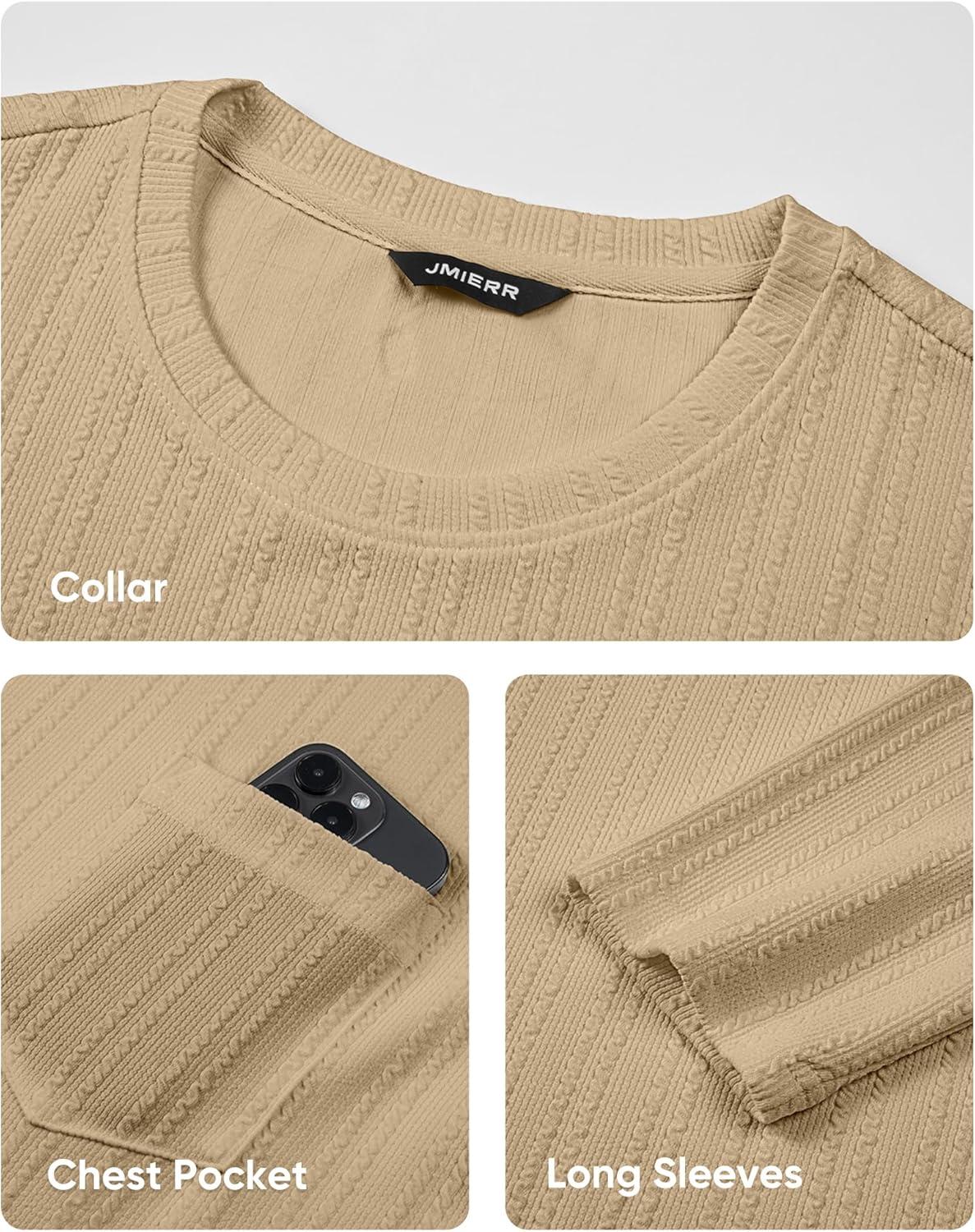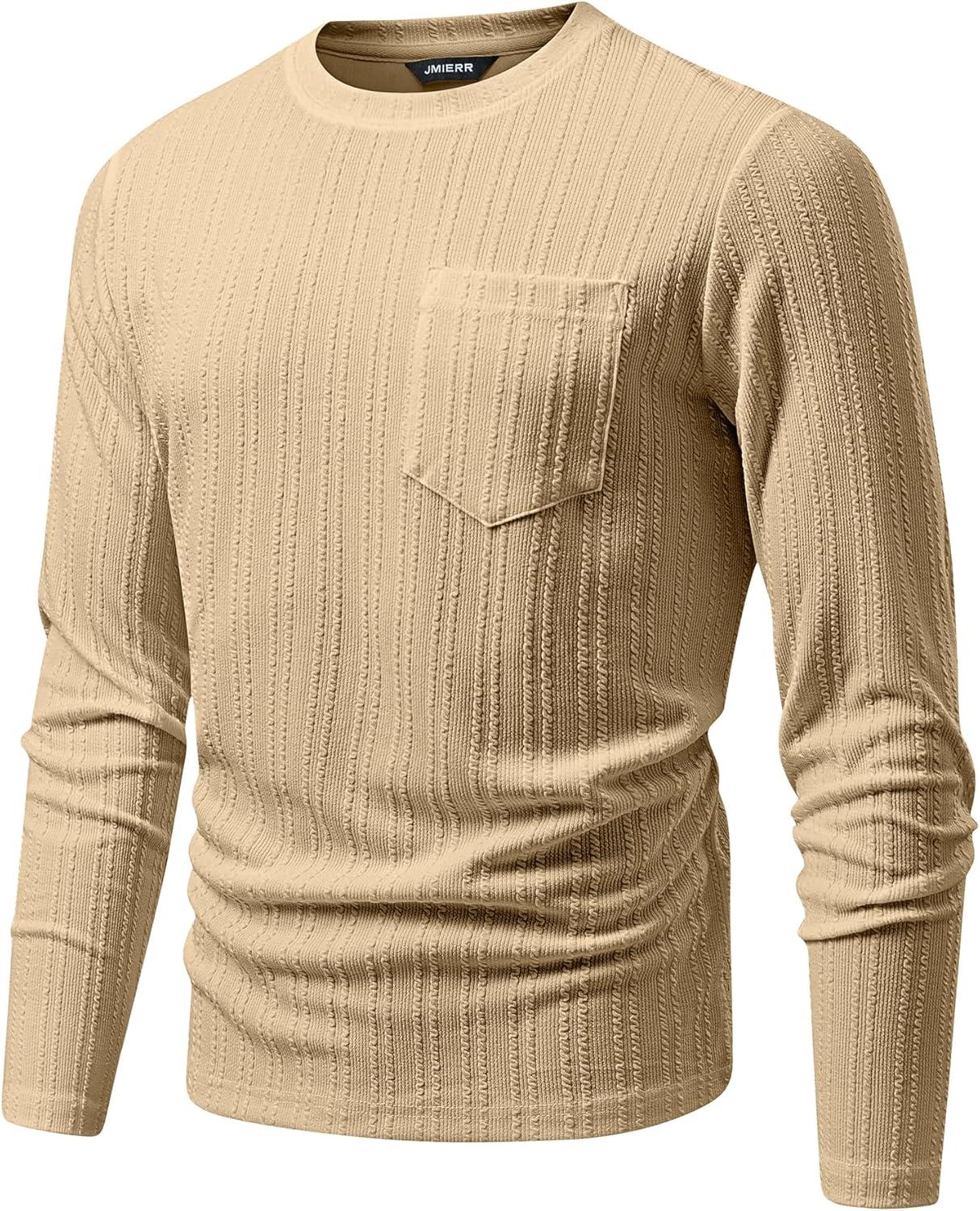 JMIERR Men’s Long Sleeve Shirts Casual Crewneck Pullover T-Shirt Stretch Textured Knit Tee with Pocket(04 Khaki)