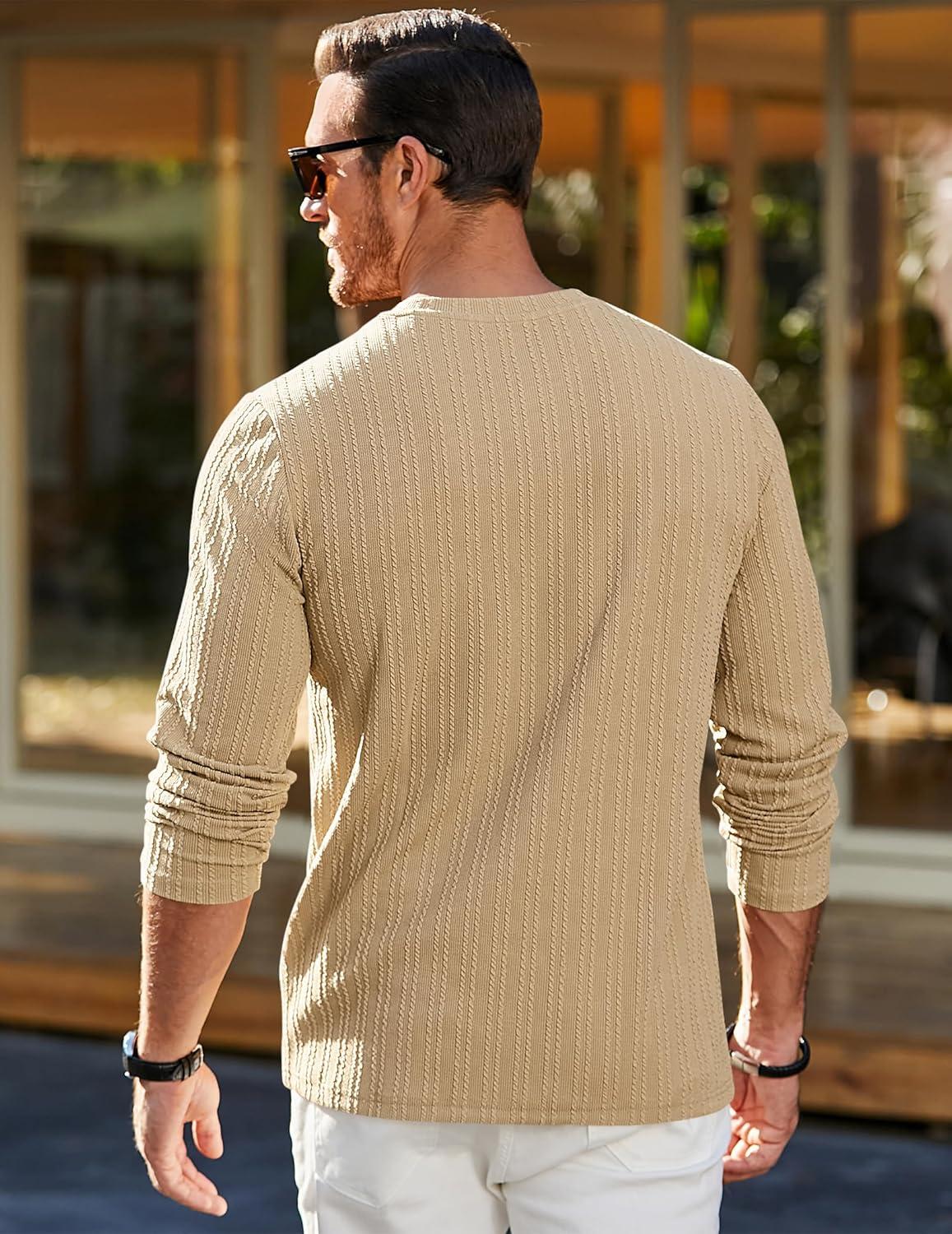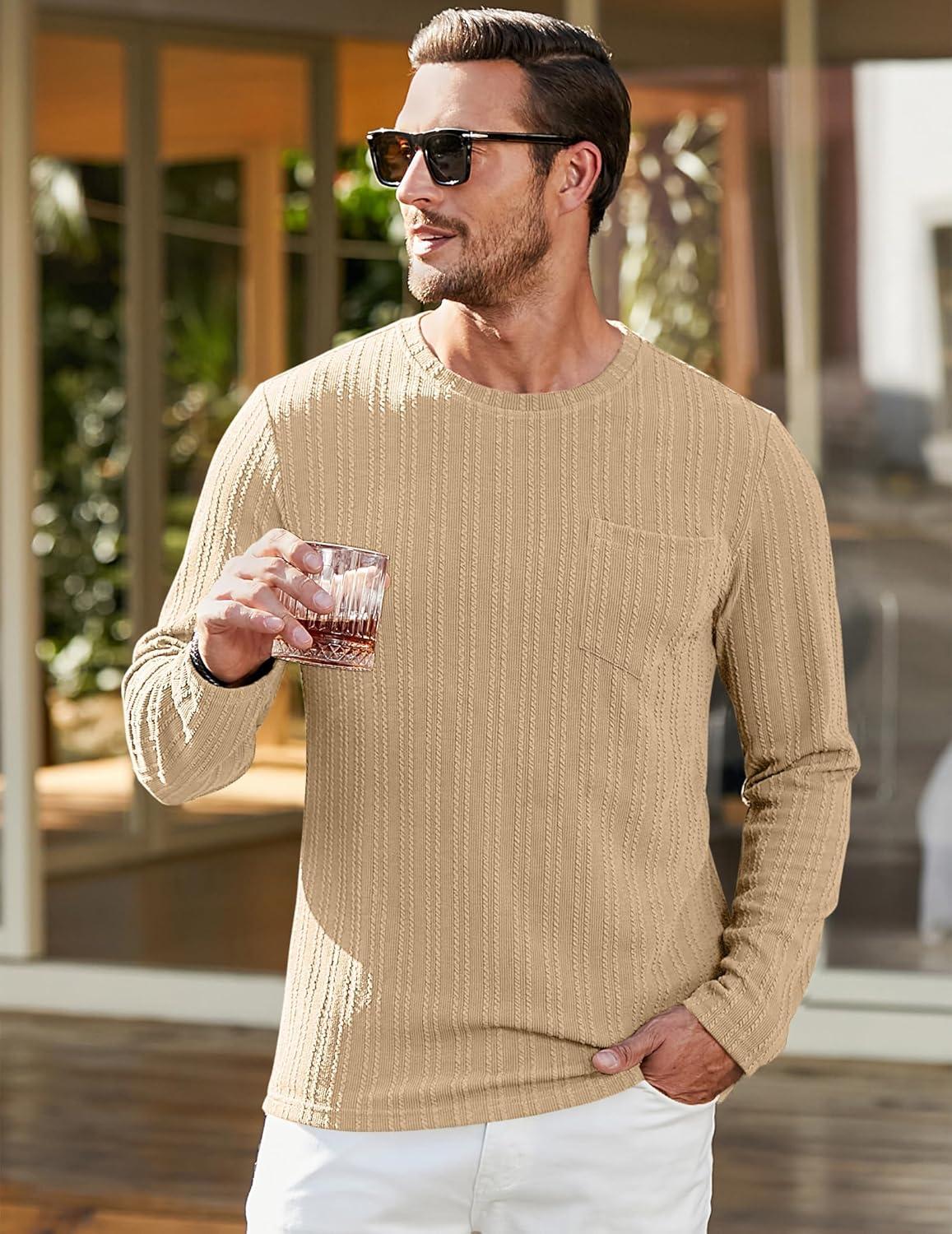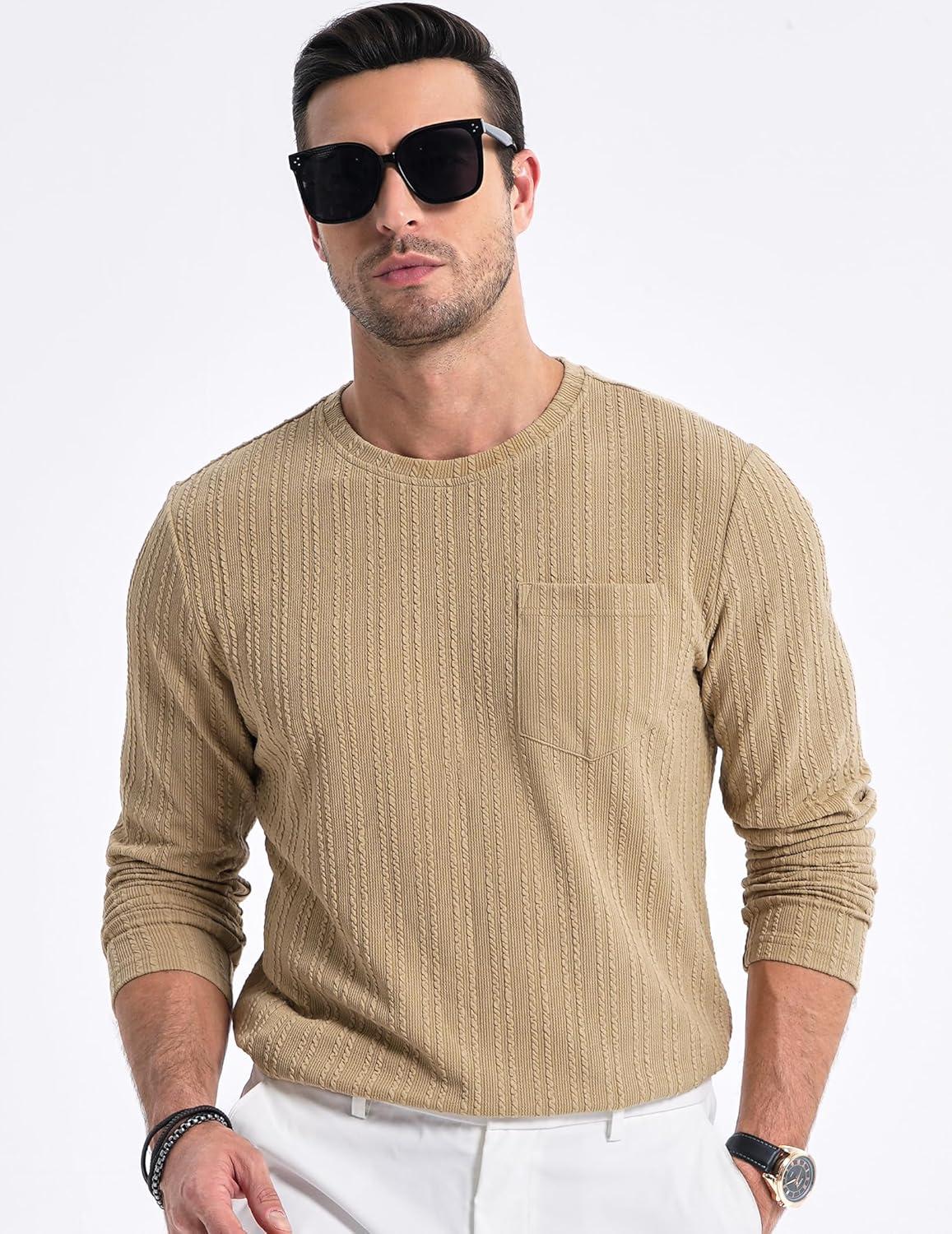 JMIERR Men’s Long Sleeve Shirts Casual Crewneck Pullover T-Shirt Stretch Textured Knit Tee with Pocket(04 Khaki)