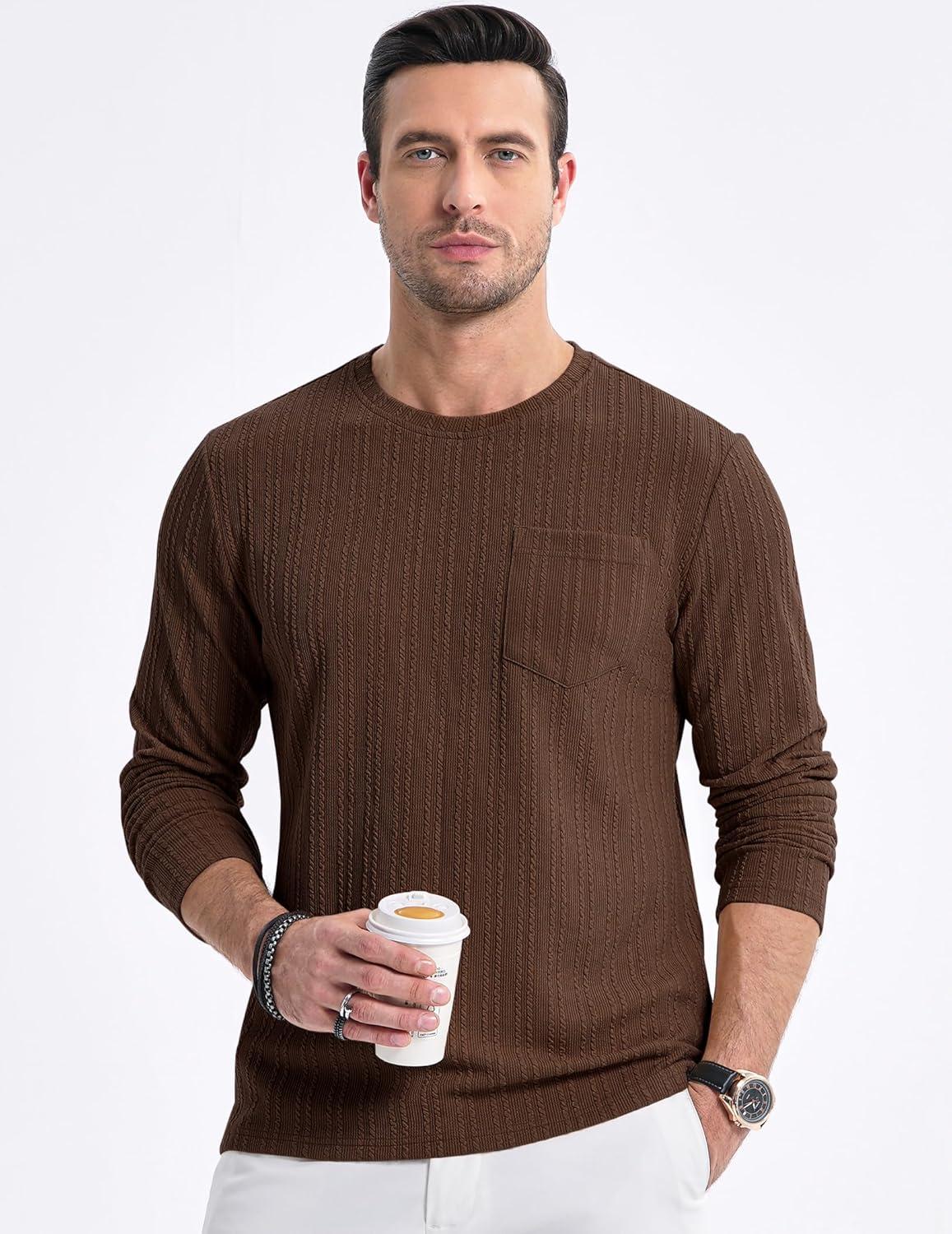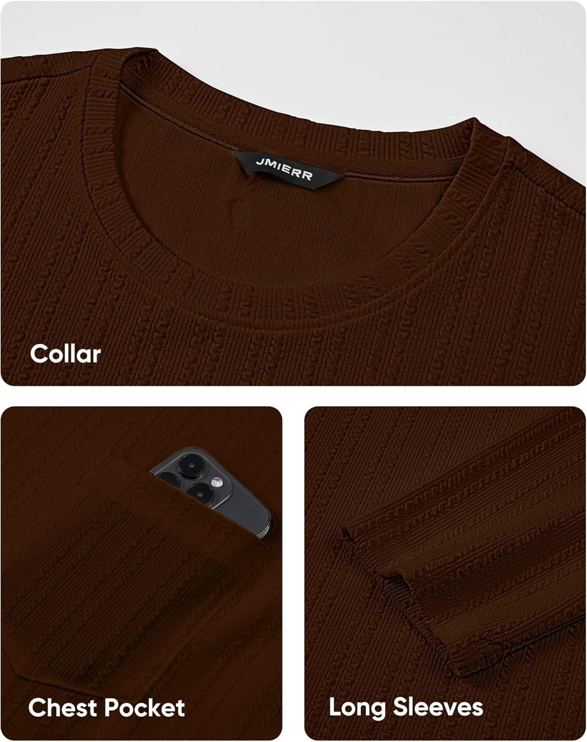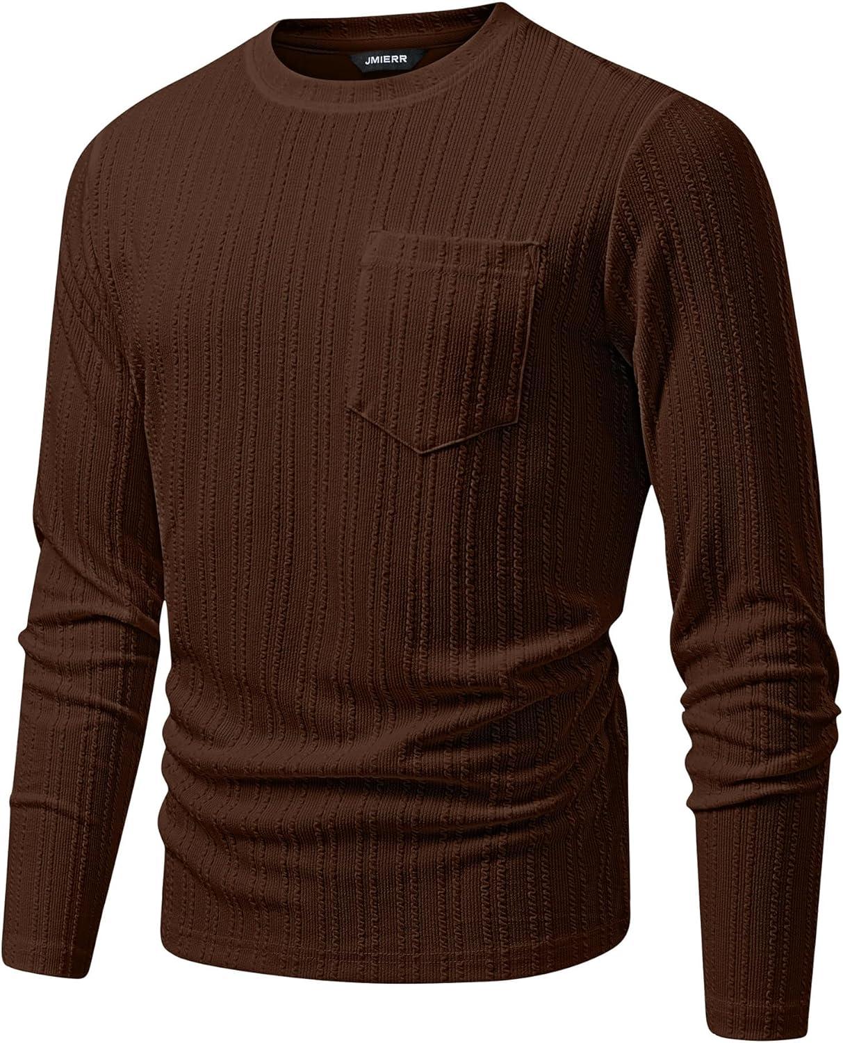 JMIERR Men’s Long Sleeve Shirts Casual Crewneck Pullover T-Shirt Stretch Textured Knit Tee with Pocket(13 Coffee)