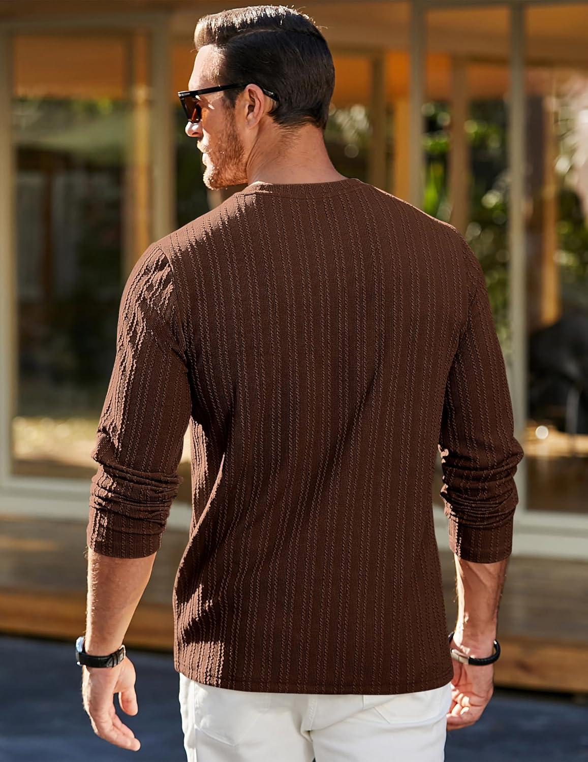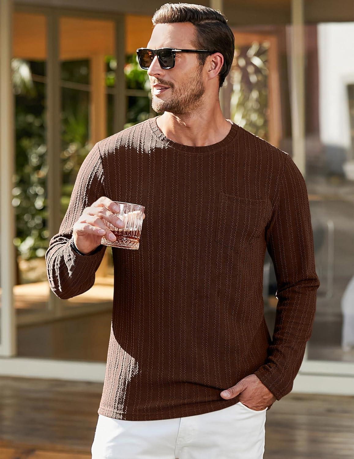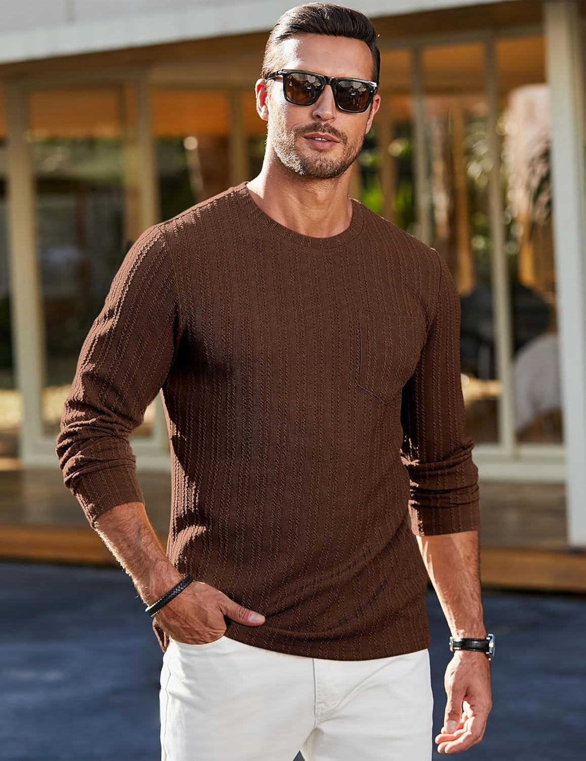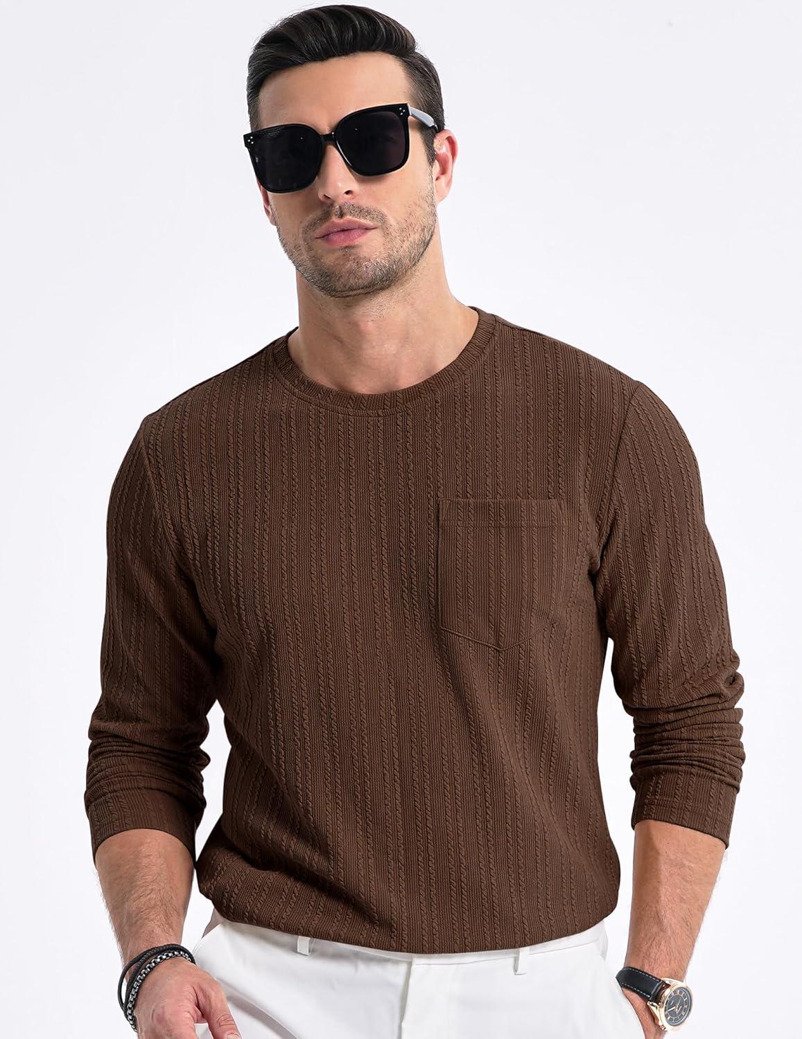 JMIERR Men’s Long Sleeve Shirts Casual Crewneck Pullover T-Shirt Stretch Textured Knit Tee with Pocket(13 Coffee)