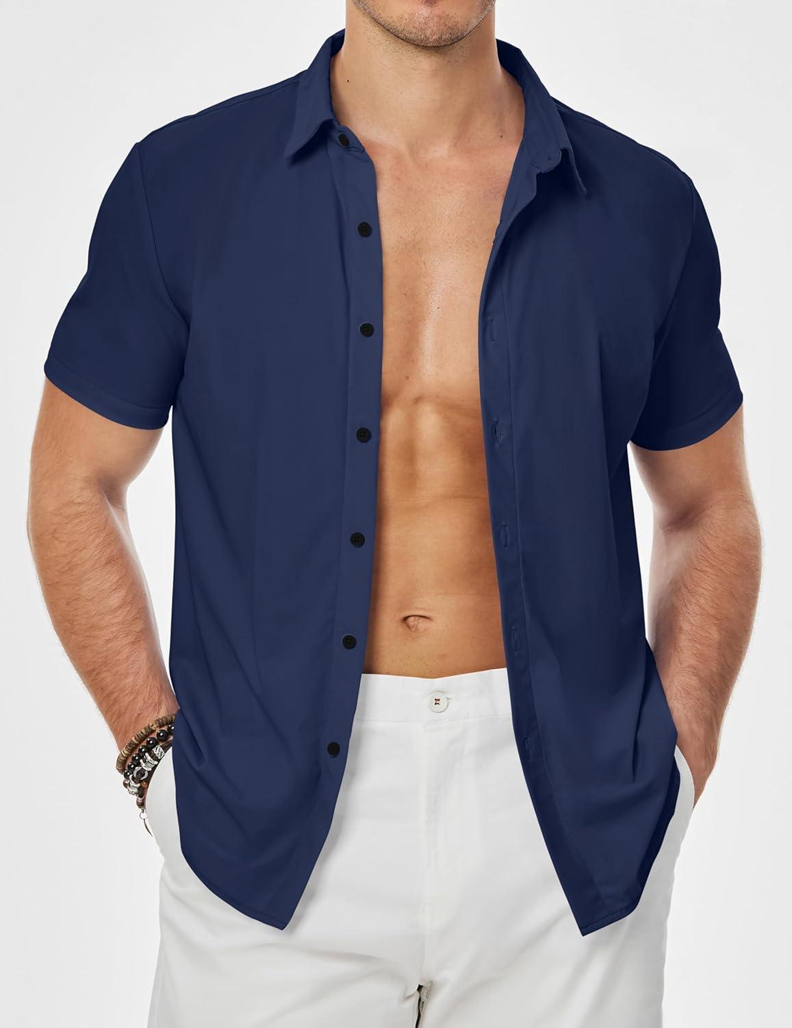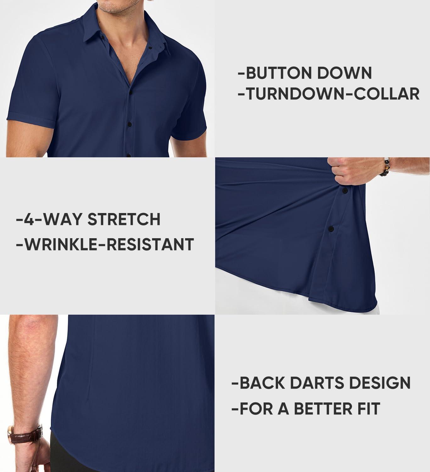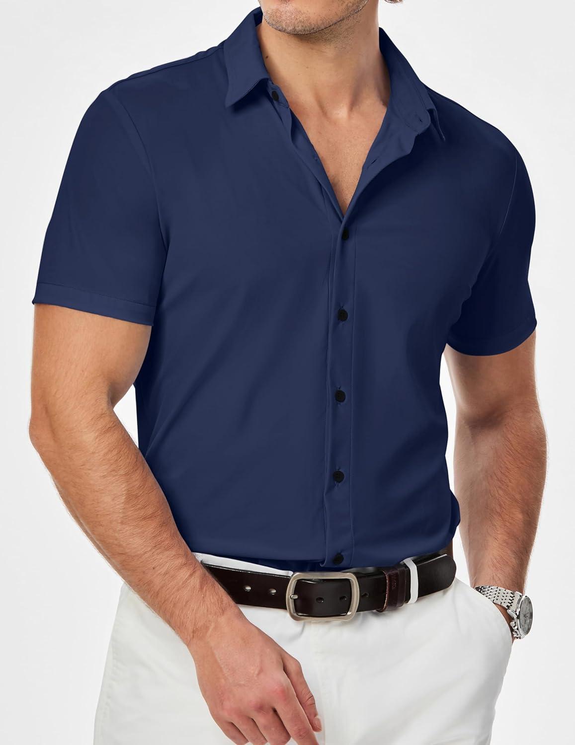 JMIERR Men’s Muscle Fit Dress Shirts Summer Casual Button Down Short Sleeve High Stretch Wrinkle-Free Shirt(C Blue)