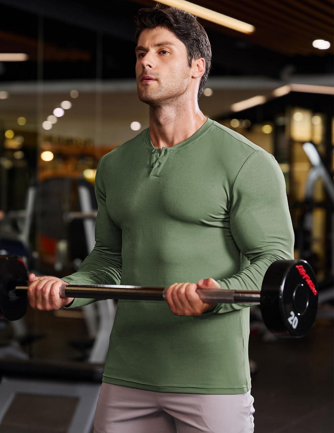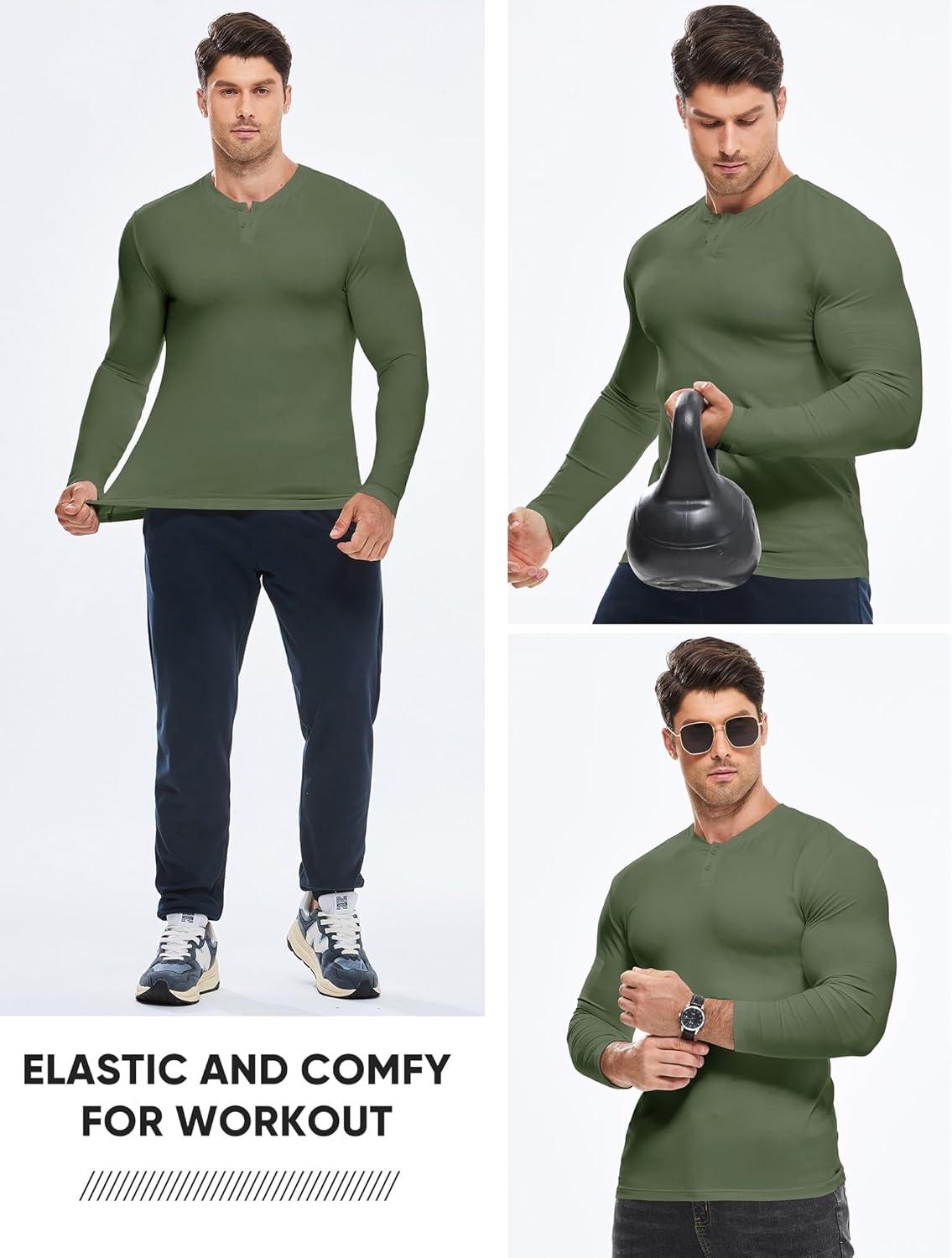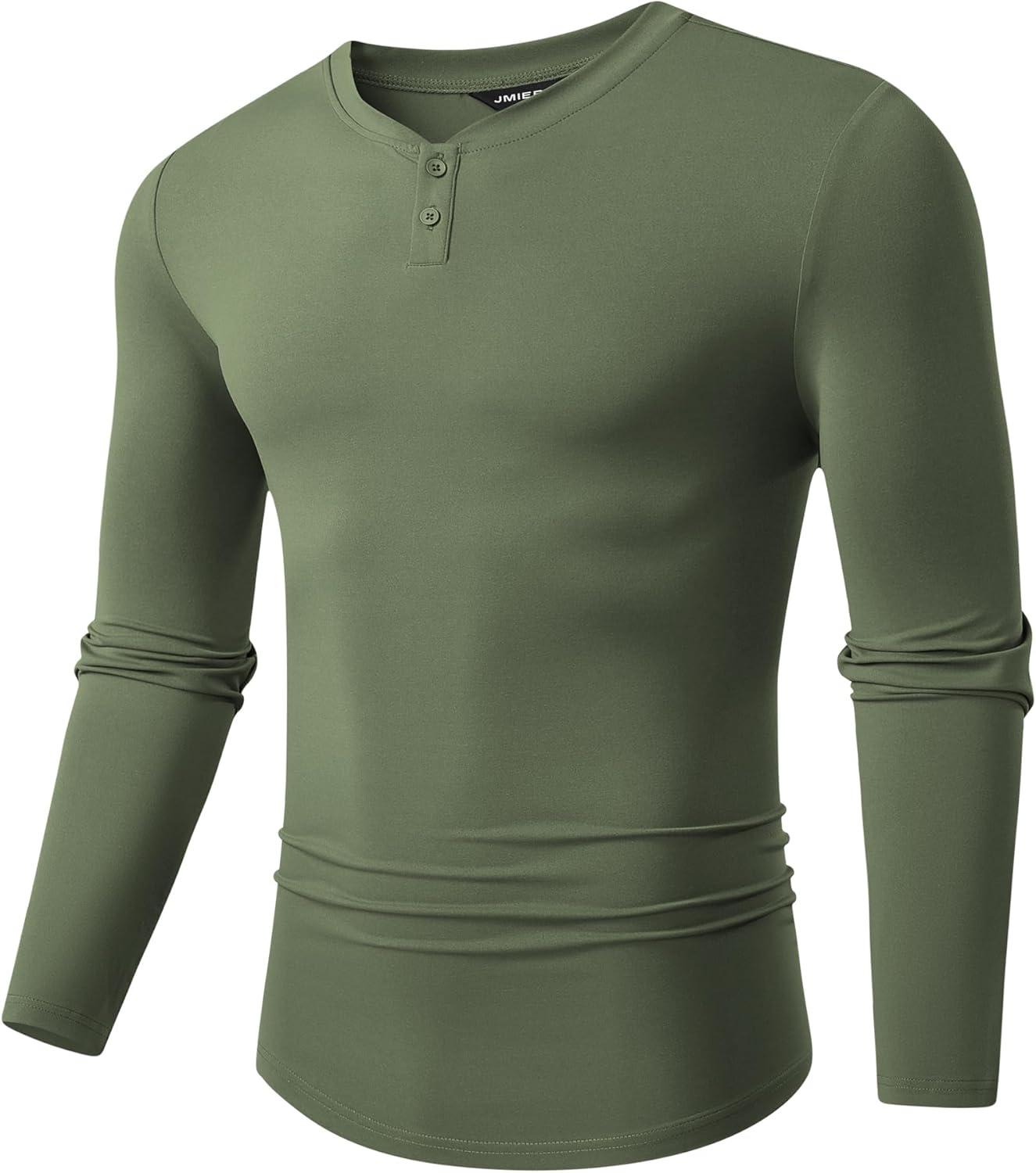 JMIERR Mens Muscle Slim Henley Shirt Button V-Neck Long Sleeve Gym Workout Athletic T Shirts(Green)