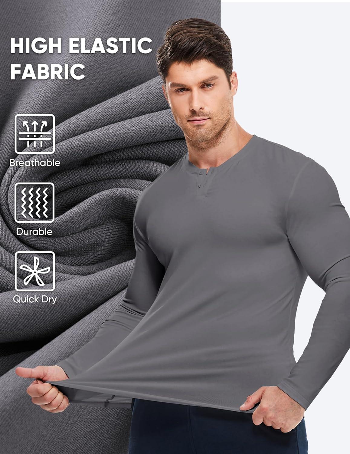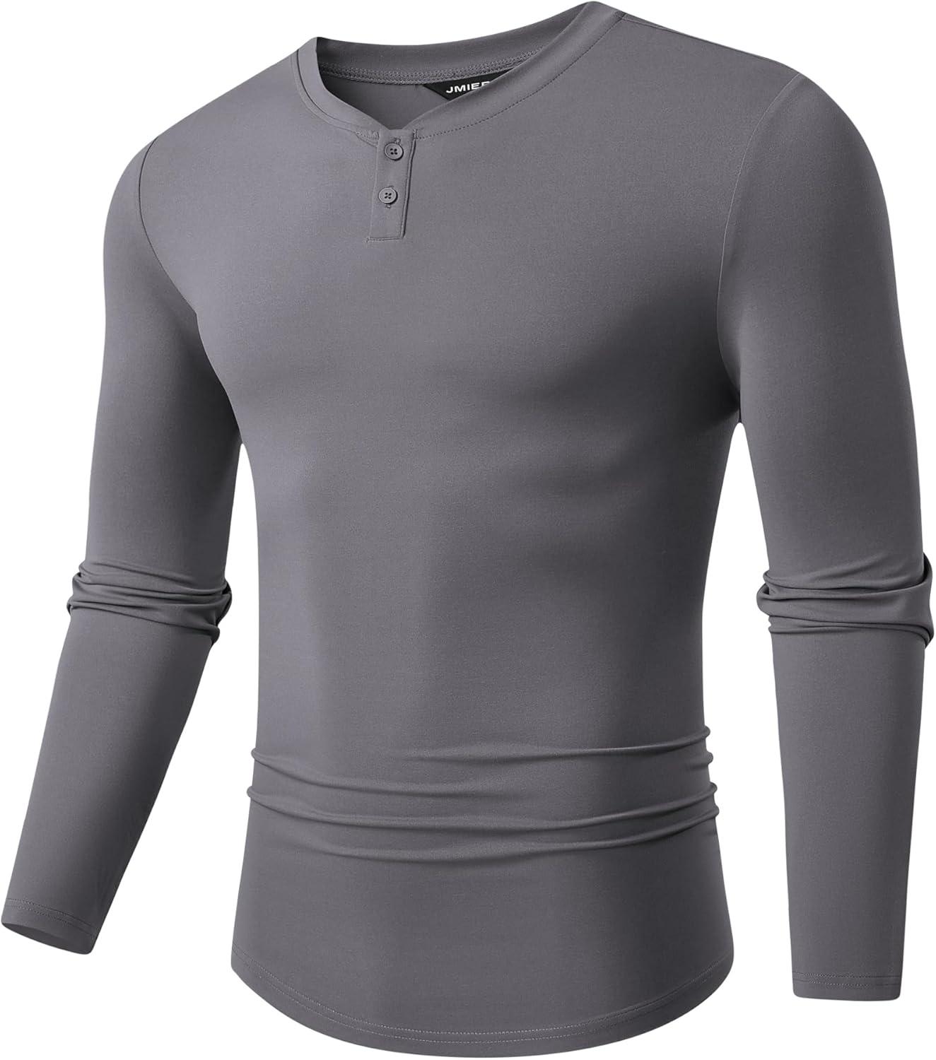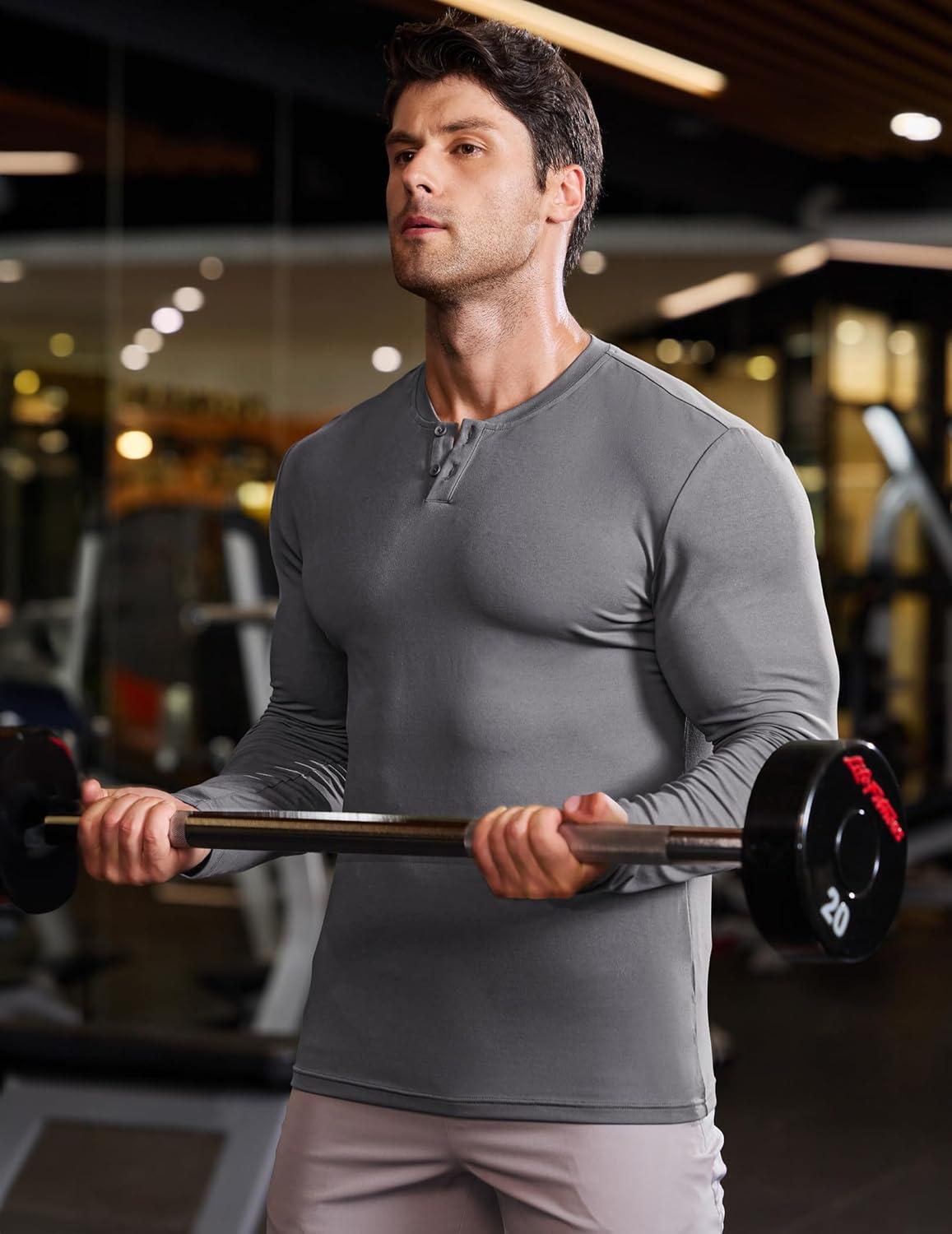 JMIERR Mens Muscle Slim Henley Shirt Button V-Neck Long Sleeve Gym Workout Athletic T Shirts(Grey)