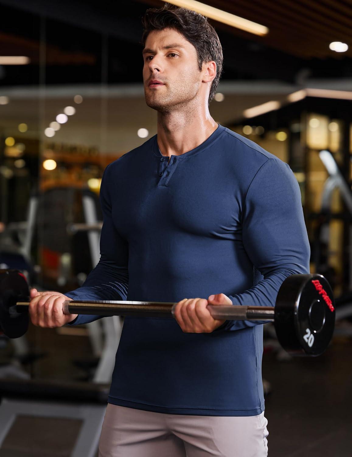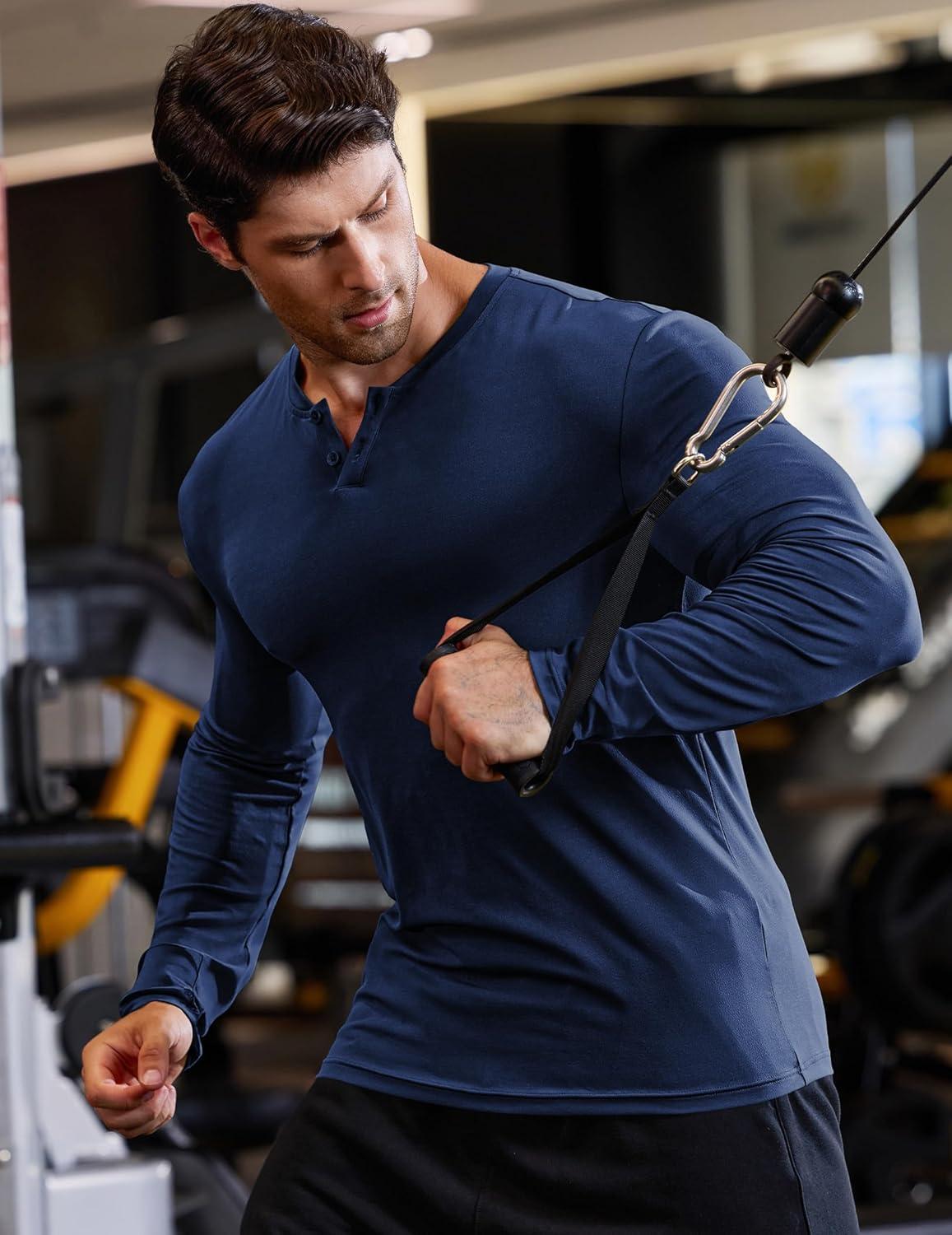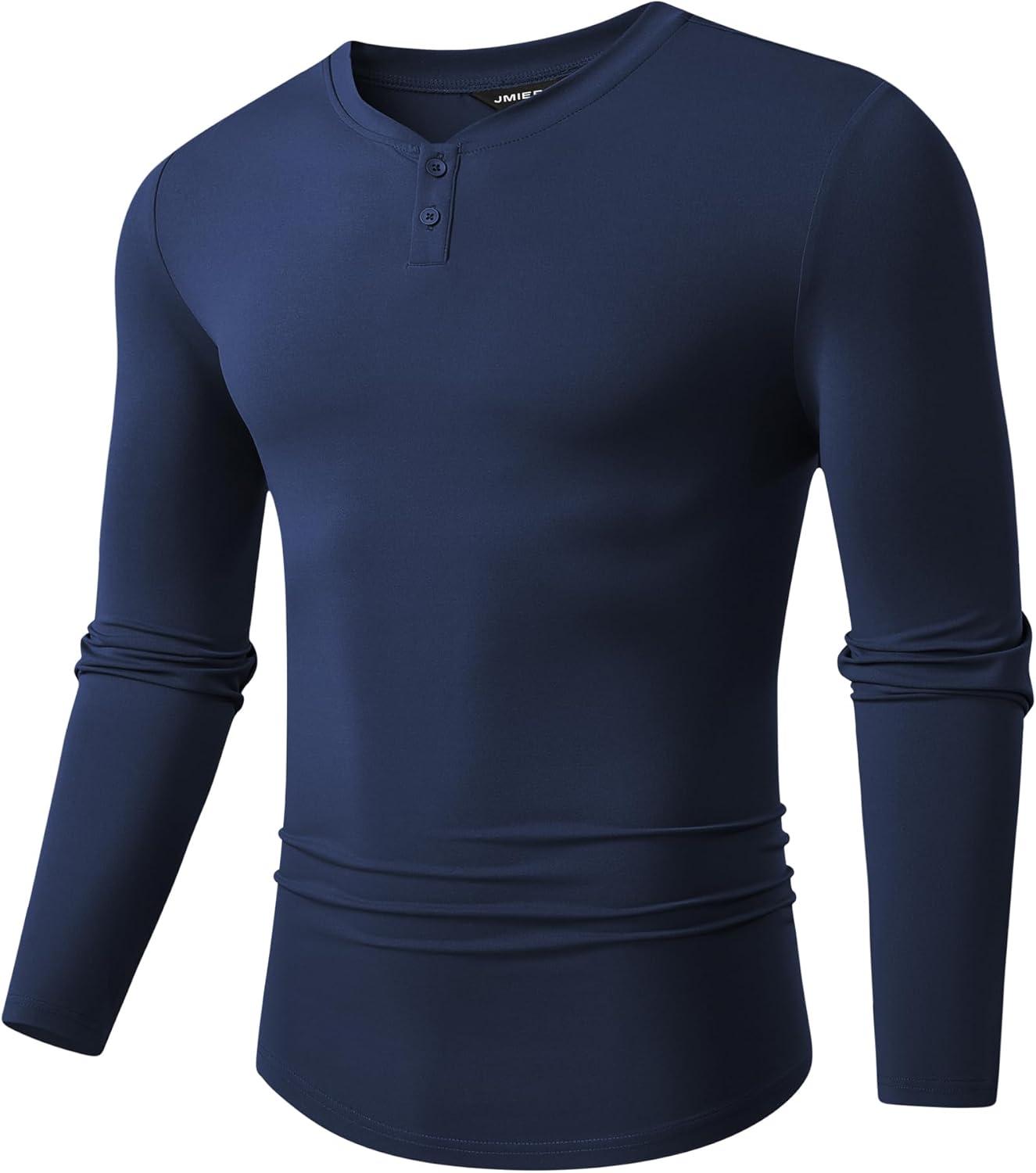 JMIERR Mens Muscle Slim Henley Shirt Button V-Neck Long Sleeve Gym Workout Athletic T Shirts(Navy Blue)