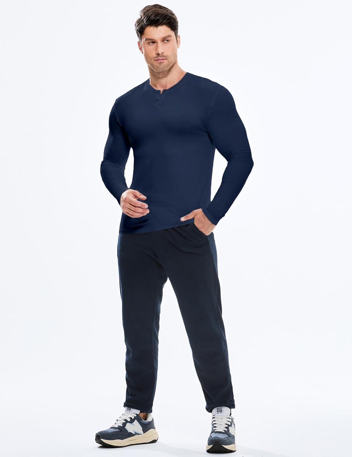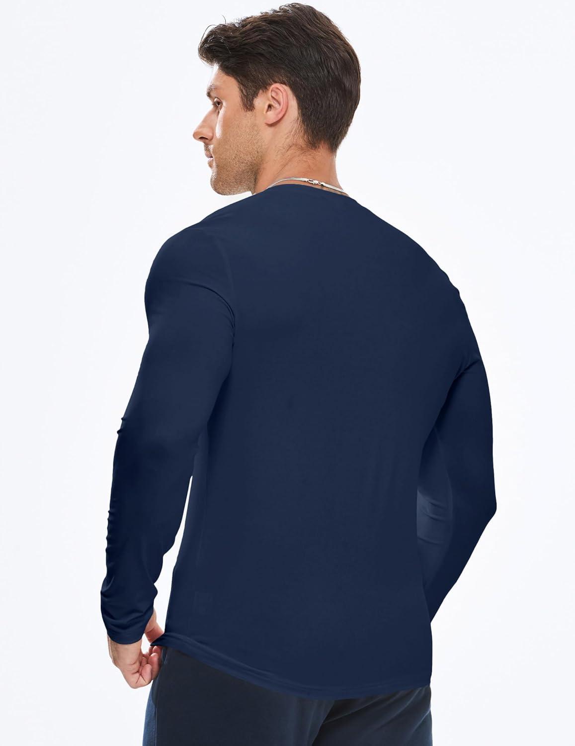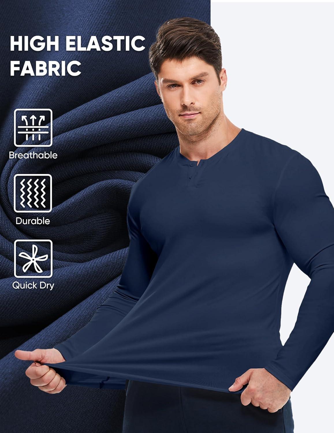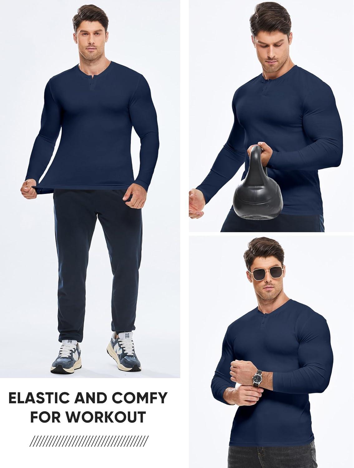 JMIERR Mens Muscle Slim Henley Shirt Button V-Neck Long Sleeve Gym Workout Athletic T Shirts(Navy Blue)