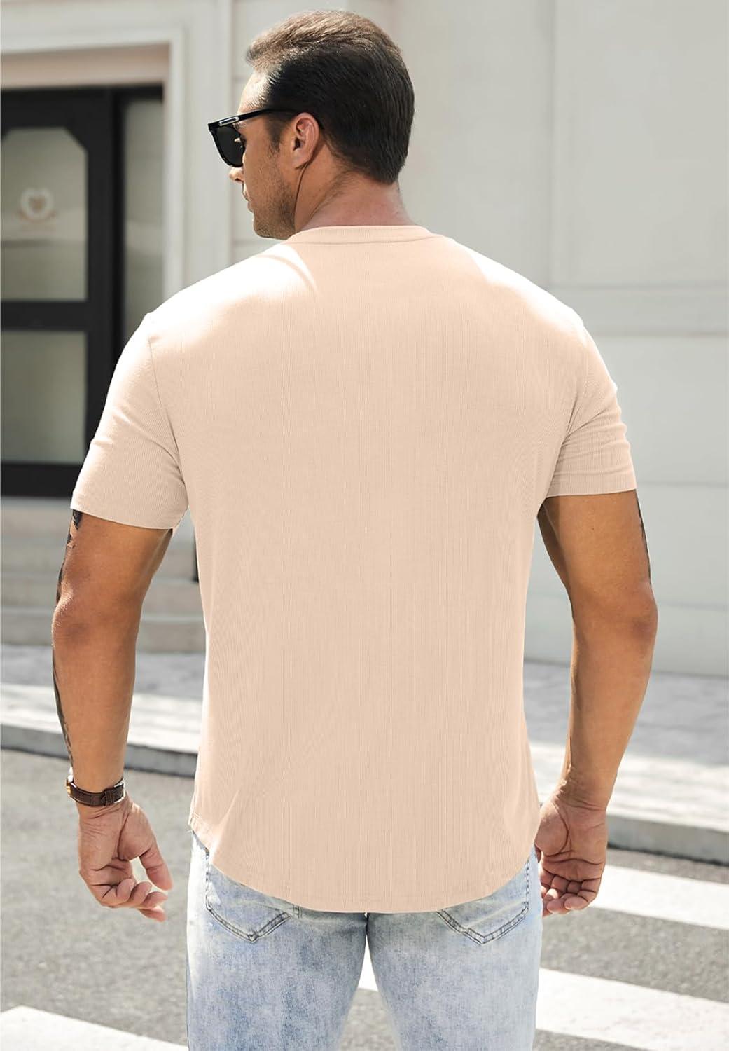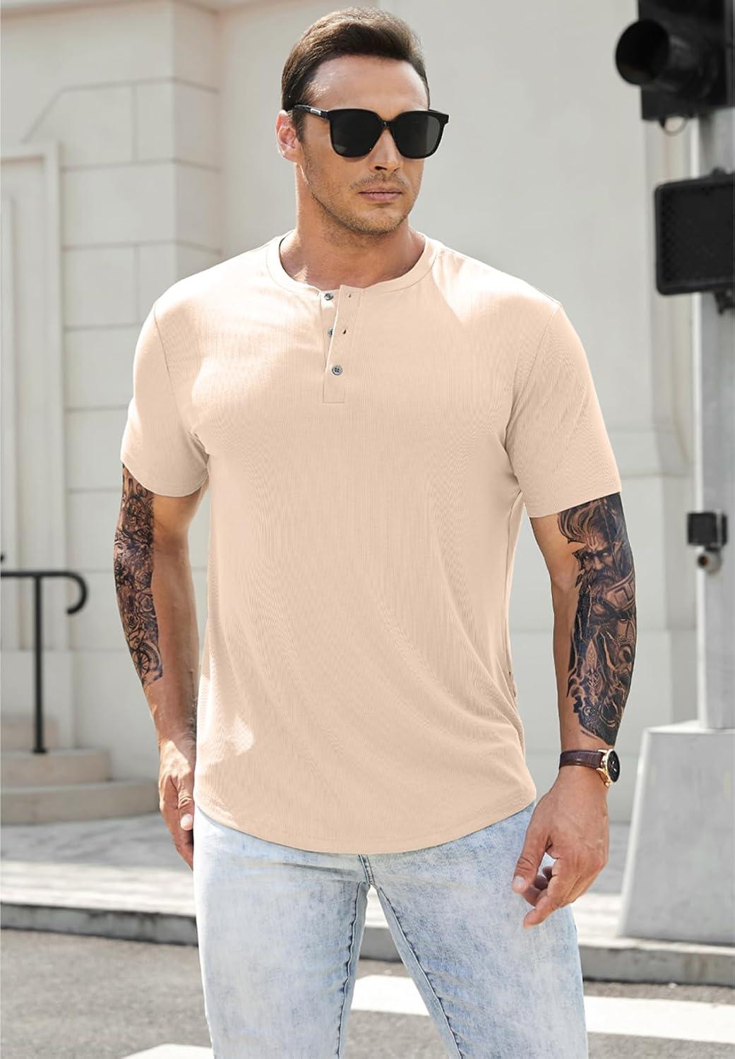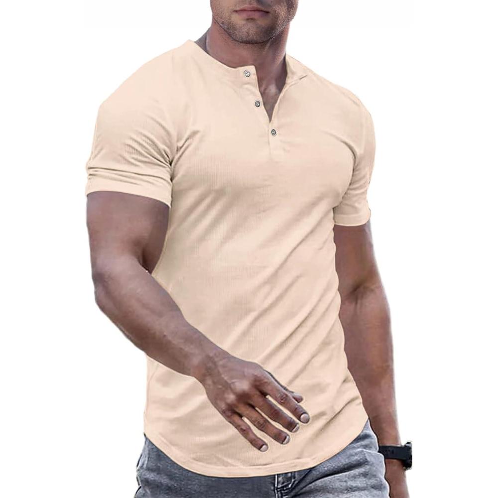 JMIERR Men’s Muscle Slim Henley Shirts Crewneck Longline T-Shirt Gym Workout Athletic Shirt Tees with Button(A Apricot)