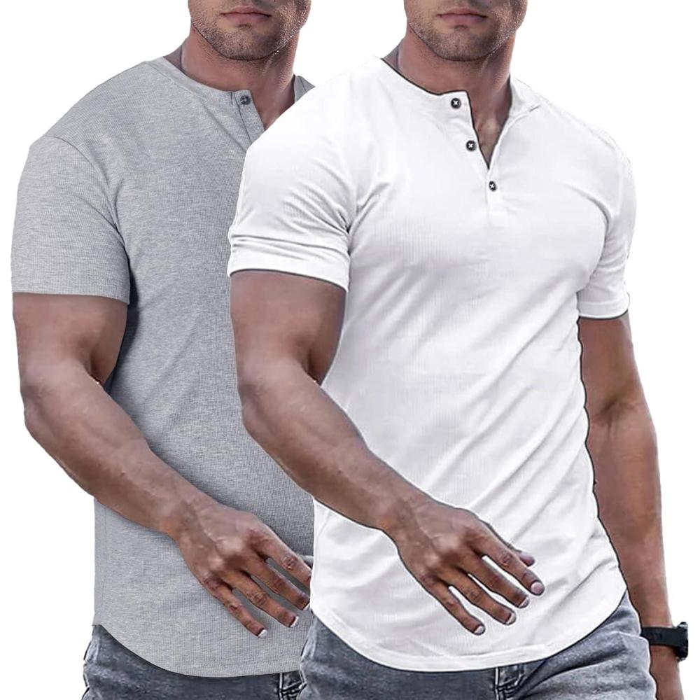 JMIERR Men’s Muscle Slim Henley Shirts Crewneck Longline T-Shirt Gym Workout Athletic Shirt Tees with Button(Pack-white/Grey)