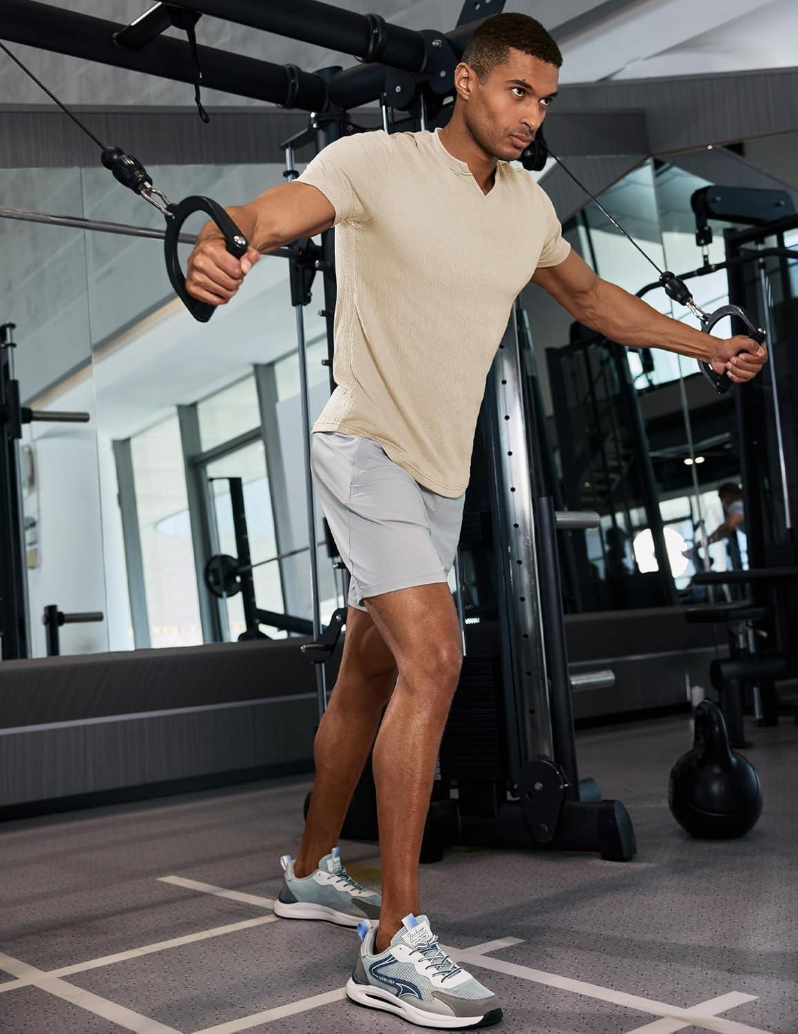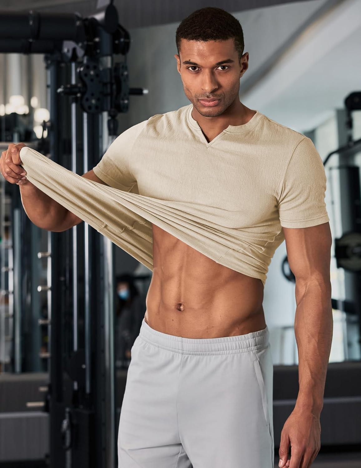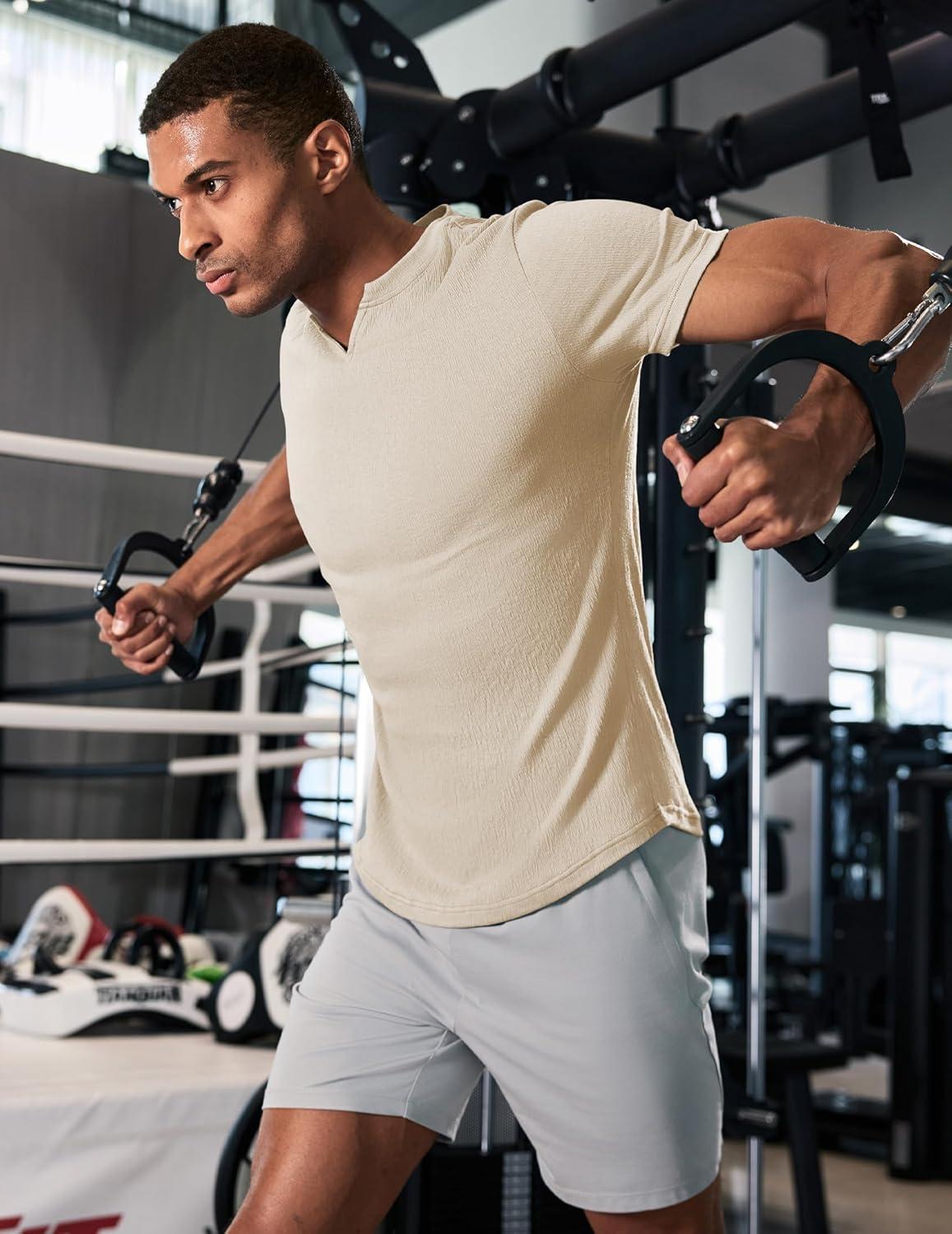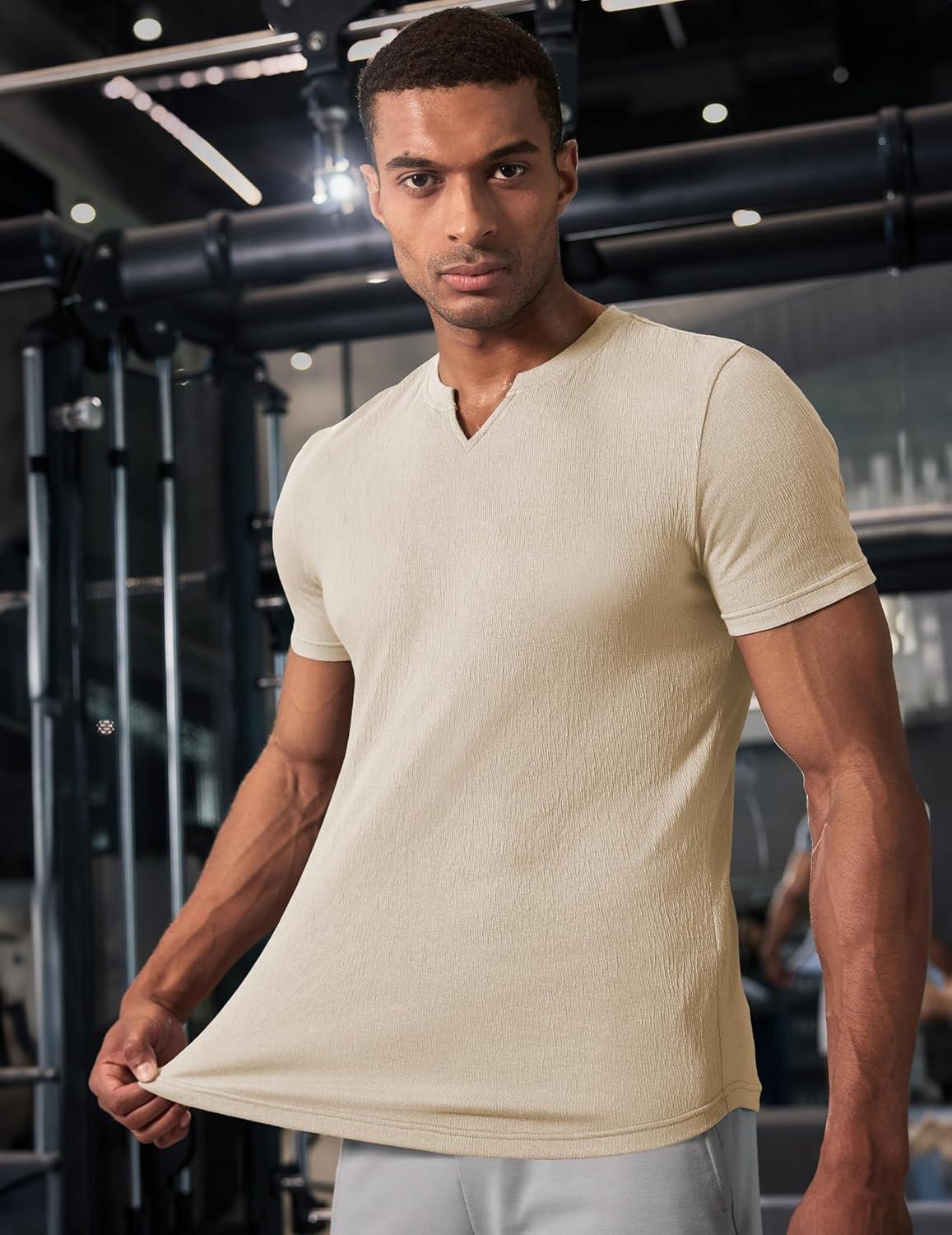 JMIERR Mens Muscle Slim T Shirt Texture V Neck Longline Henley Gym Workout Athletic Tee Shirts(Apricot)