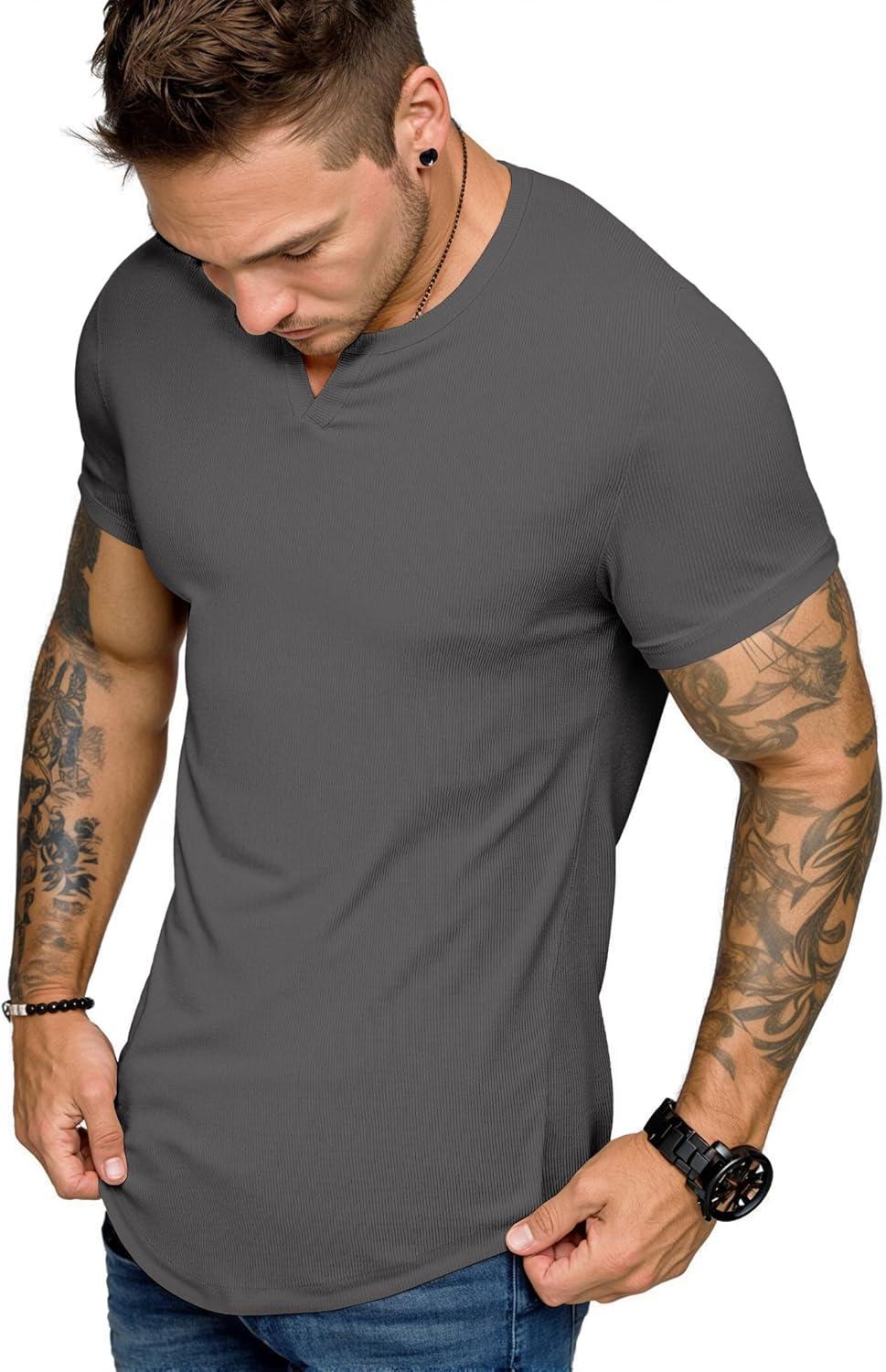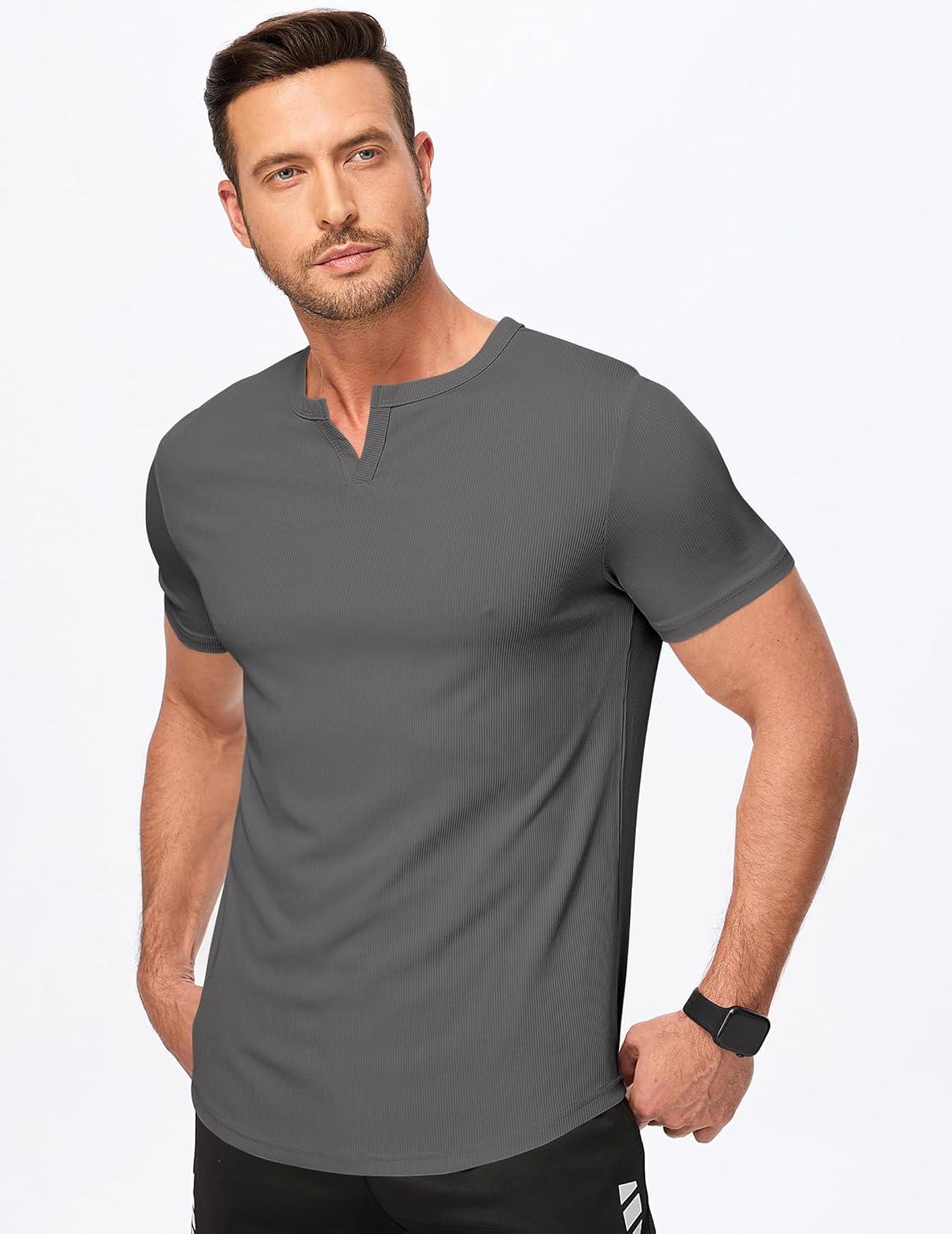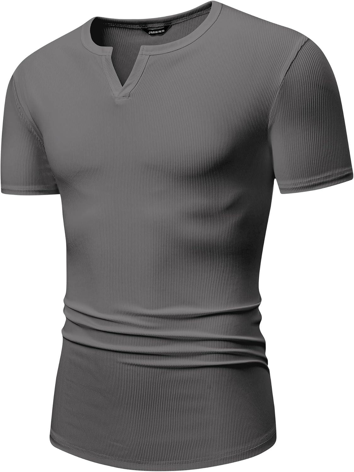 JMIERR Men’s Muscle V-Neck T Shirt Short Sleeve Longline Ribbed Henley Shirt Gym Workout Athletic Tee Shirts(Grey)