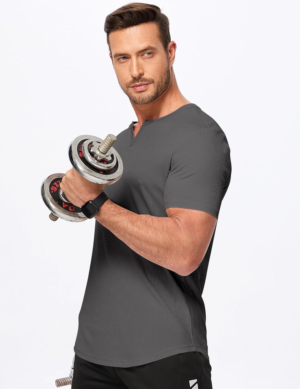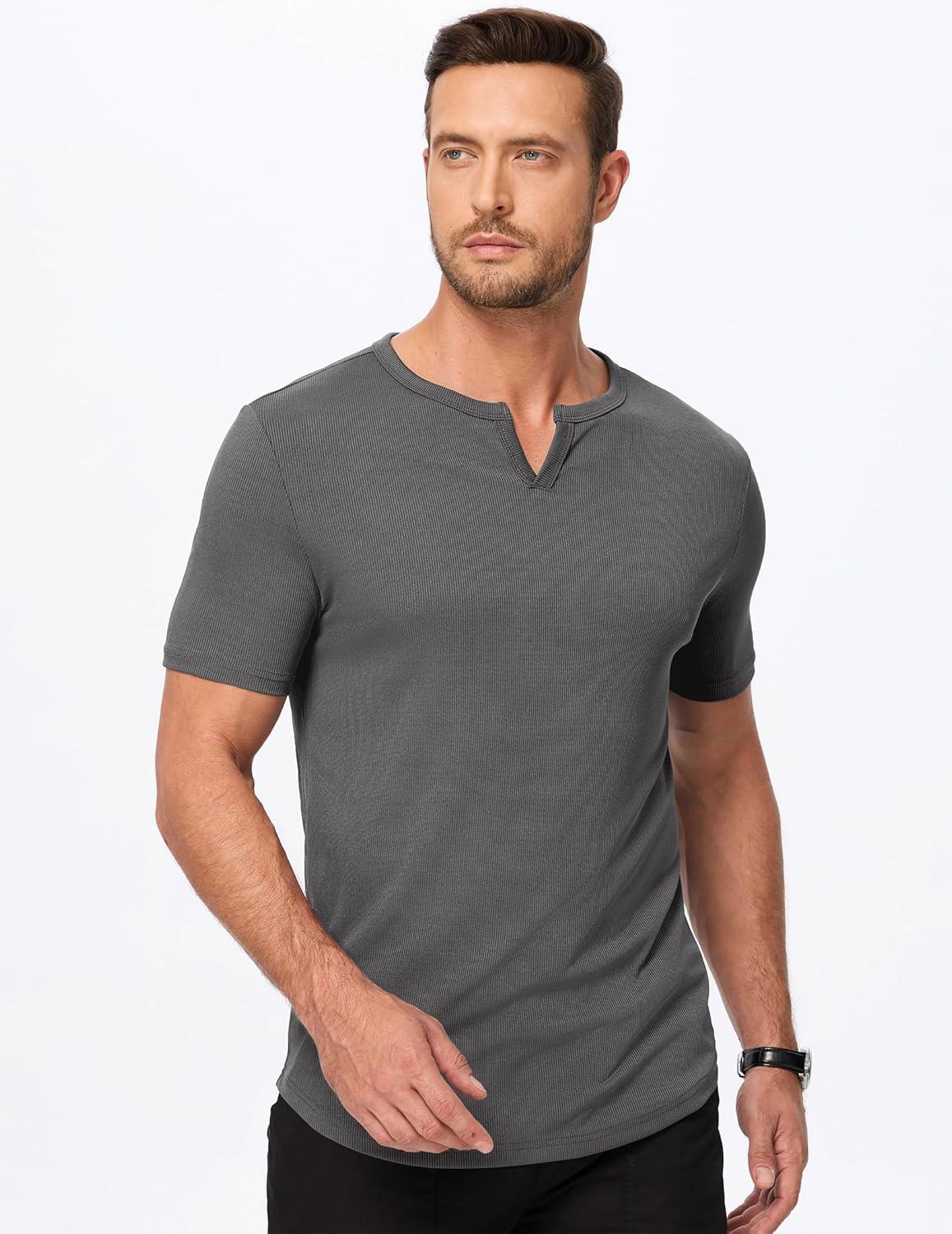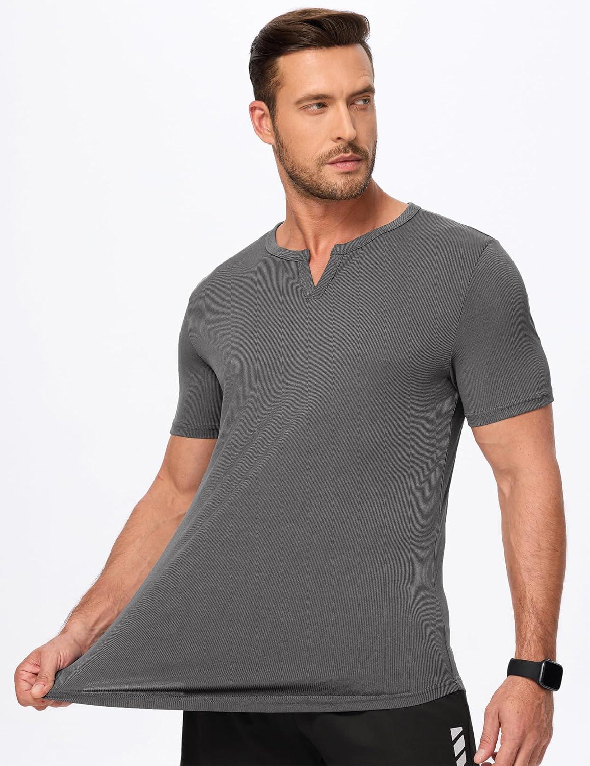 JMIERR Men’s Muscle V-Neck T Shirt Short Sleeve Longline Ribbed Henley Shirt Gym Workout Athletic Tee Shirts(Grey)