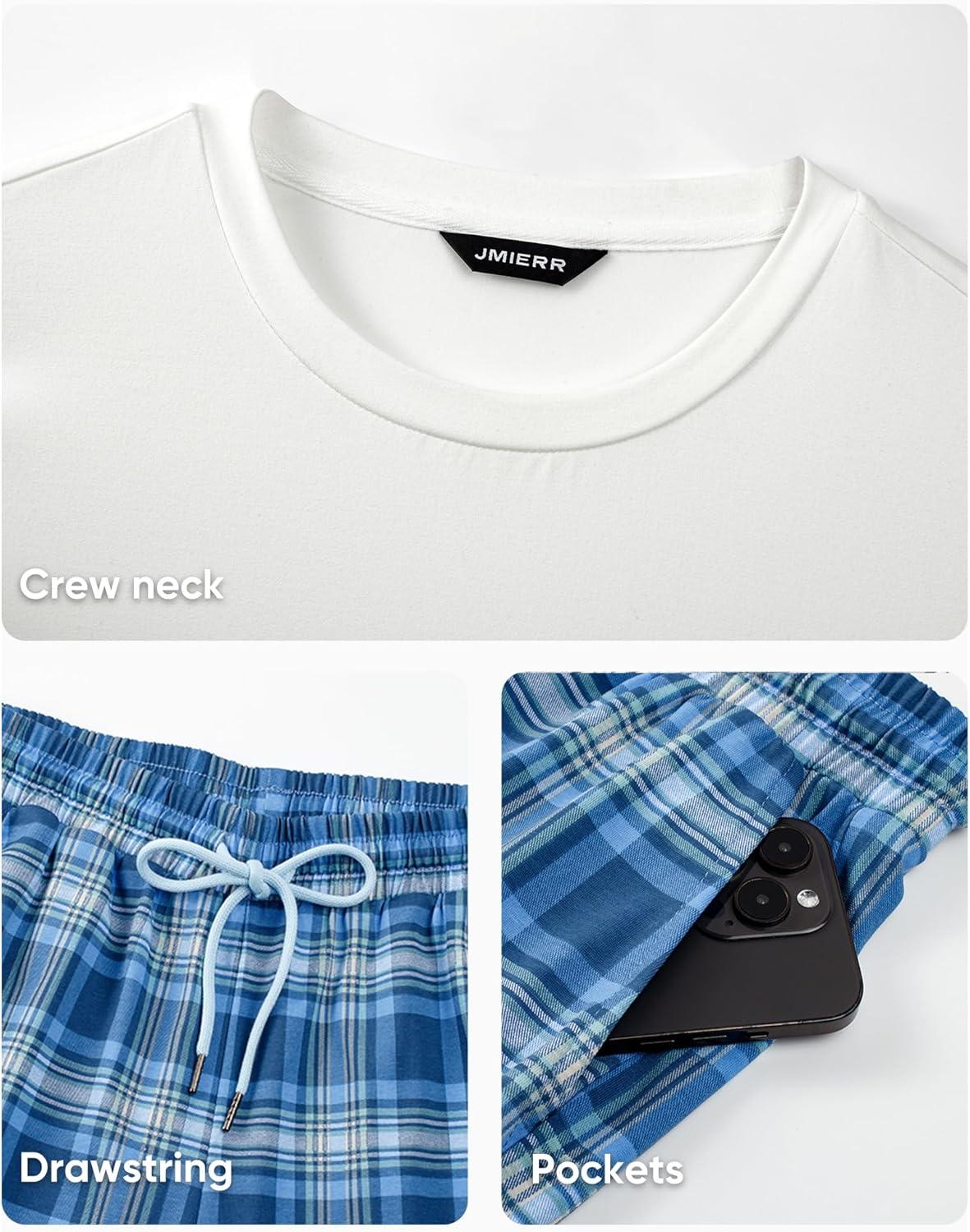 JMIERR Men’s Pajamas Set 2 Piece Long Sleeve T-Shirt Loungewear Long Plaid Pants with Pocket(Sky Blue)