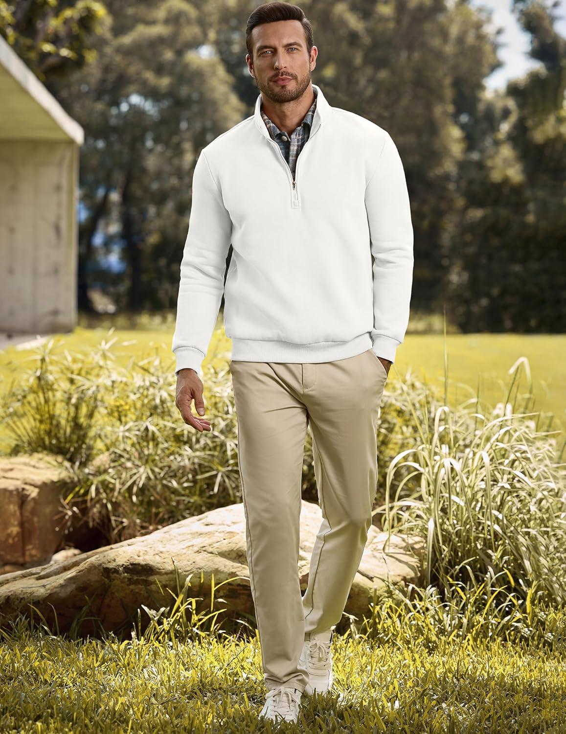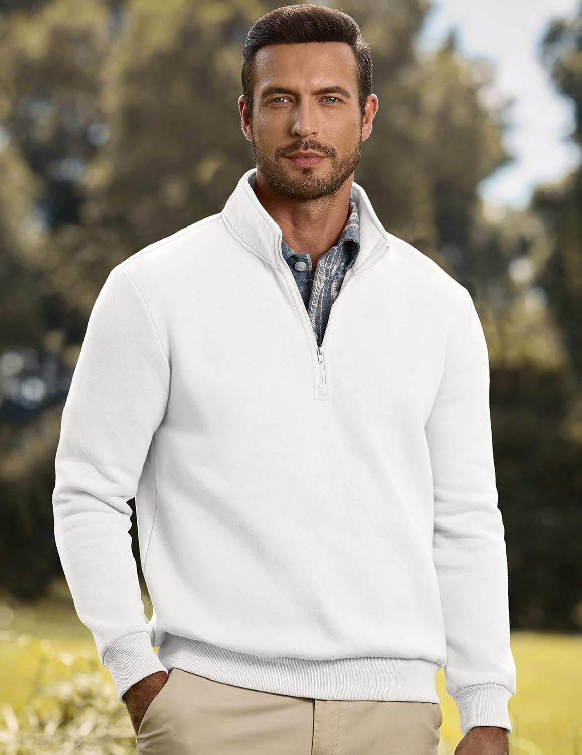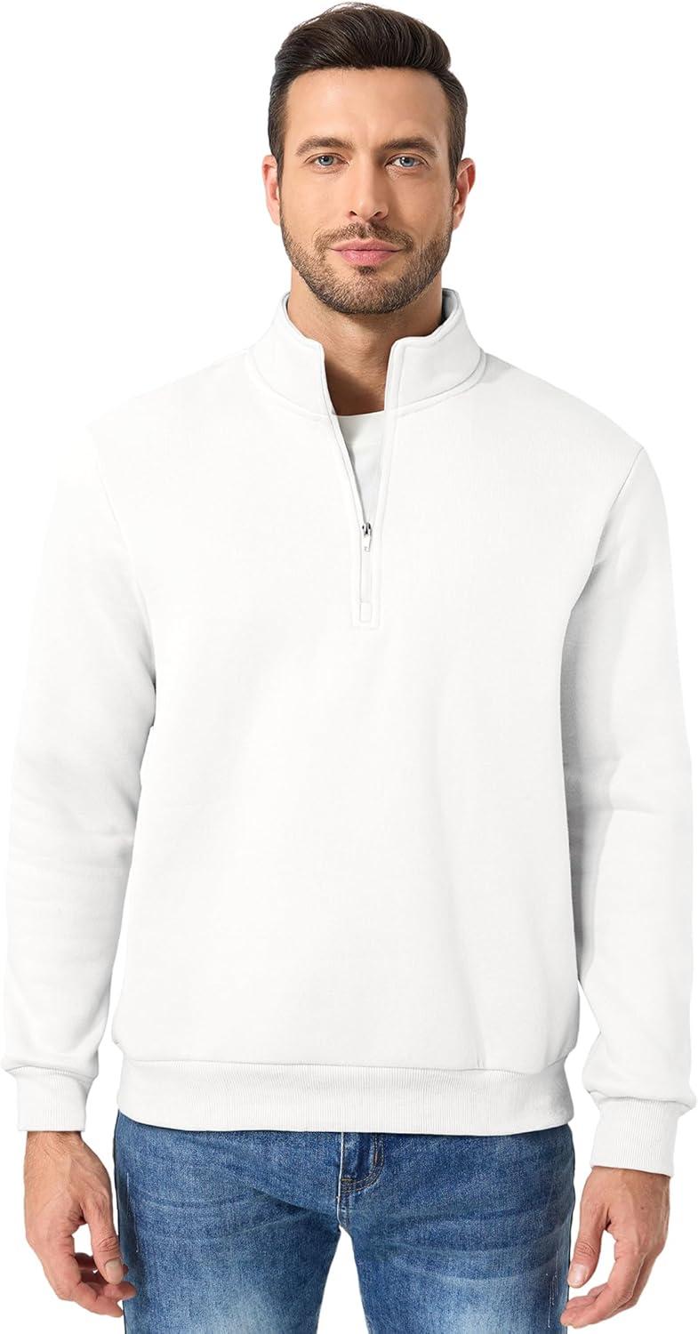 JMIERR Mens Quarter Zip Pullover Polo Sweater Mock Neck Long Sleeve Lightweight Fleece Sweatshirts(White)
