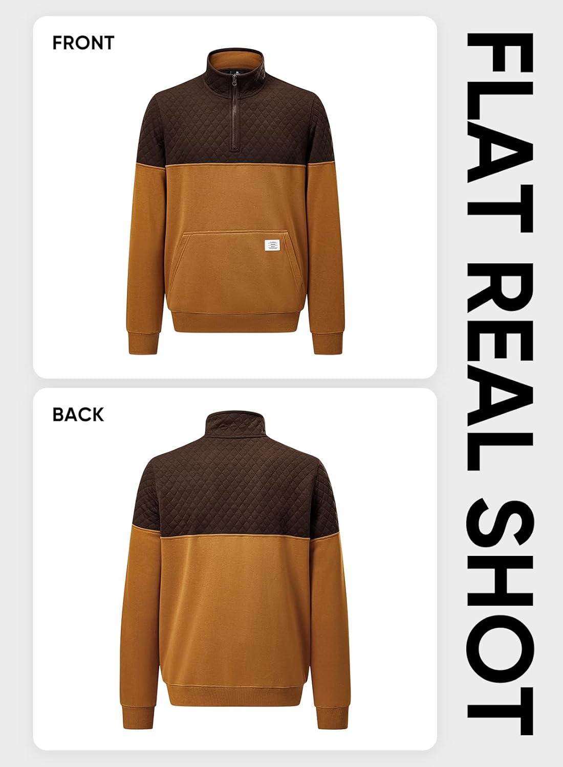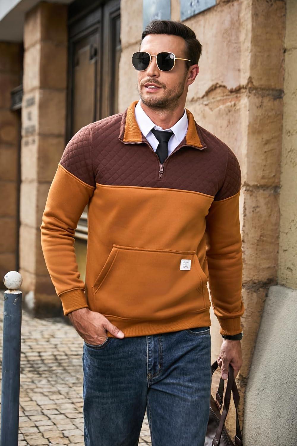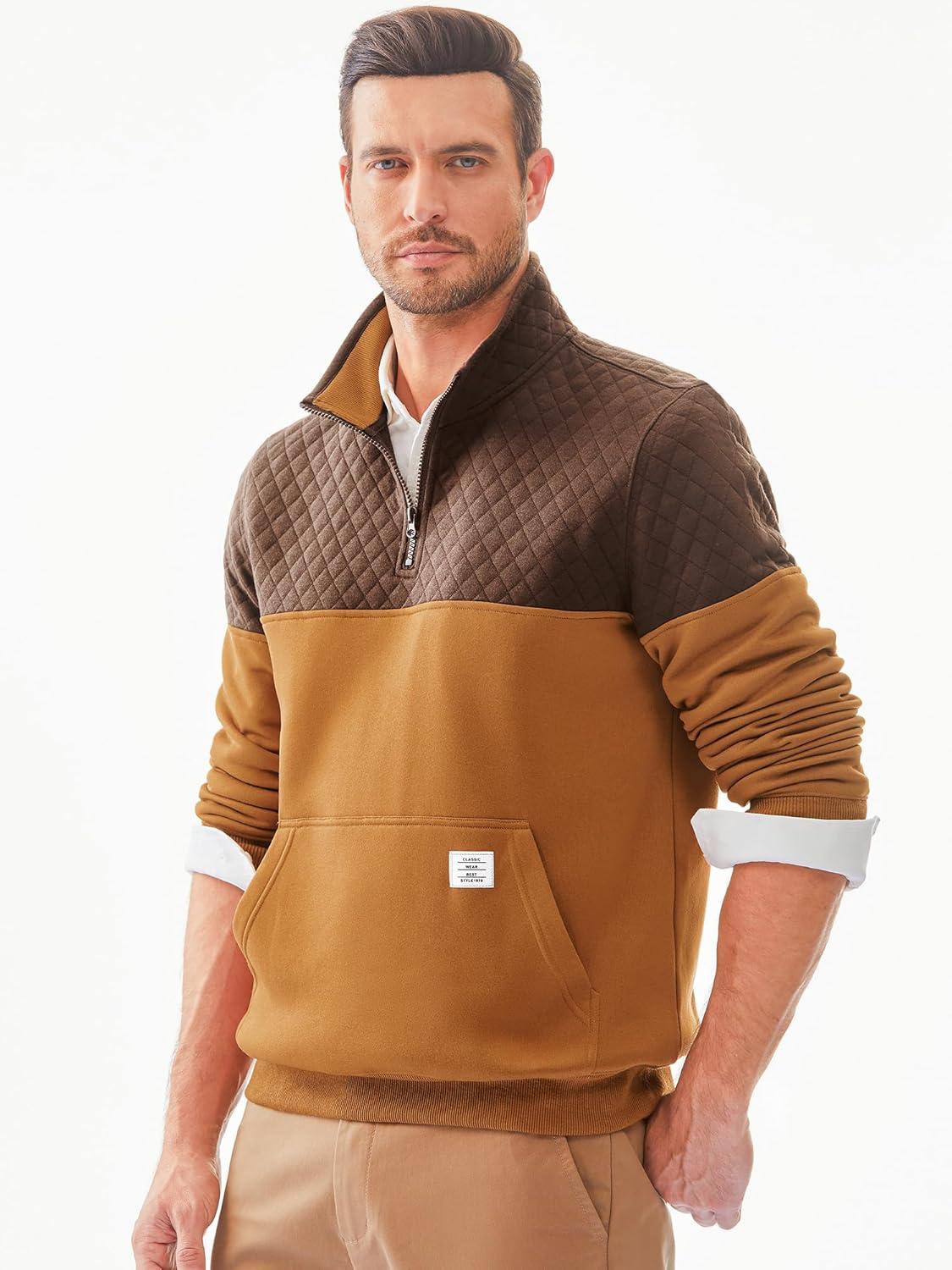 JMIERR Men’s Quarter Zip Pullover Quilted Sweatshirt Pullover Long Sleeve Stand Collar Sweater Color Block Sweatshirt(04 Camel)