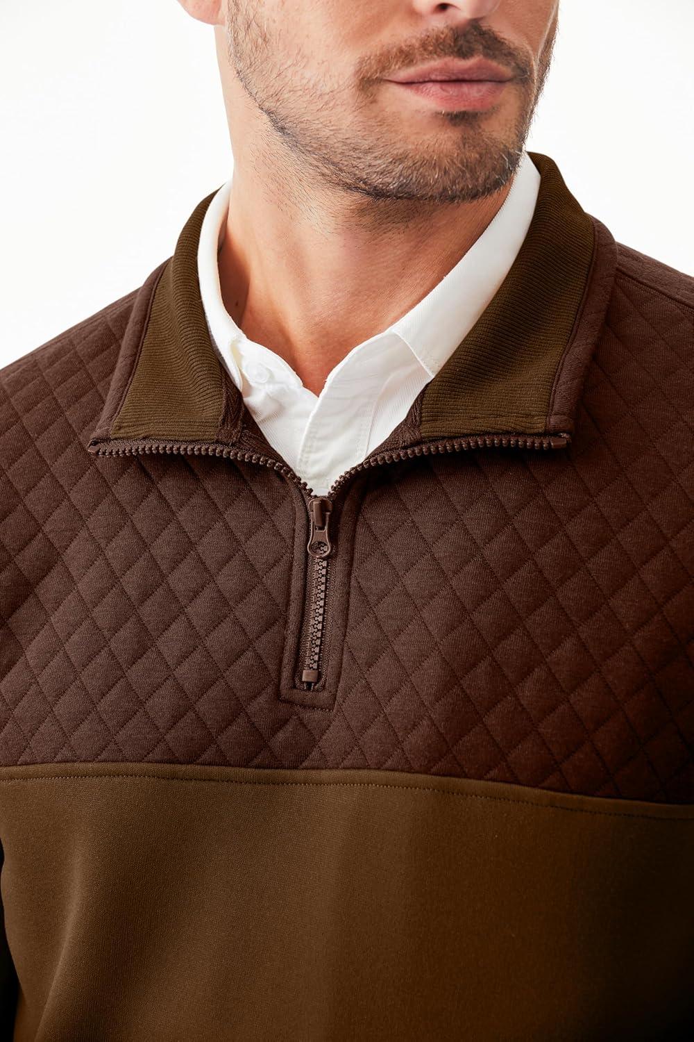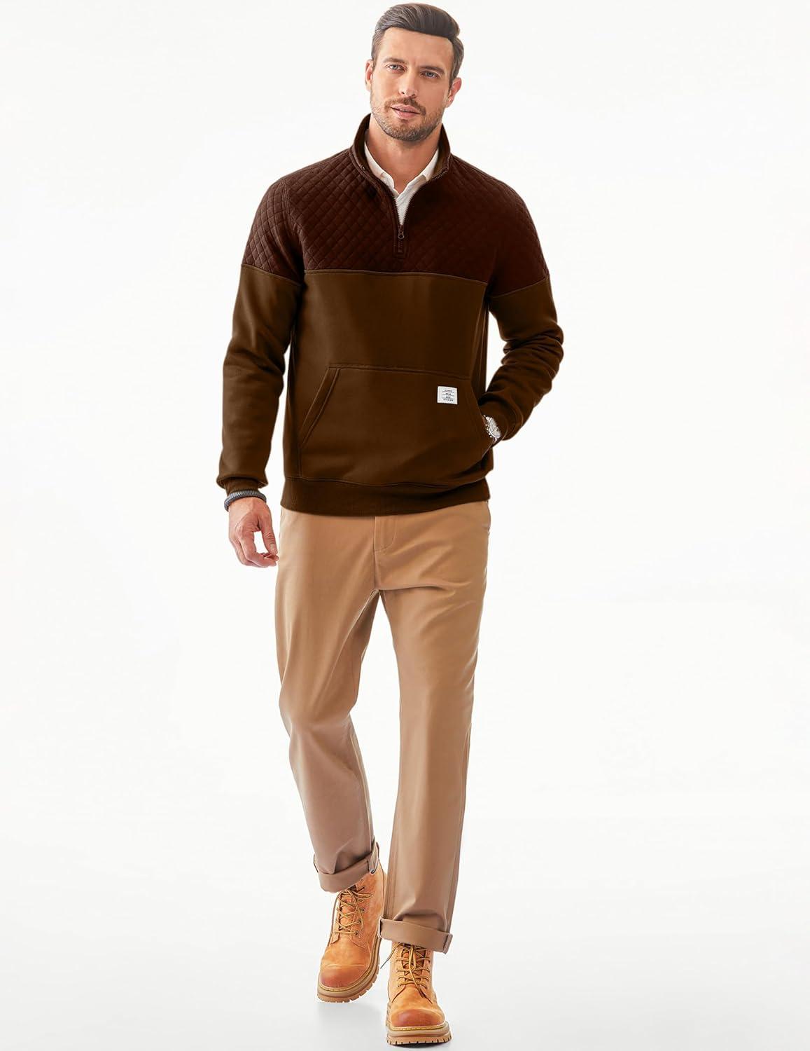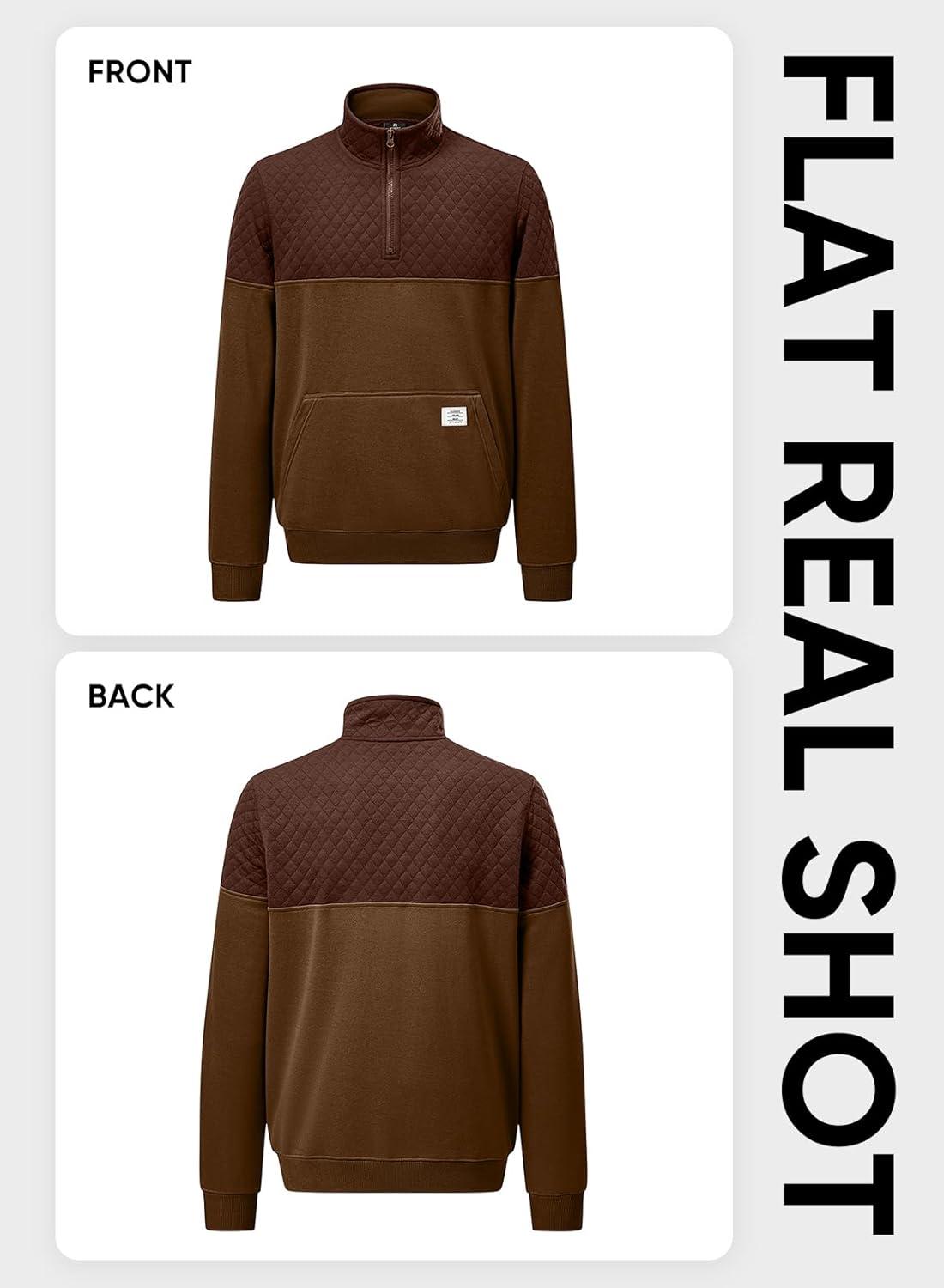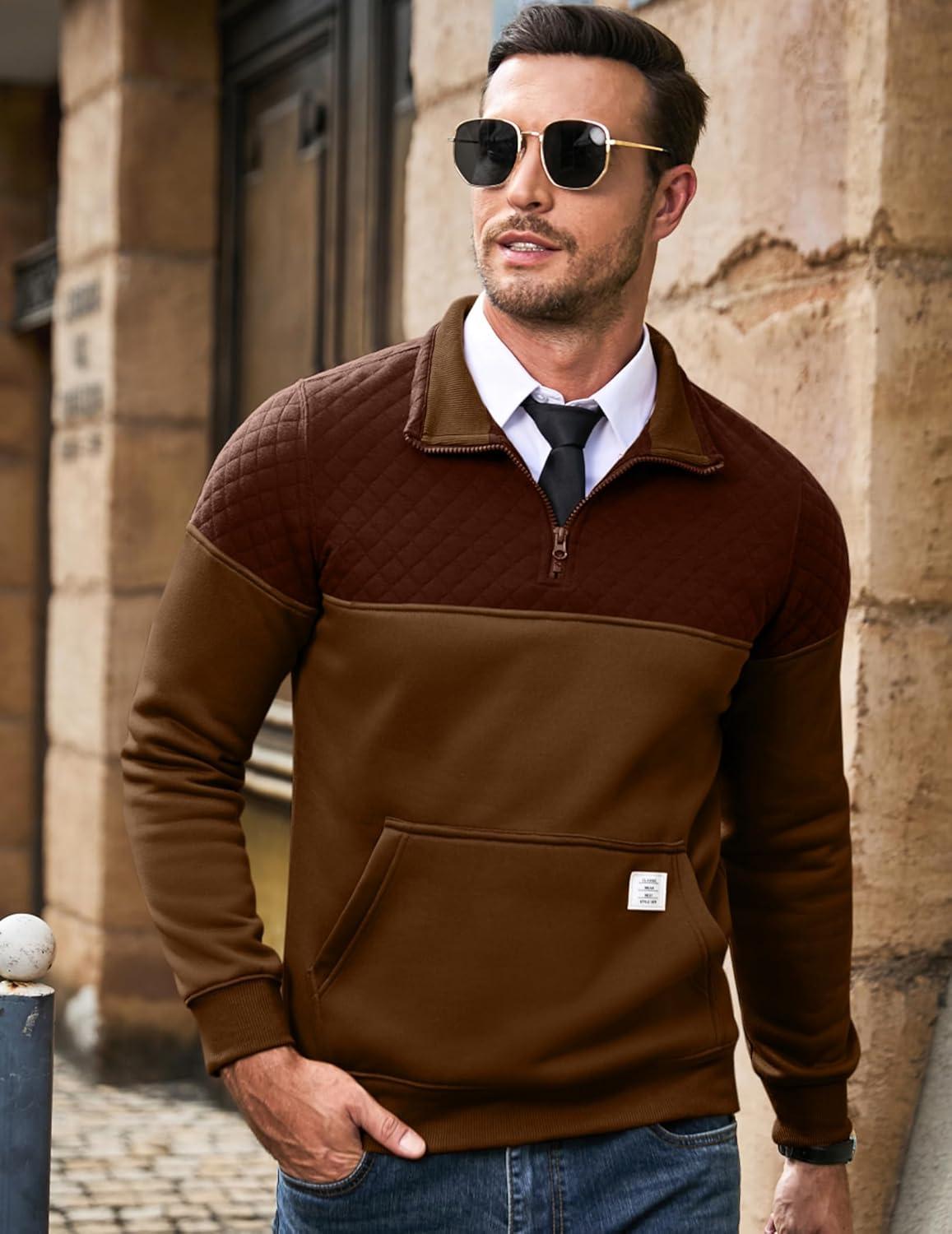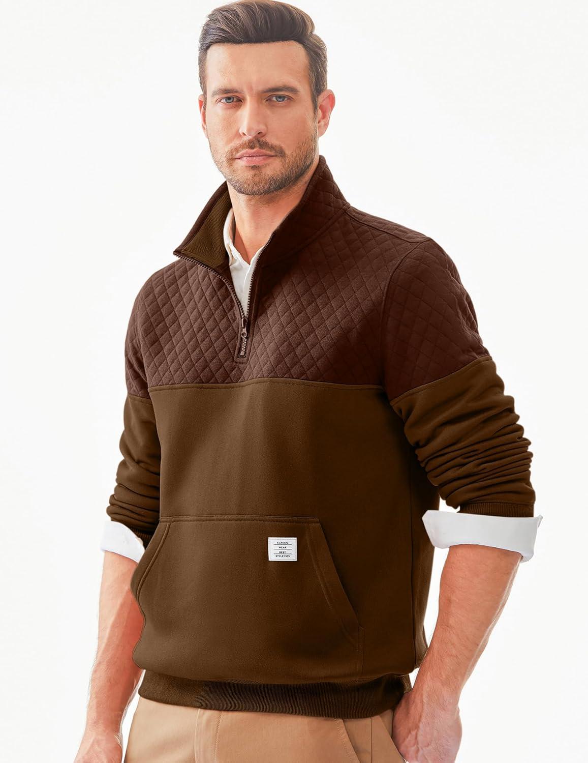JMIERR Men’s Quarter Zip Pullover Quilted Sweatshirt Pullover Long Sleeve Stand Collar Sweater Color Block Sweatshirt(Coffee)