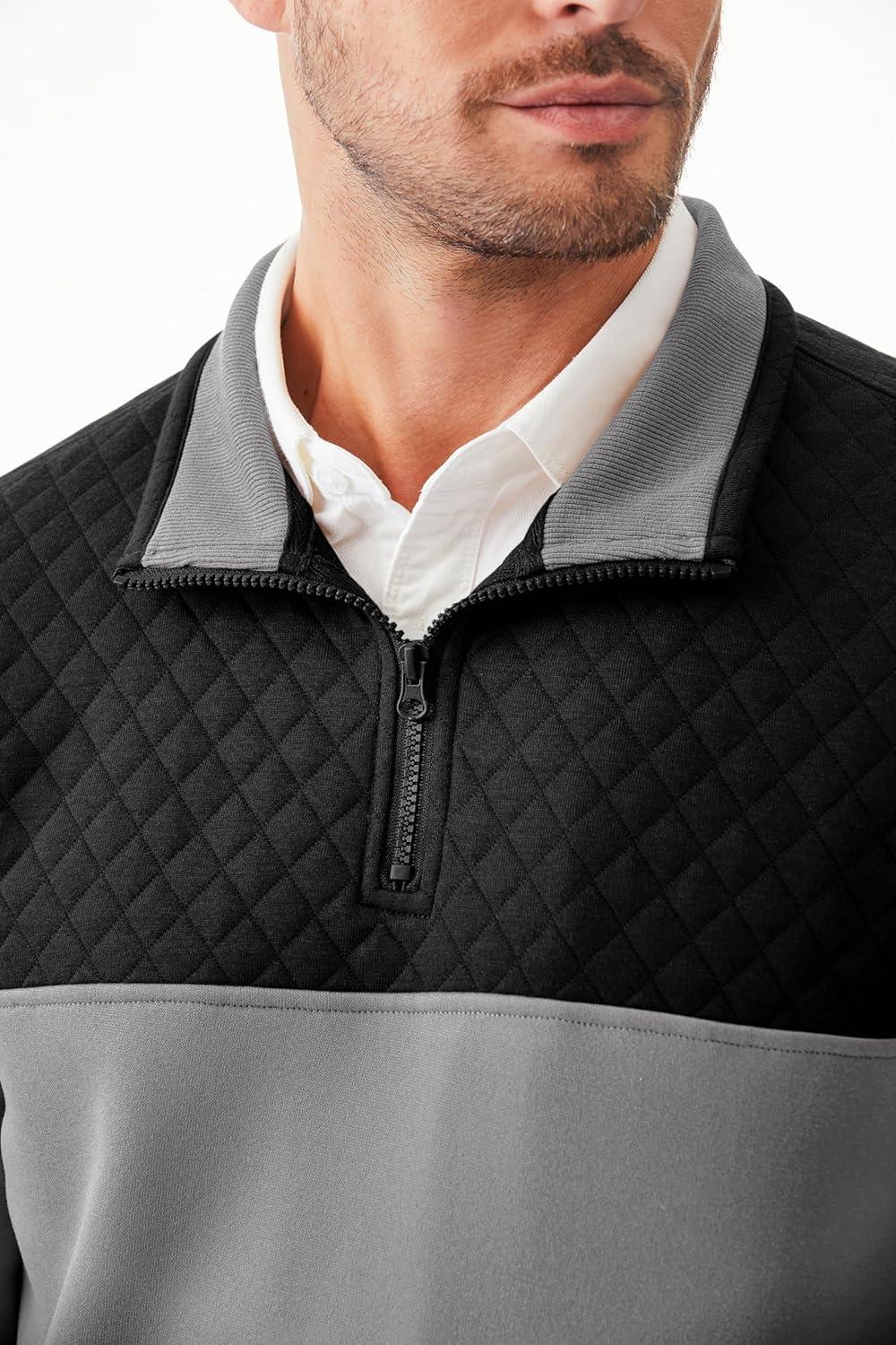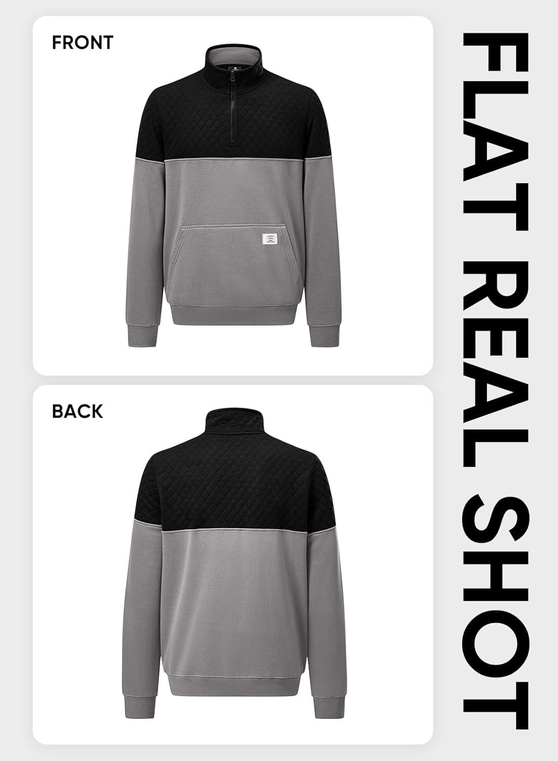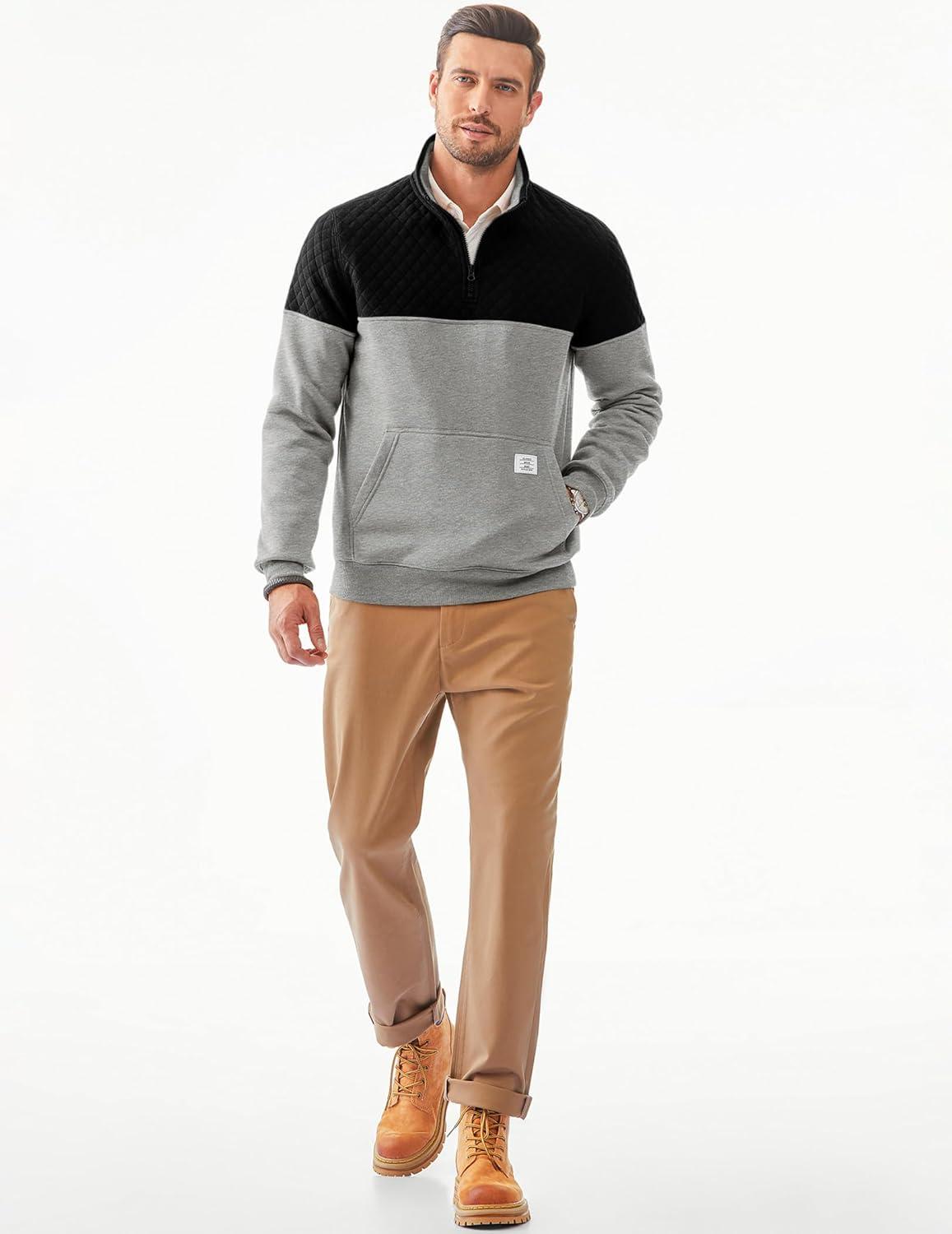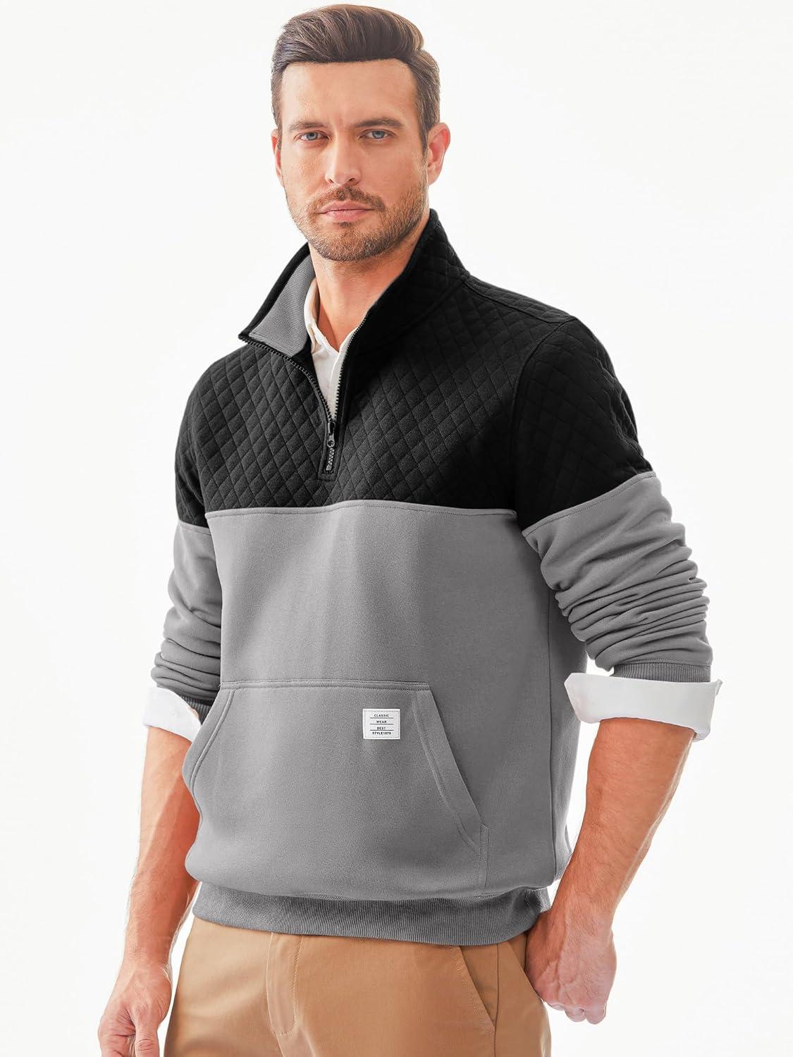 JMIERR Men’s Quarter Zip Pullover Quilted Sweatshirt Pullover Long Sleeve Stand Collar Sweater Color Block Sweatshirt(Light Grey)