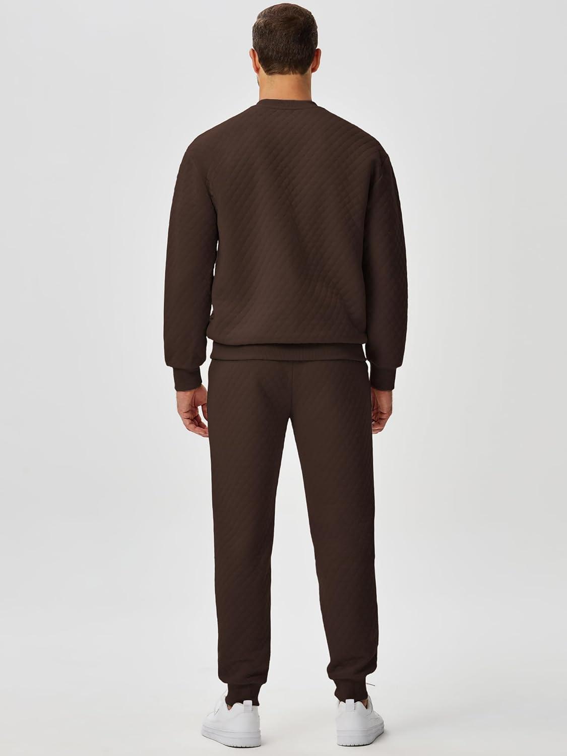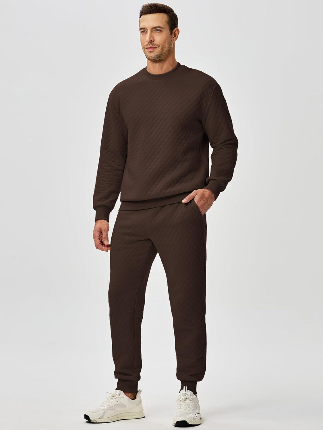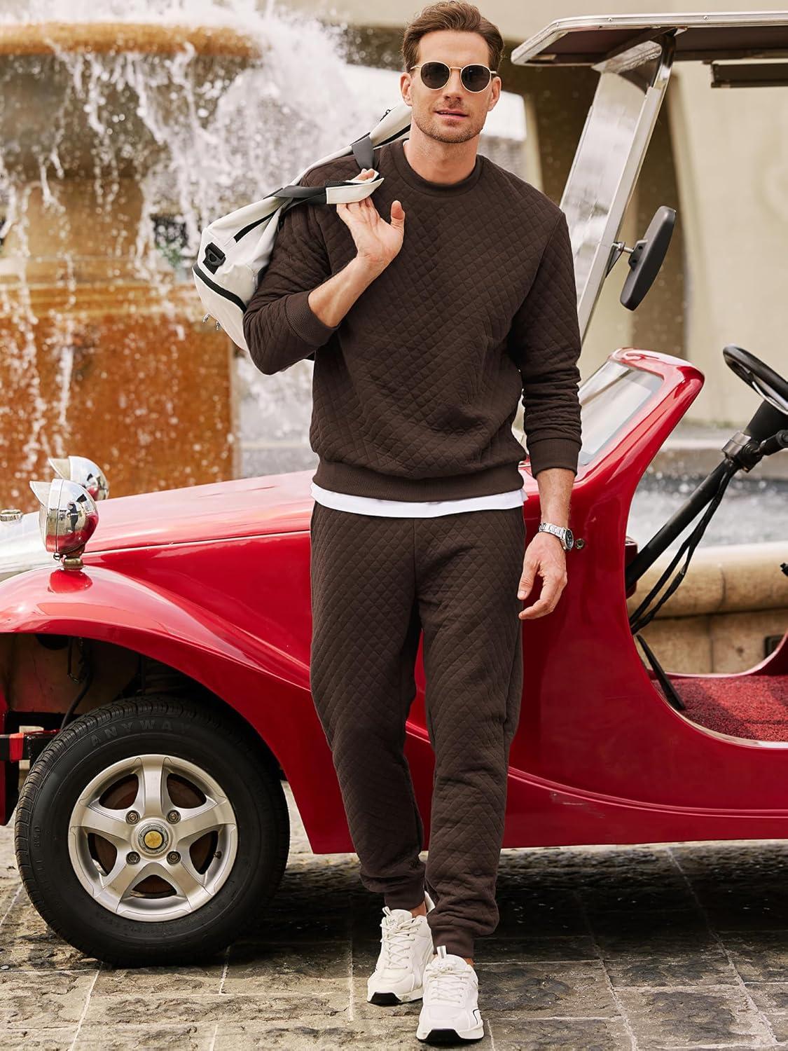 JMIERR Men’s Quilted 2 Piece Casual Outfits Crewneck Sweatshirt Tracksuit & Joggers Sweatpants Sweatsuit Set(Coffee)