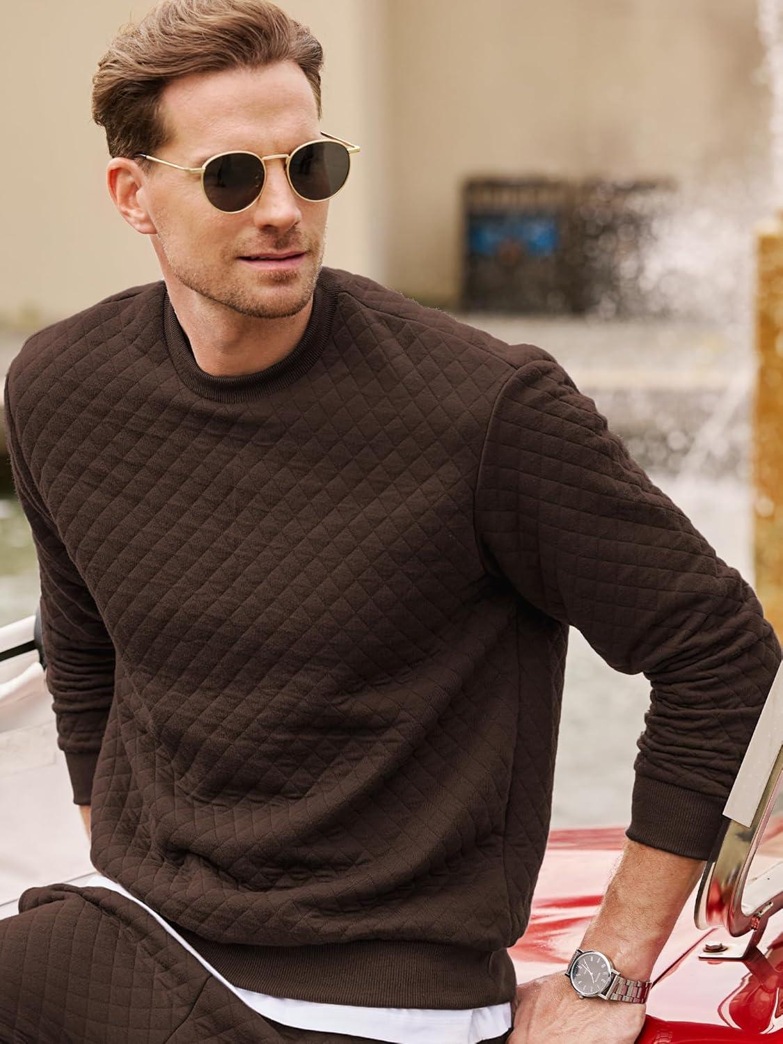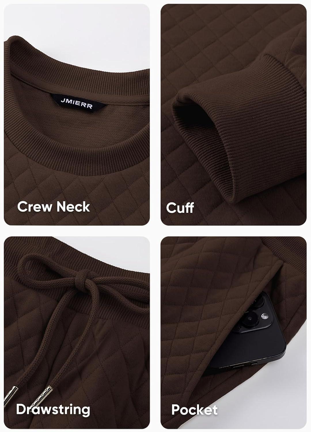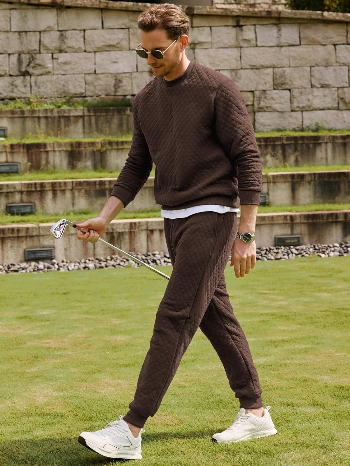 JMIERR Men’s Quilted 2 Piece Casual Outfits Crewneck Sweatshirt Tracksuit & Joggers Sweatpants Sweatsuit Set(Coffee)