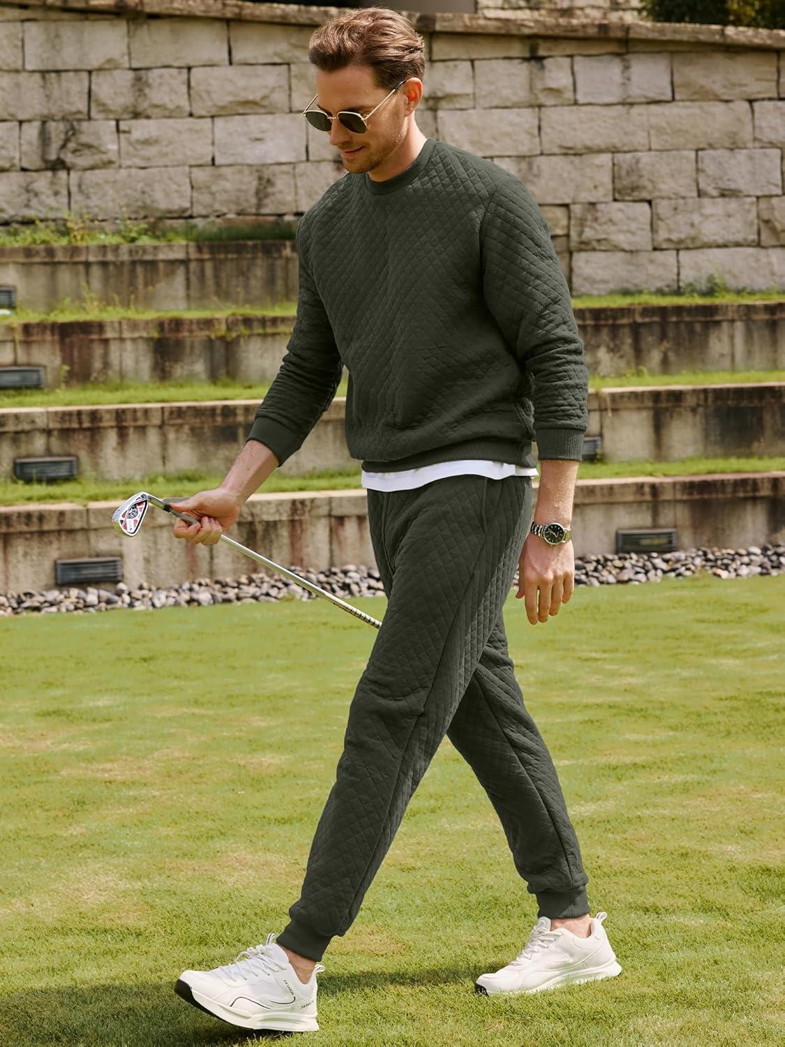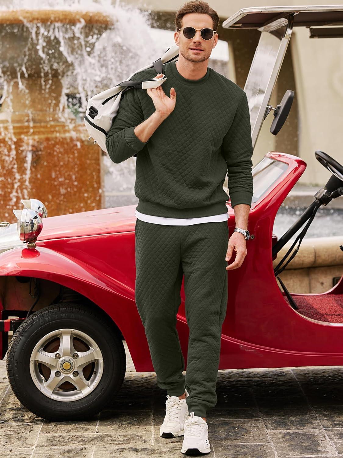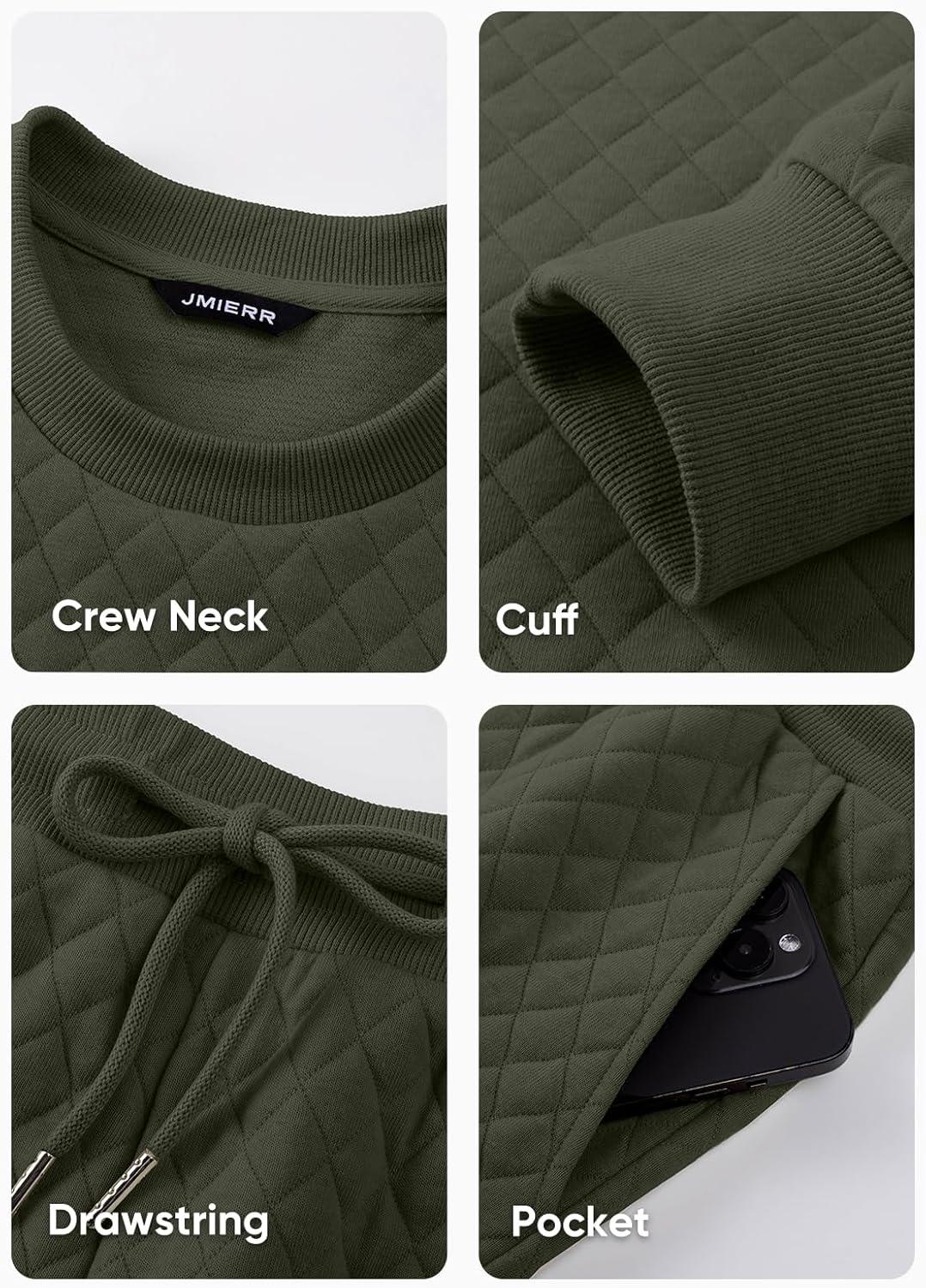 JMIERR Men’s Quilted 2 Piece Casual Outfits Crewneck Sweatshirt Tracksuit & Joggers Sweatpants Sweatsuit Set(Moss Green)
