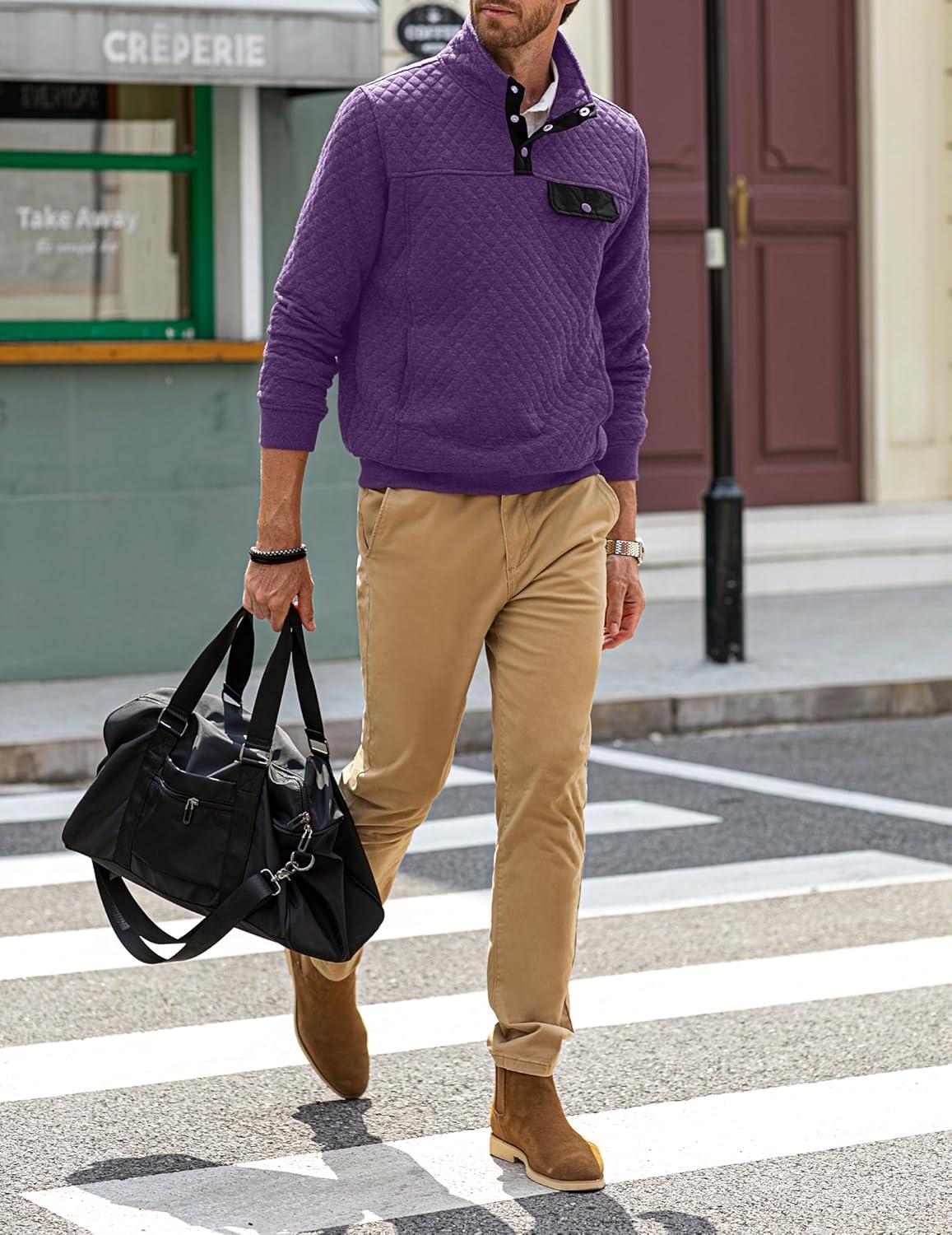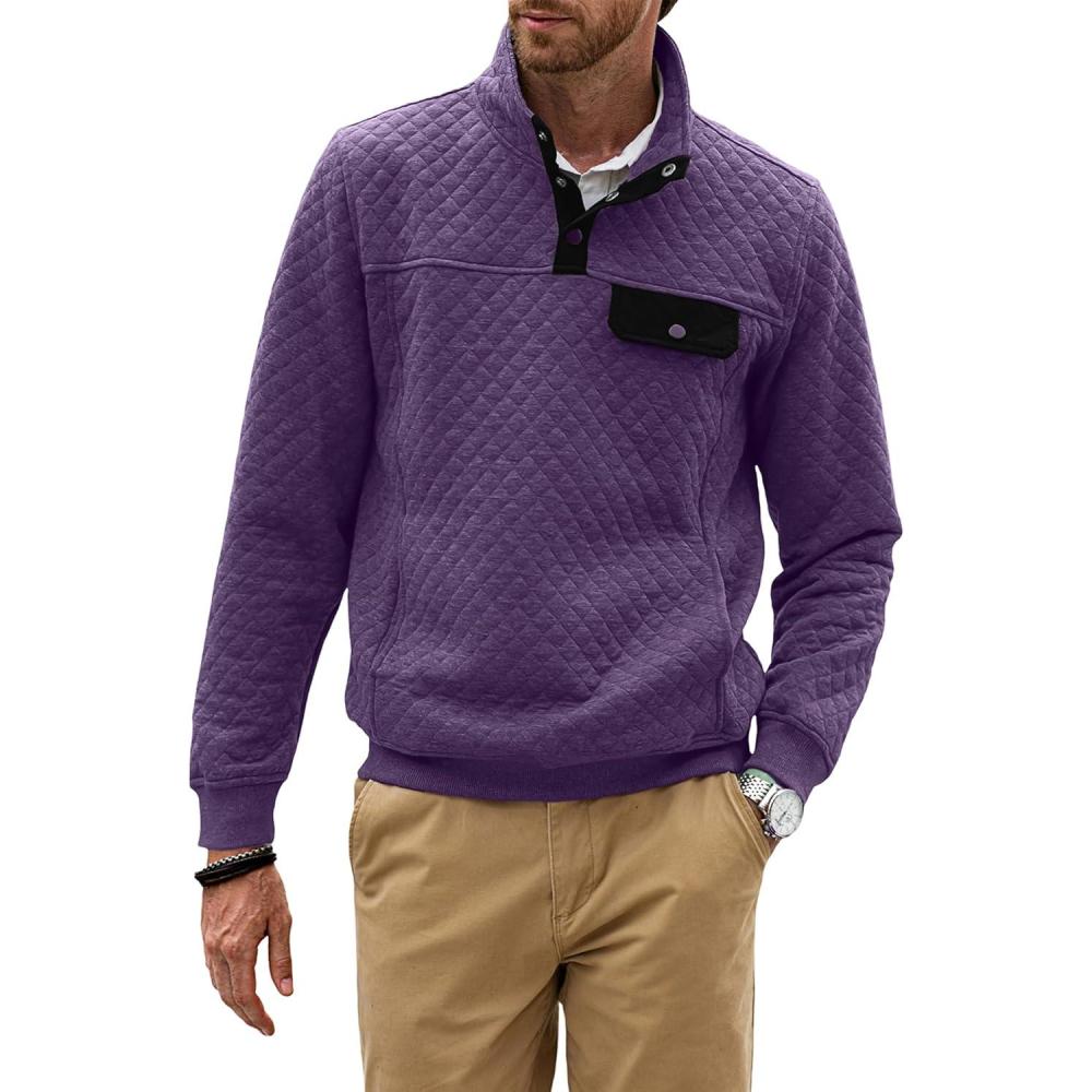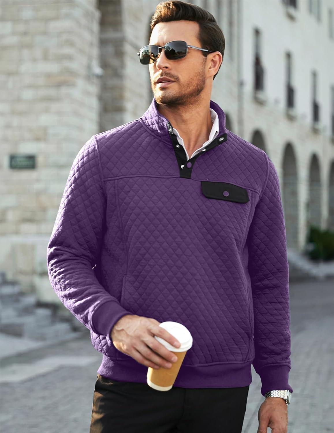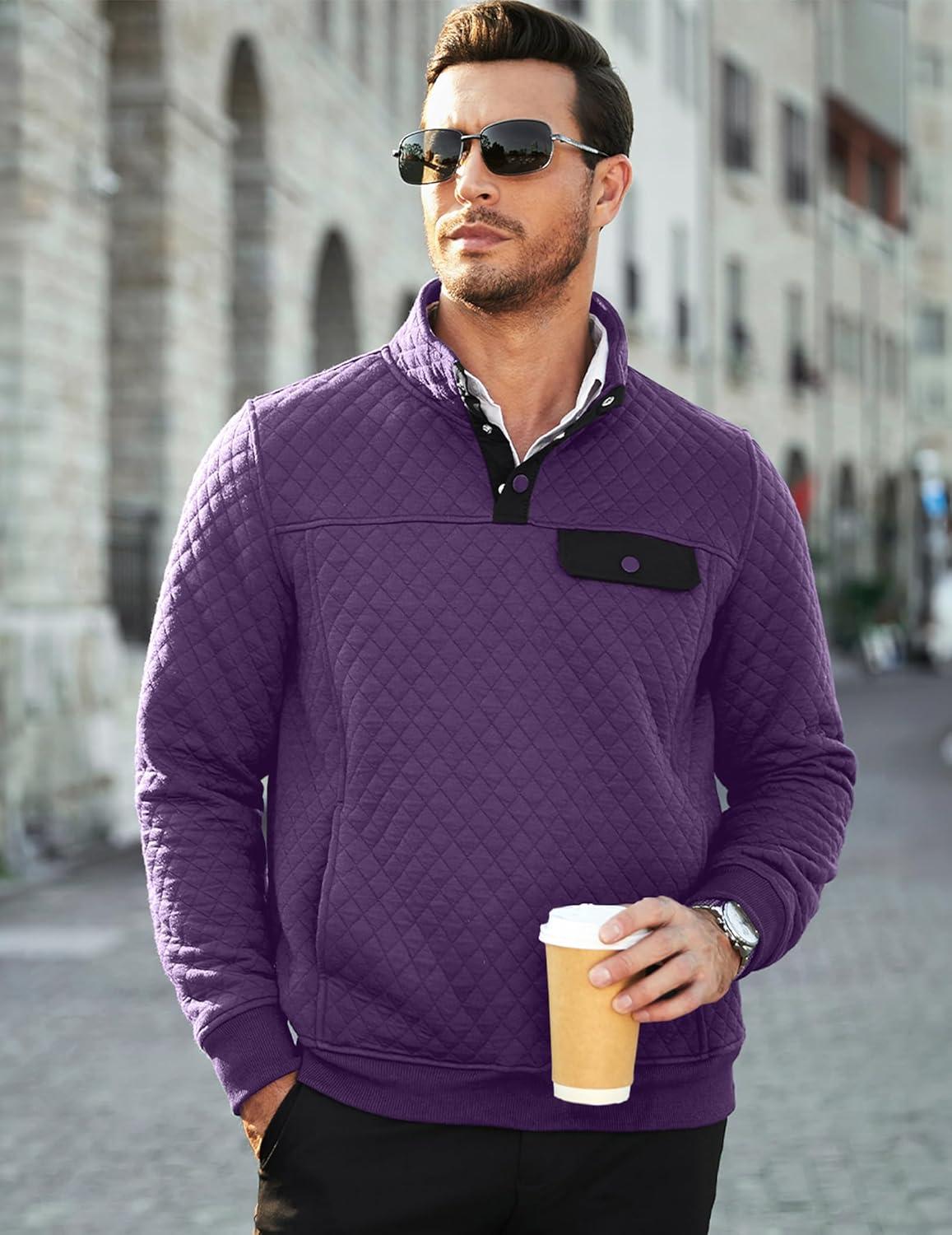 JMIERR Men’s Quilted Sweatshirt Casual Long Sleeve Outdoor Stand Collar Button Pullover Sweatshirts(D Purple)