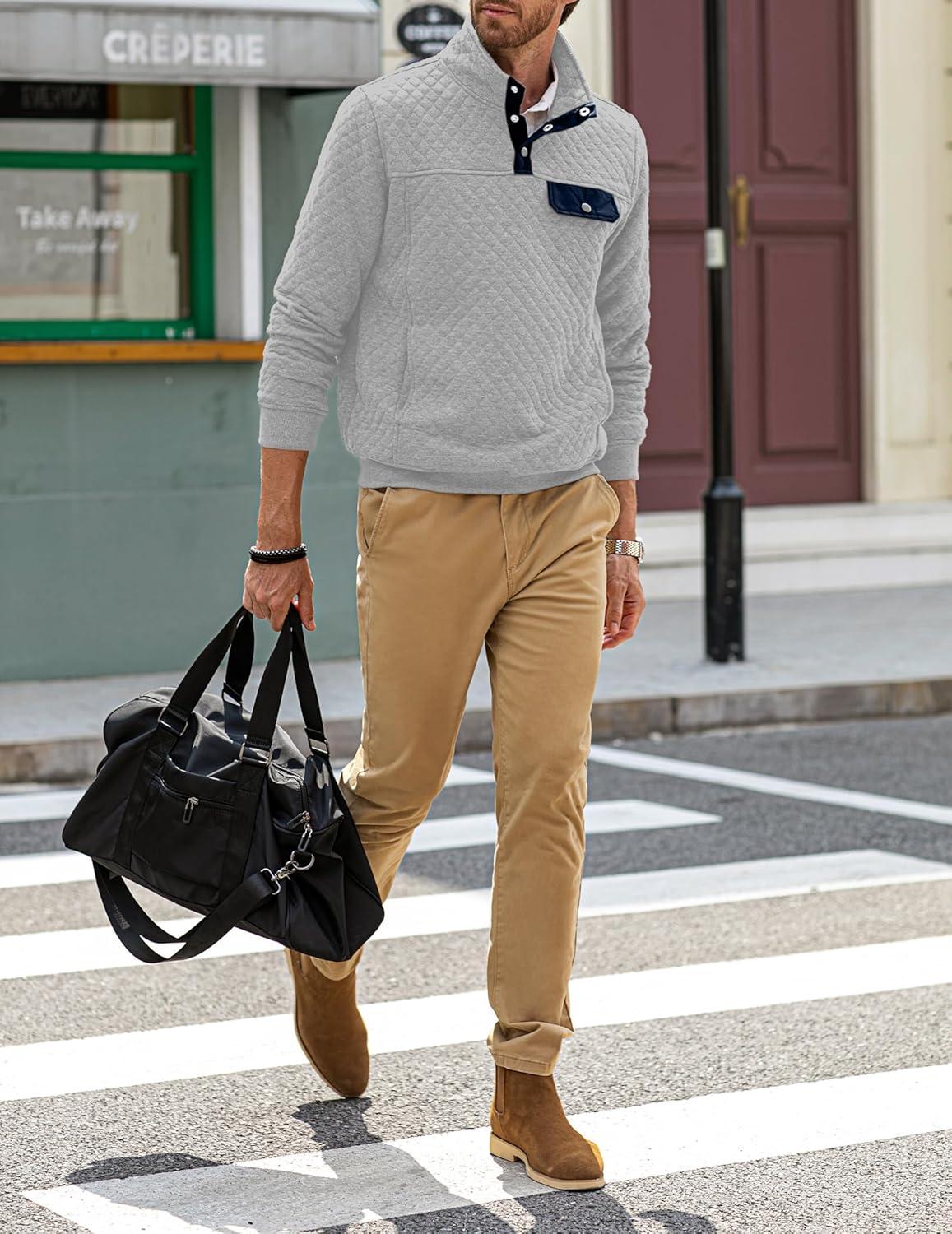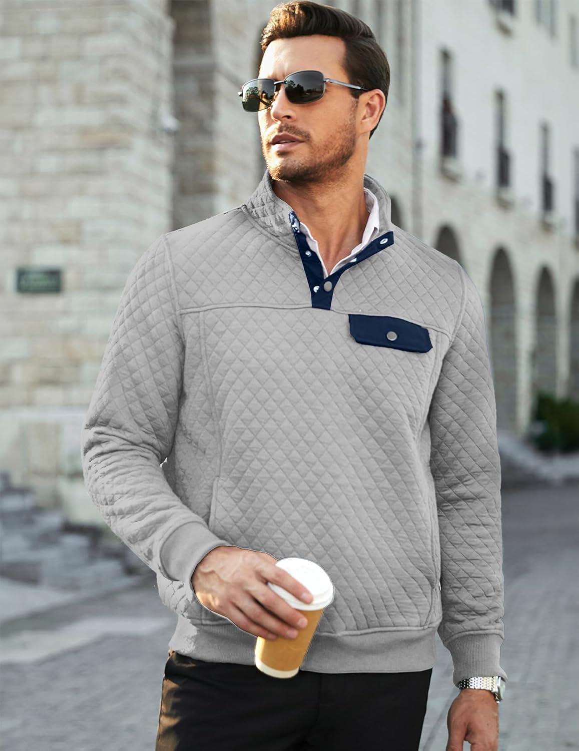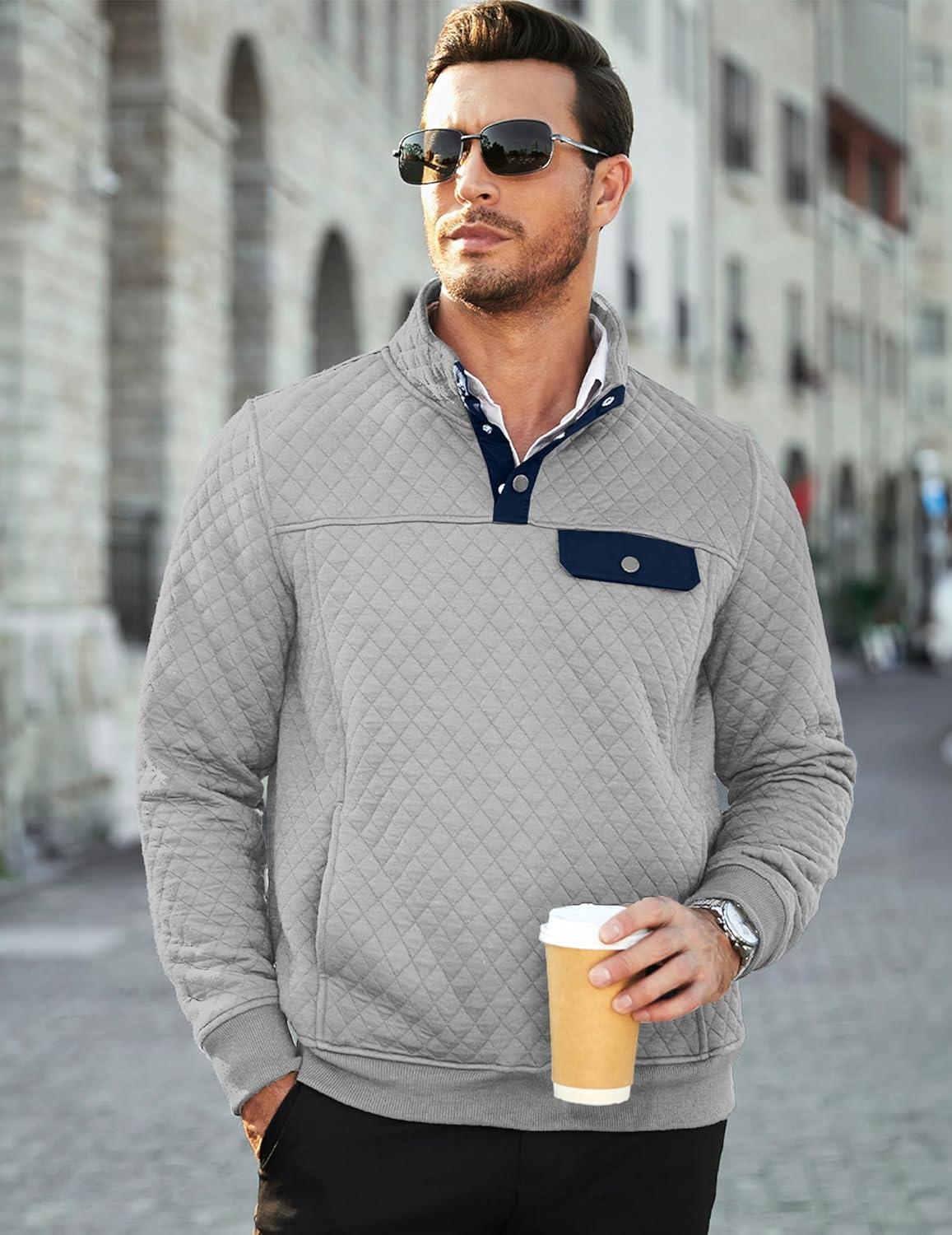 JMIERR Men’s Quilted Sweatshirt Casual Long Sleeve Outdoor Stand Collar Button Pullover Sweatshirts(Z Light Grey)