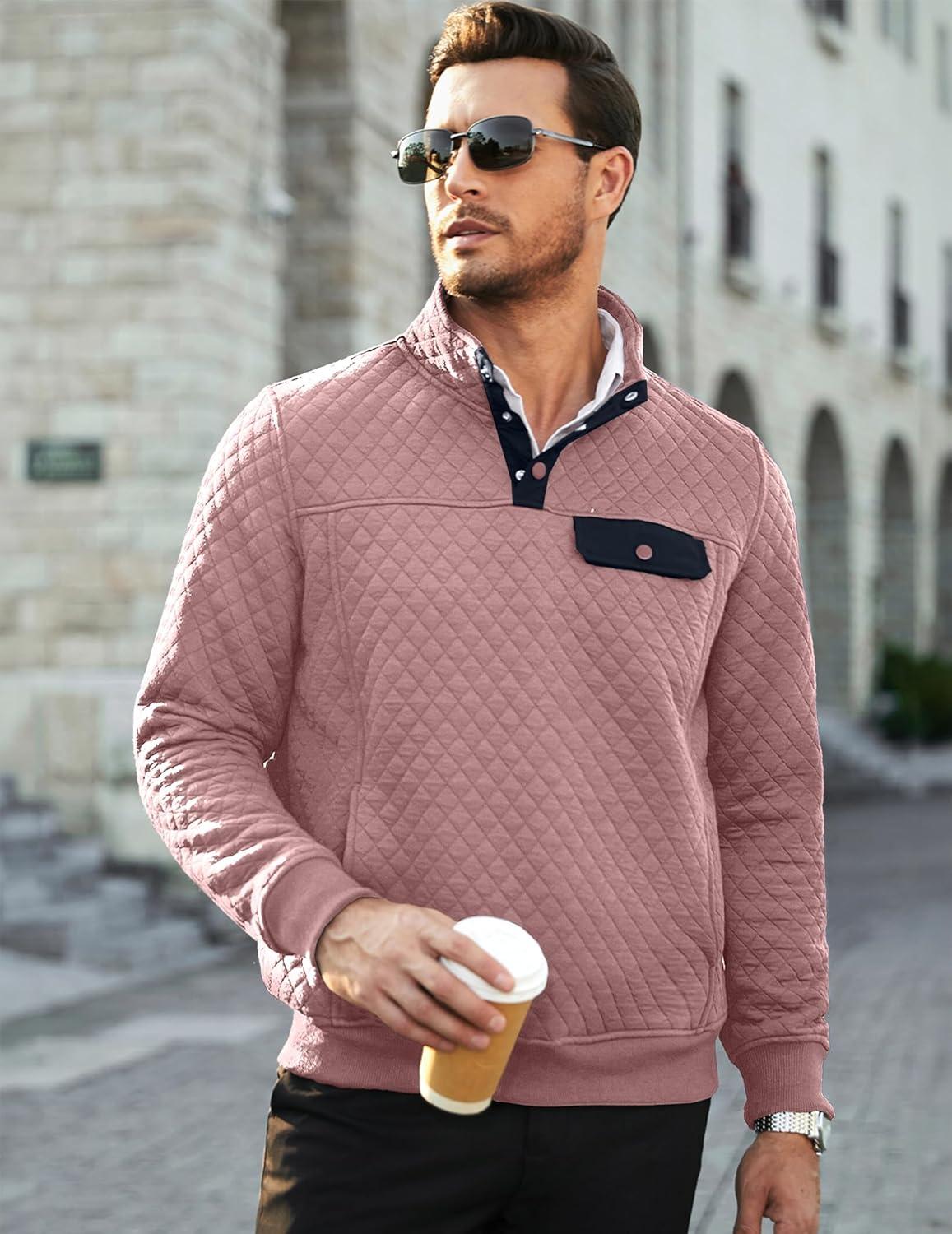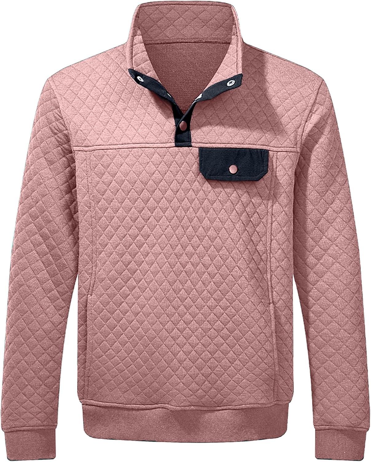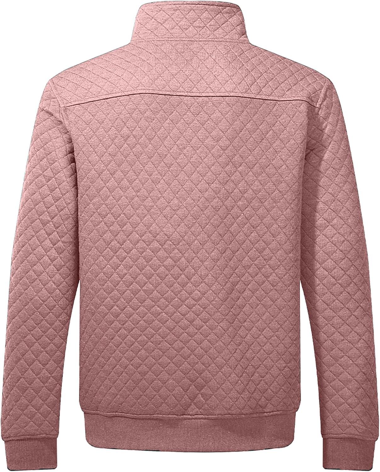 JMIERR Men’s Quilted Sweatshirt Casual Long Sleeve Outdoor Stand Collar Button Pullover Sweatshirts(Z Pink)