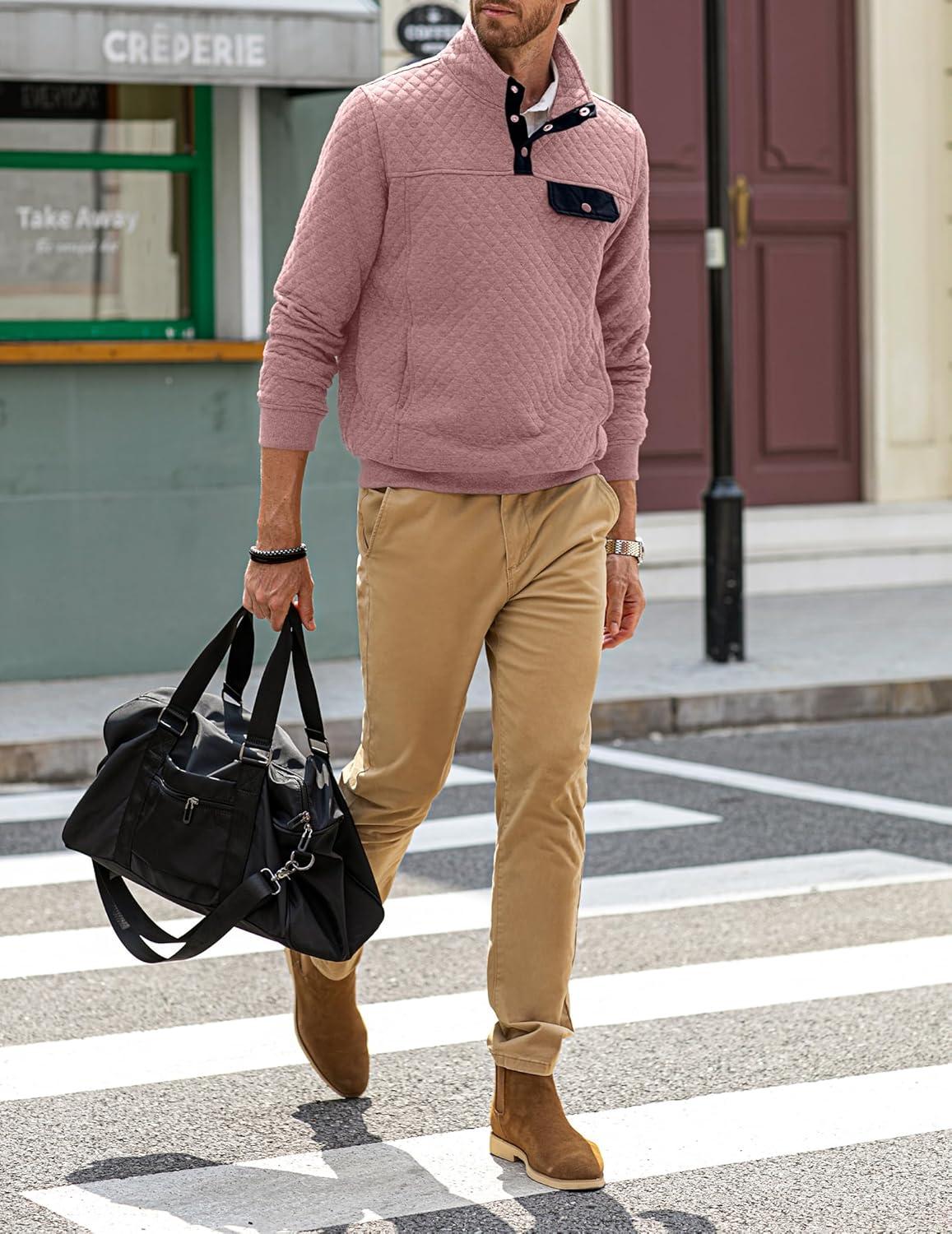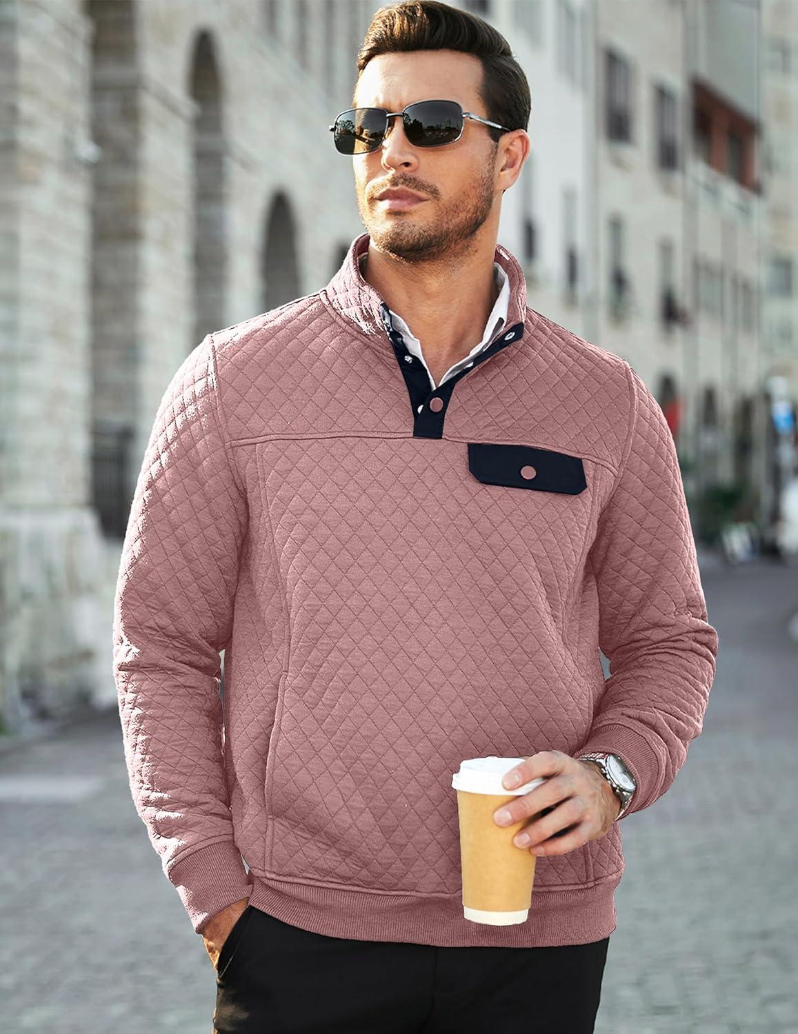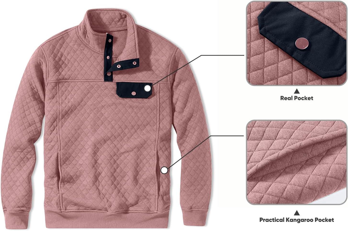 JMIERR Men’s Quilted Sweatshirt Casual Long Sleeve Outdoor Stand Collar Button Pullover Sweatshirts(Z Pink)