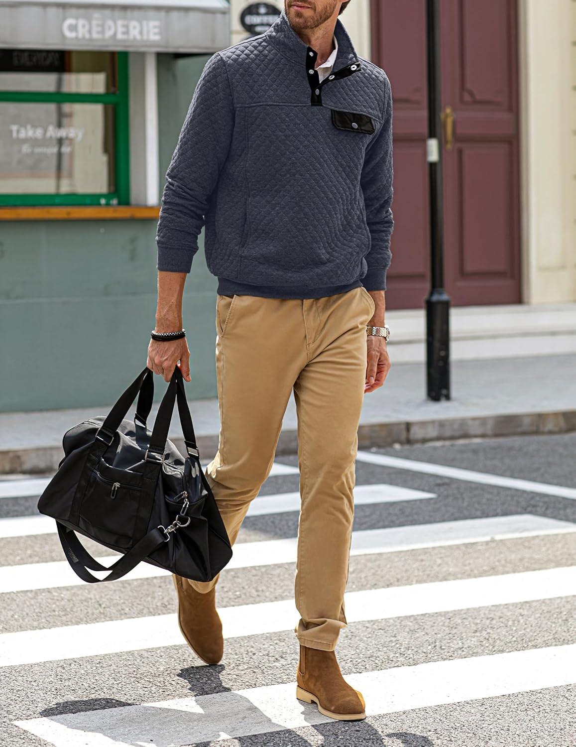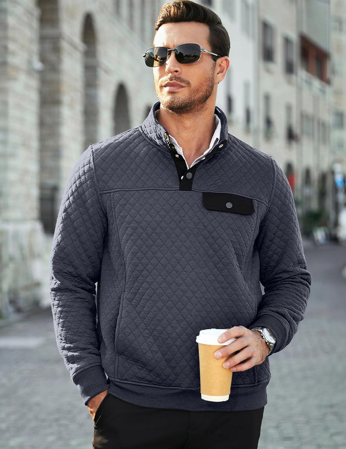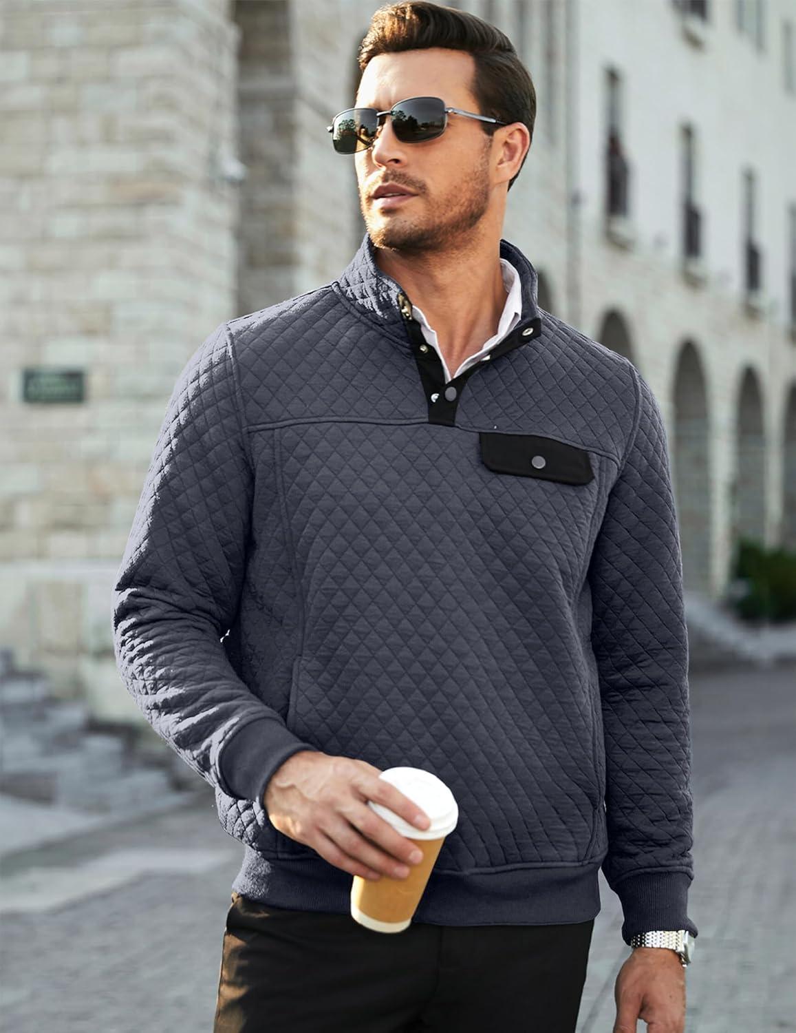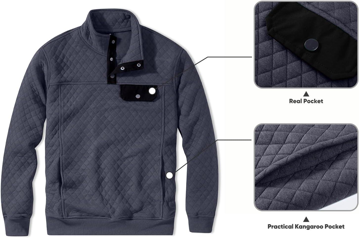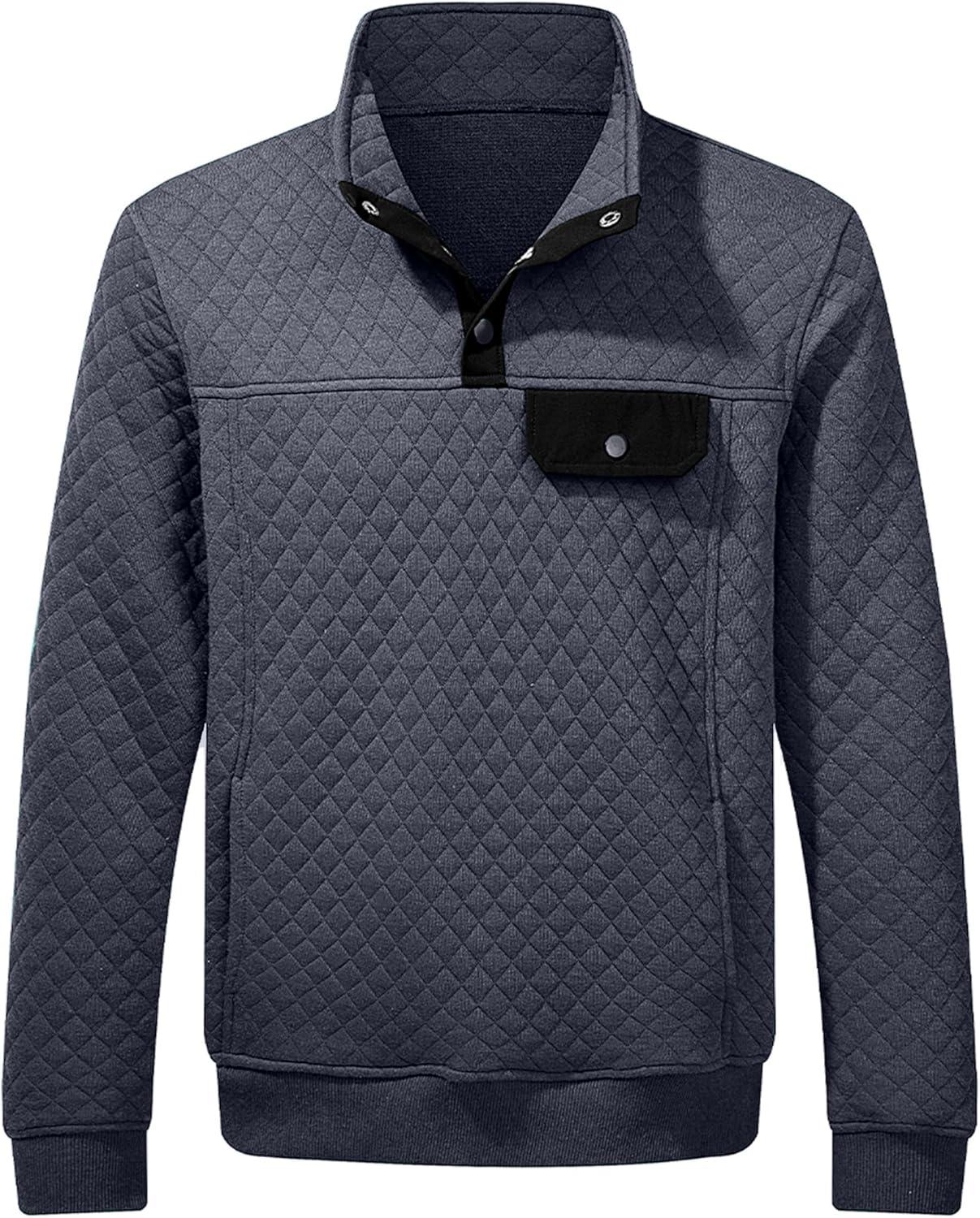 JMIERR Men’s Quilted Sweatshirt Casual Long Sleeve Outdoor Stand Collar Button Pullover Sweatshirts(Z Teal Blue)