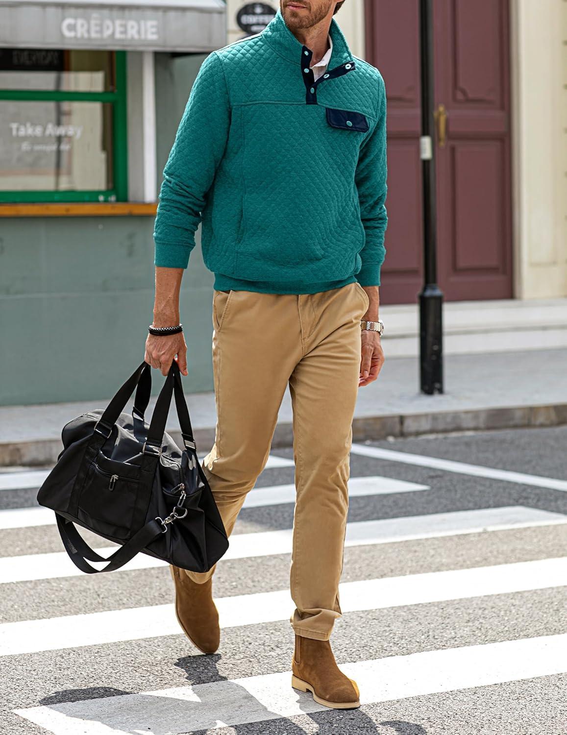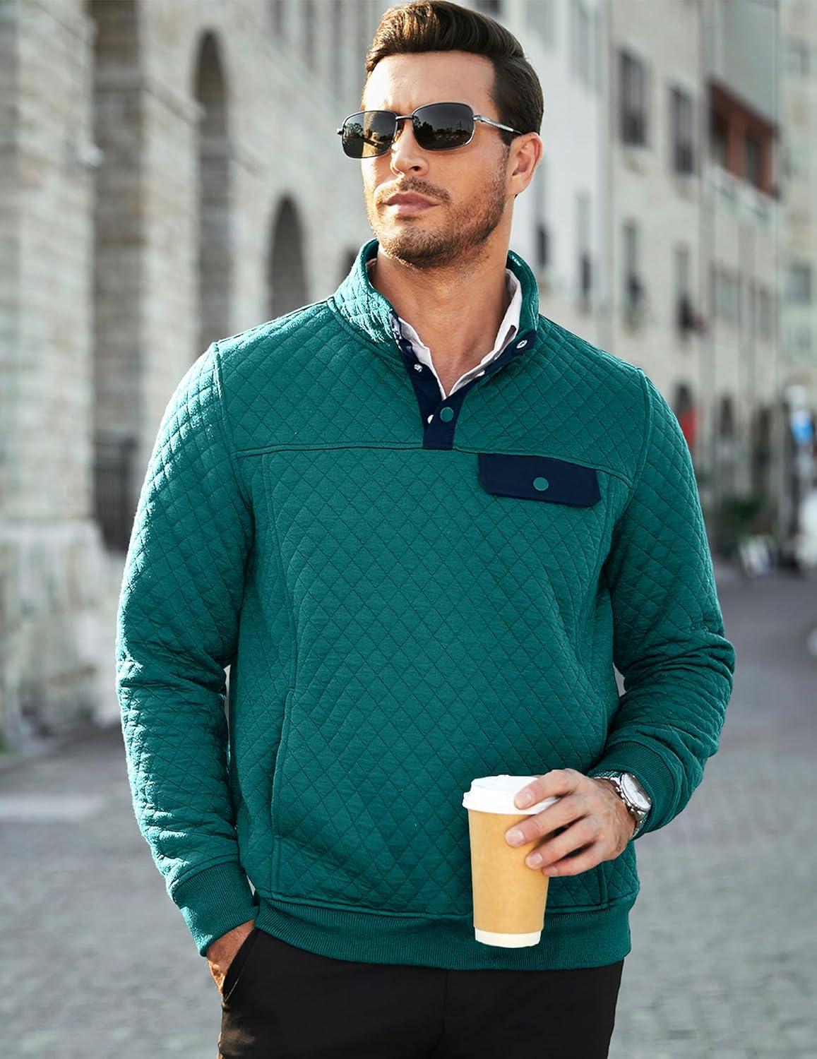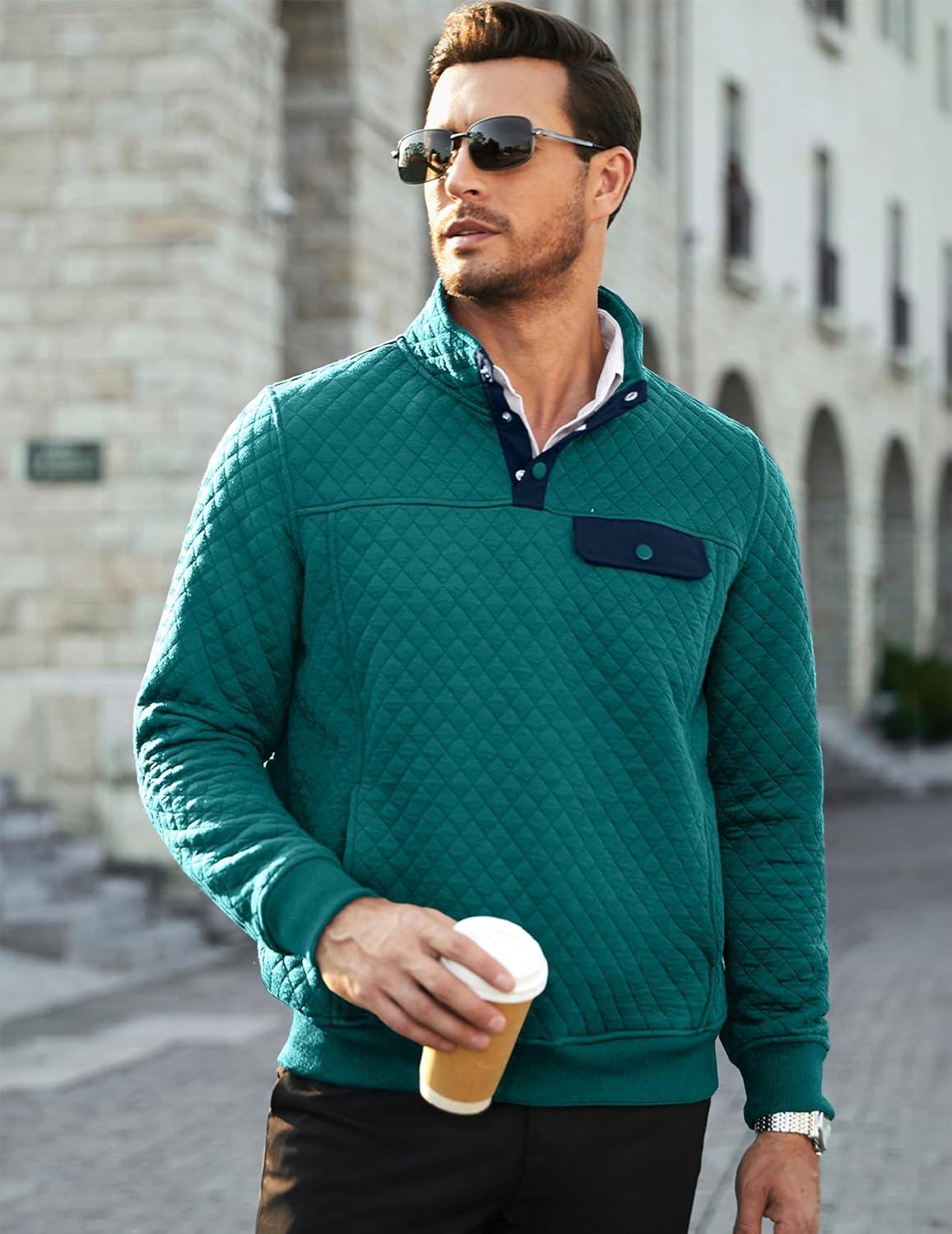 JMIERR Men’s Quilted Sweatshirt Casual Long Sleeve Outdoor Stand Collar Button Pullover Sweatshirts(Z Teal Green)