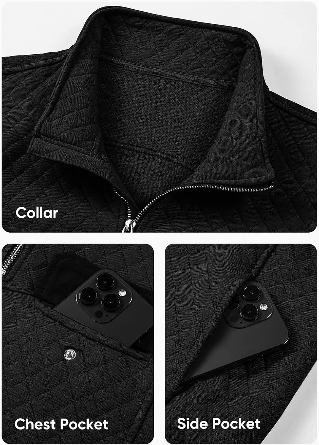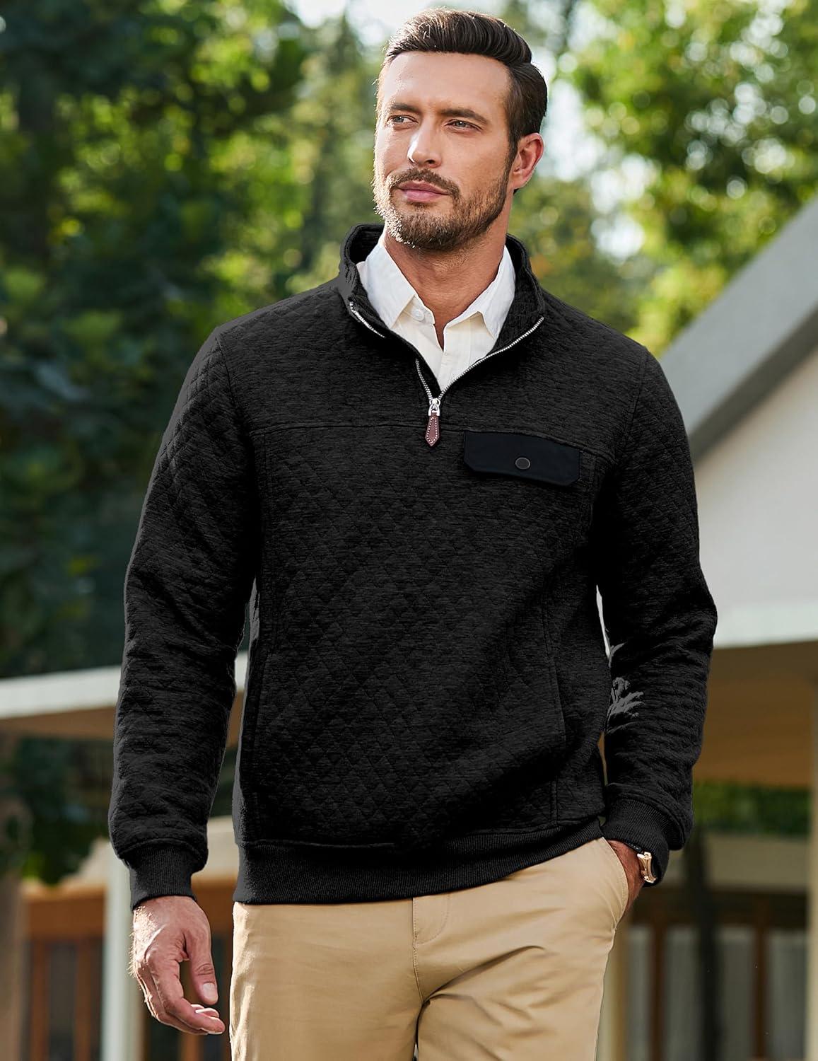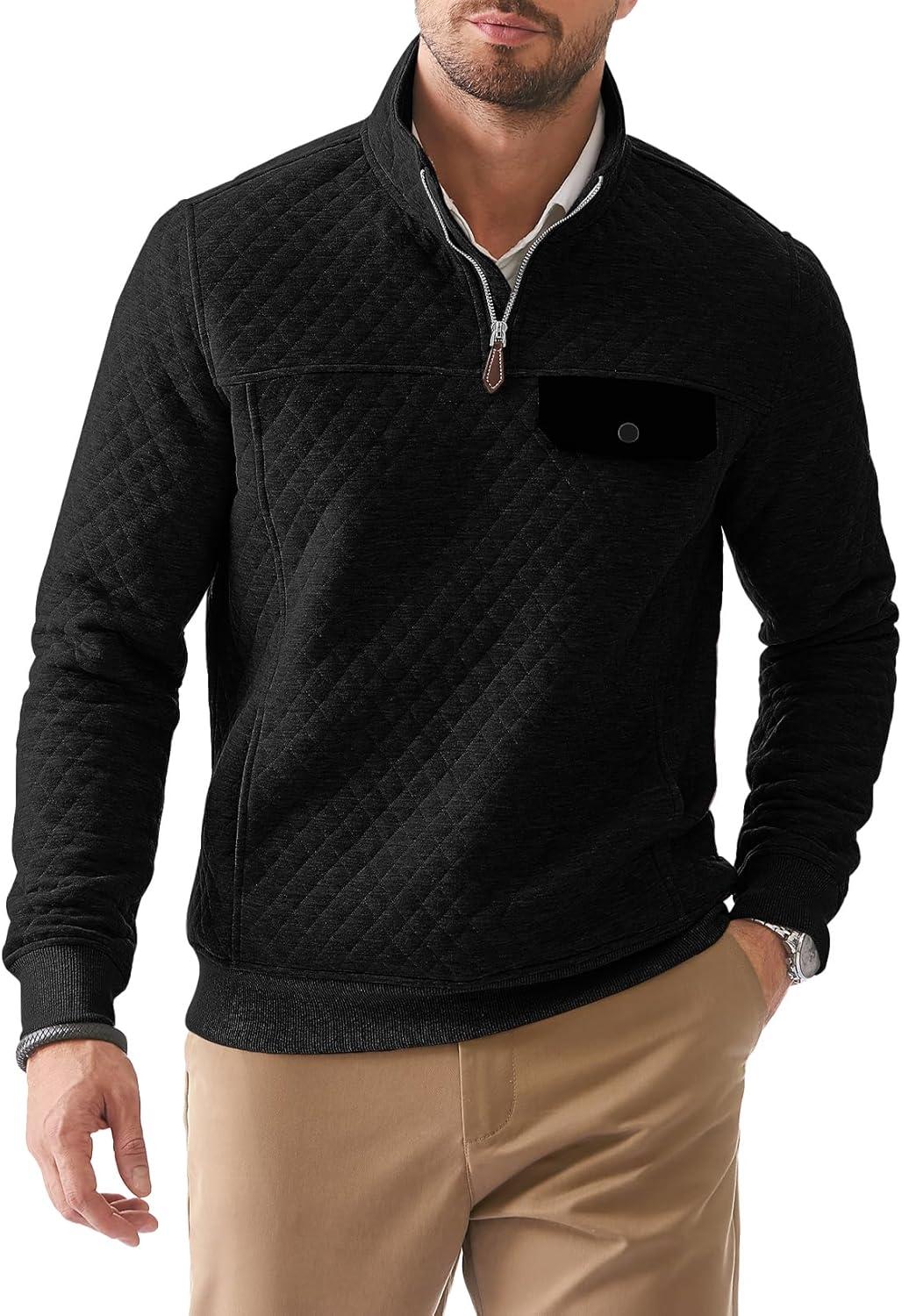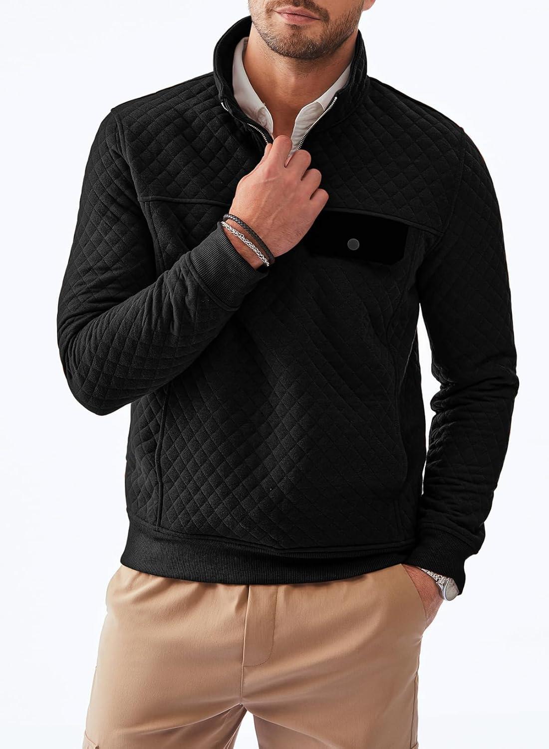 JMIERR Men’s Quilted Sweatshirt Casual Long Sleeve Outdoor Stand Collar Quarter-Zip Pullover Sweatshirts(A Black)