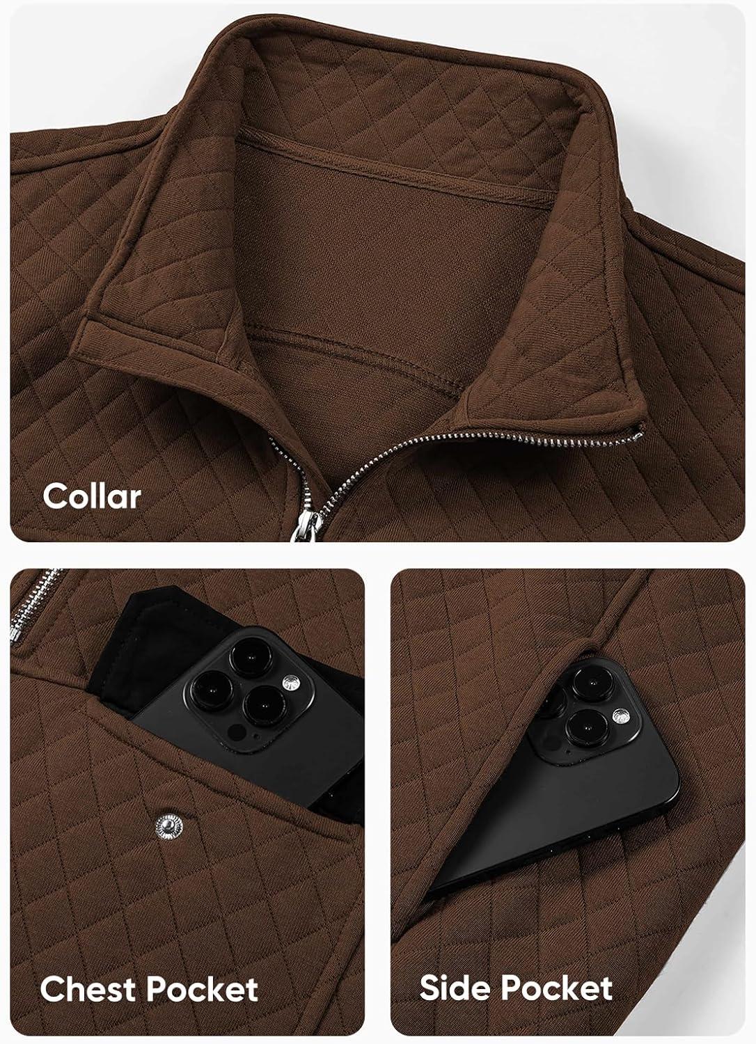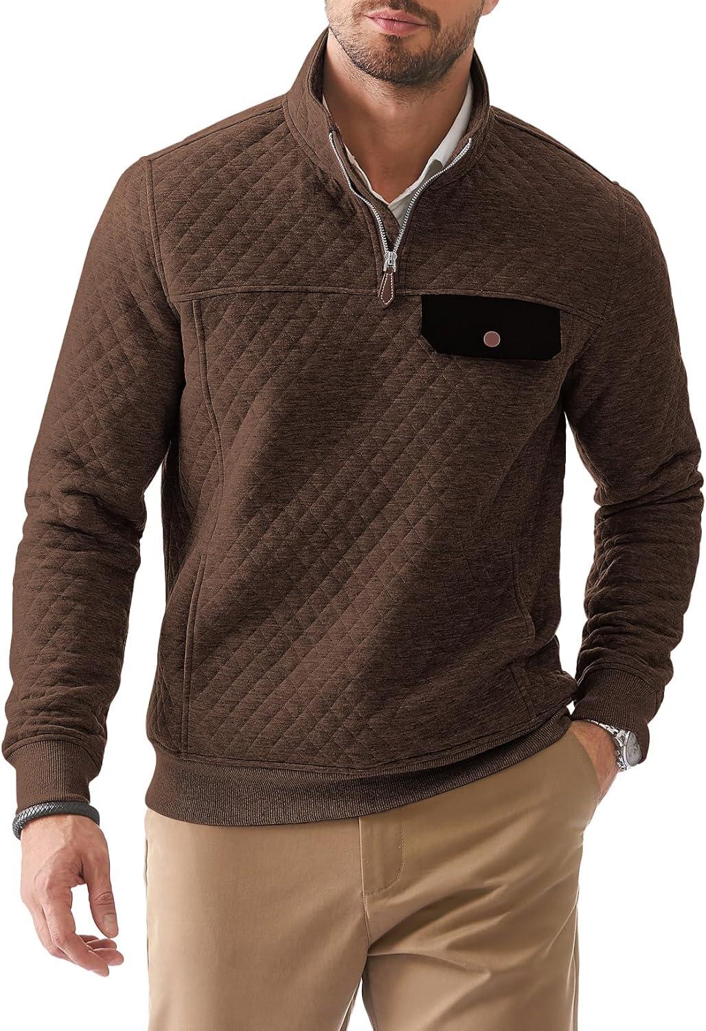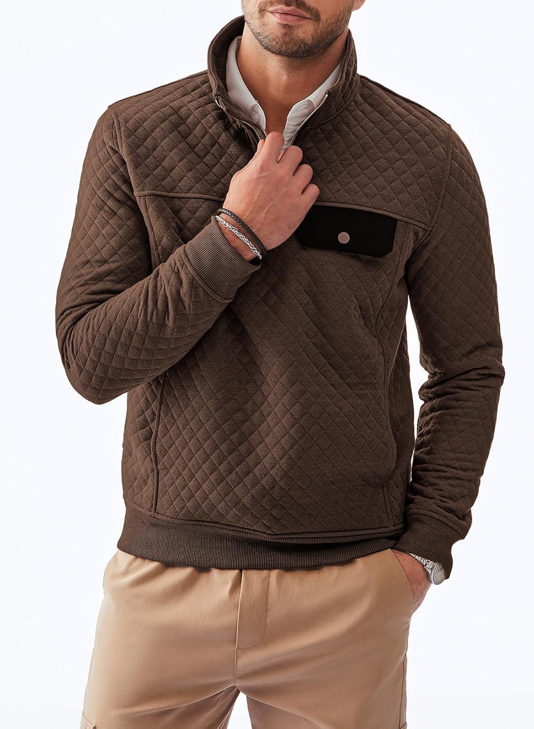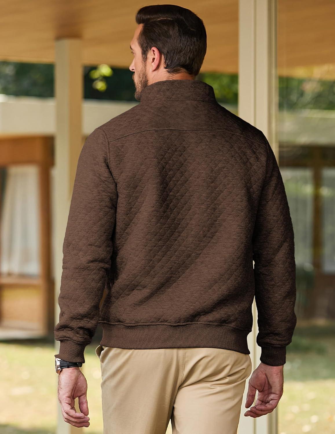 JMIERR Men’s Quilted Sweatshirt Casual Long Sleeve Outdoor Stand Collar Quarter-Zip Pullover Sweatshirts(Brown)