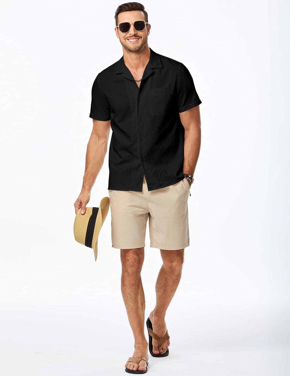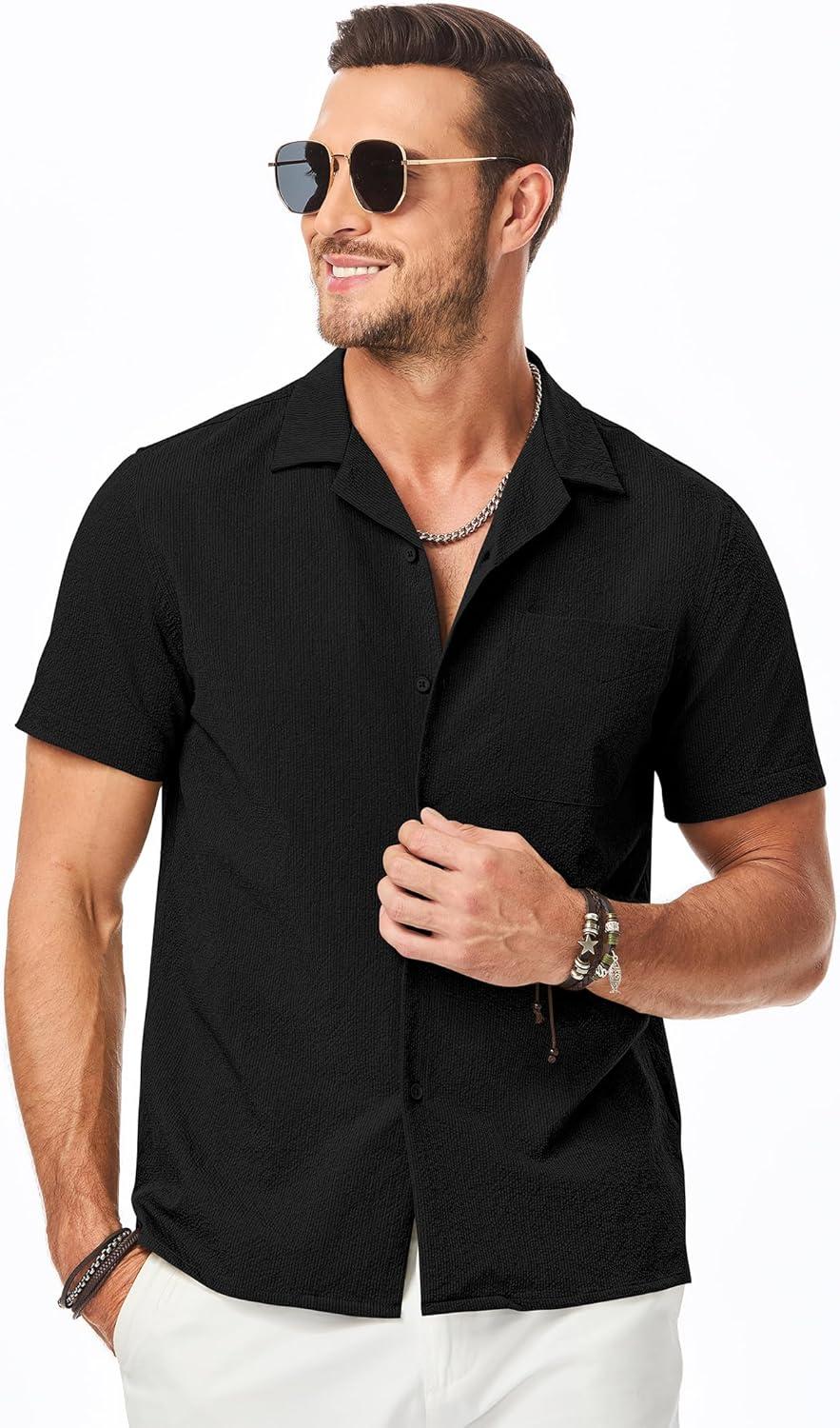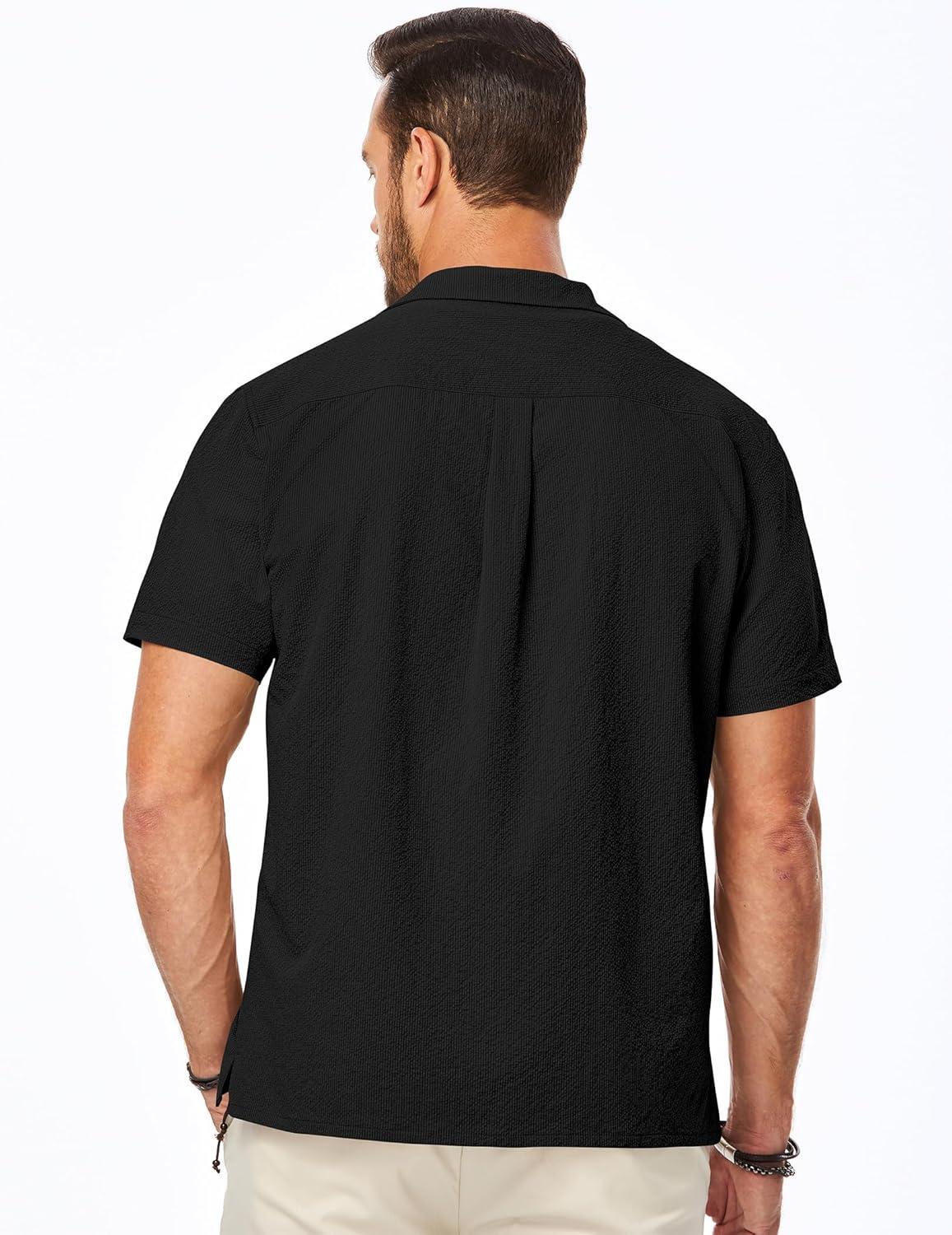 JMIERR Men’s Seersucker Shirts Short Sleeve Casual Shirts Button Down Shirt Beach Summer Vacation Wedding Shirt(Black)
