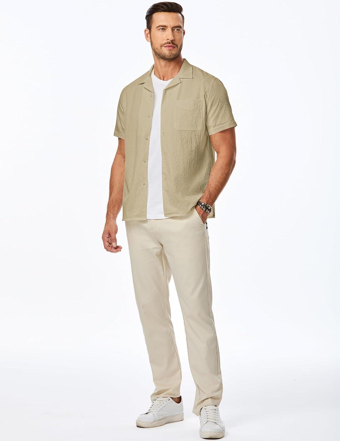 JMIERR Men’s Seersucker Shirts Short Sleeve Casual Shirts Button Down Shirt Beach Summer Vacation Wedding Shirt(Light Khaki)