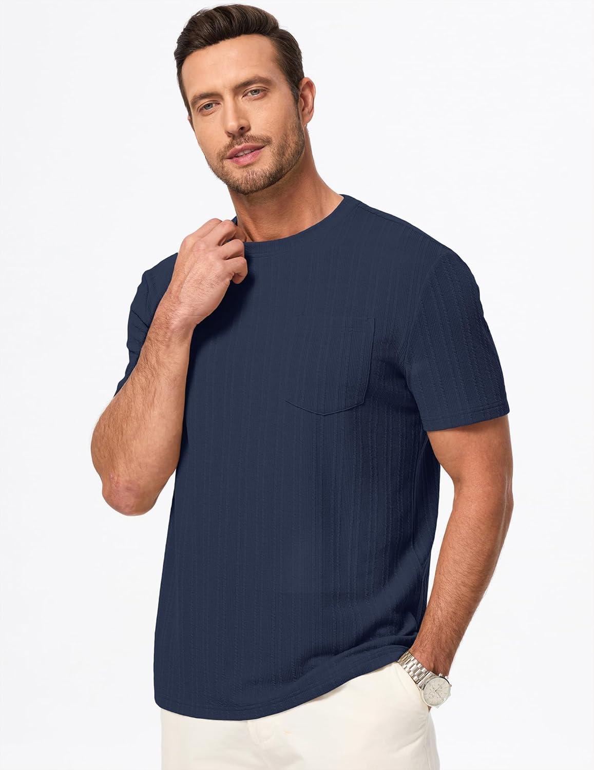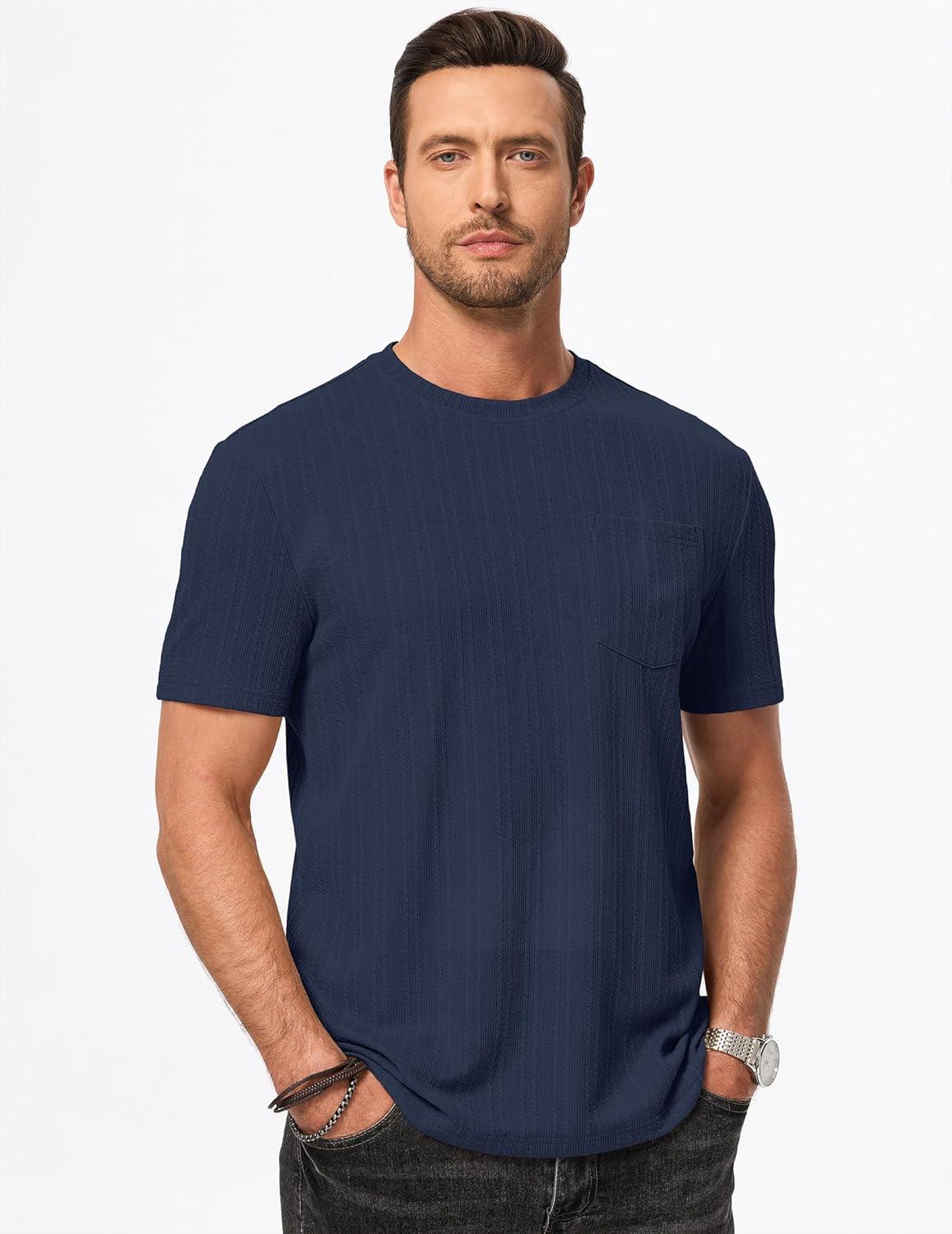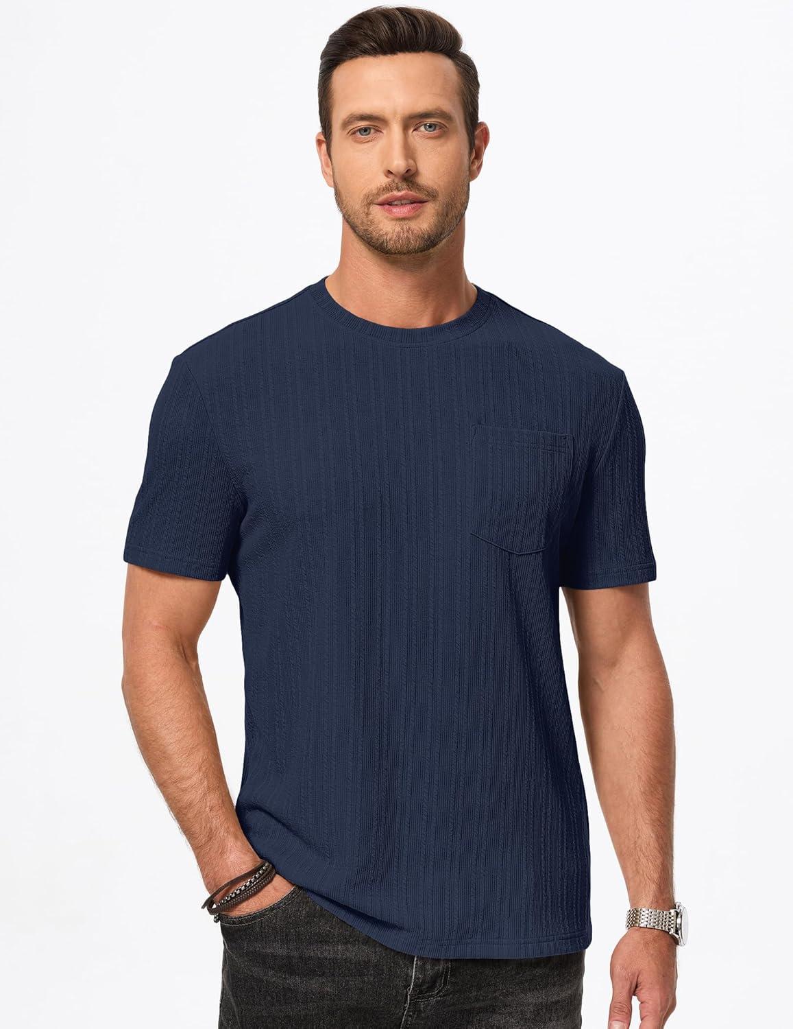 JMIERR Men’s Short Sleeve Shirts Casual Crewneck Pullover T-Shirt Stretch Textured Tee Shirts with Pocket(Blue)