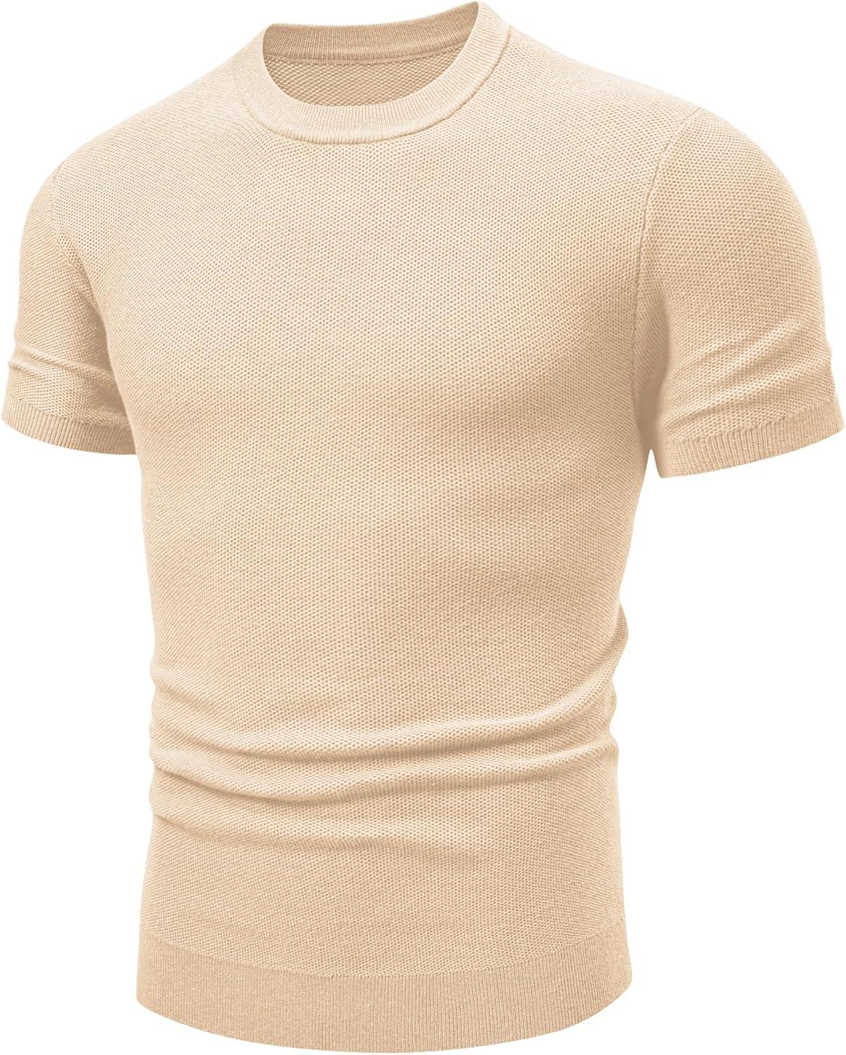JMIERR Men’s T-Shirts Casual Knit Short Sleeve Cotton Crewneck Solid Honeycomb Knitted Pullover Tees(Beige)