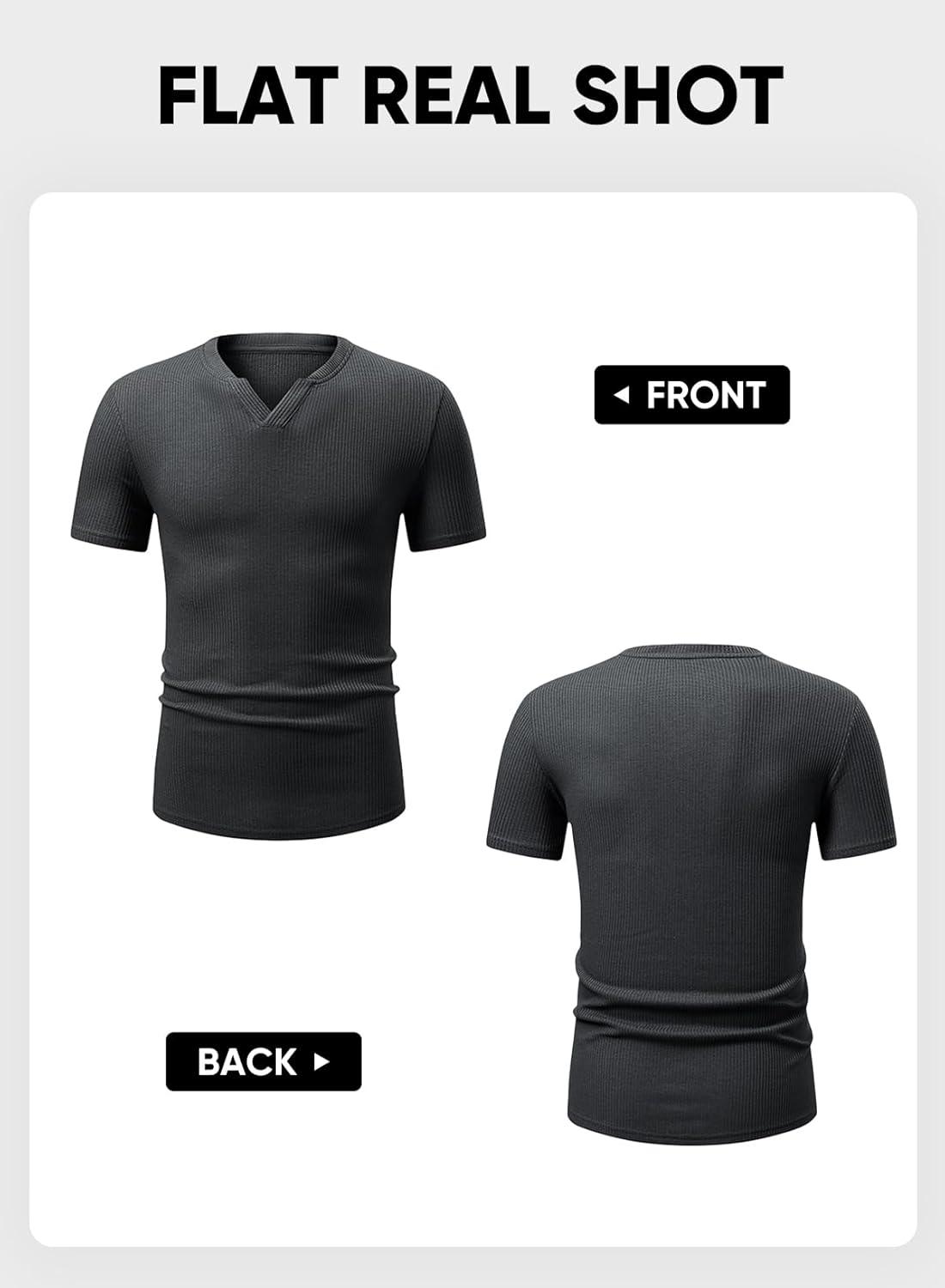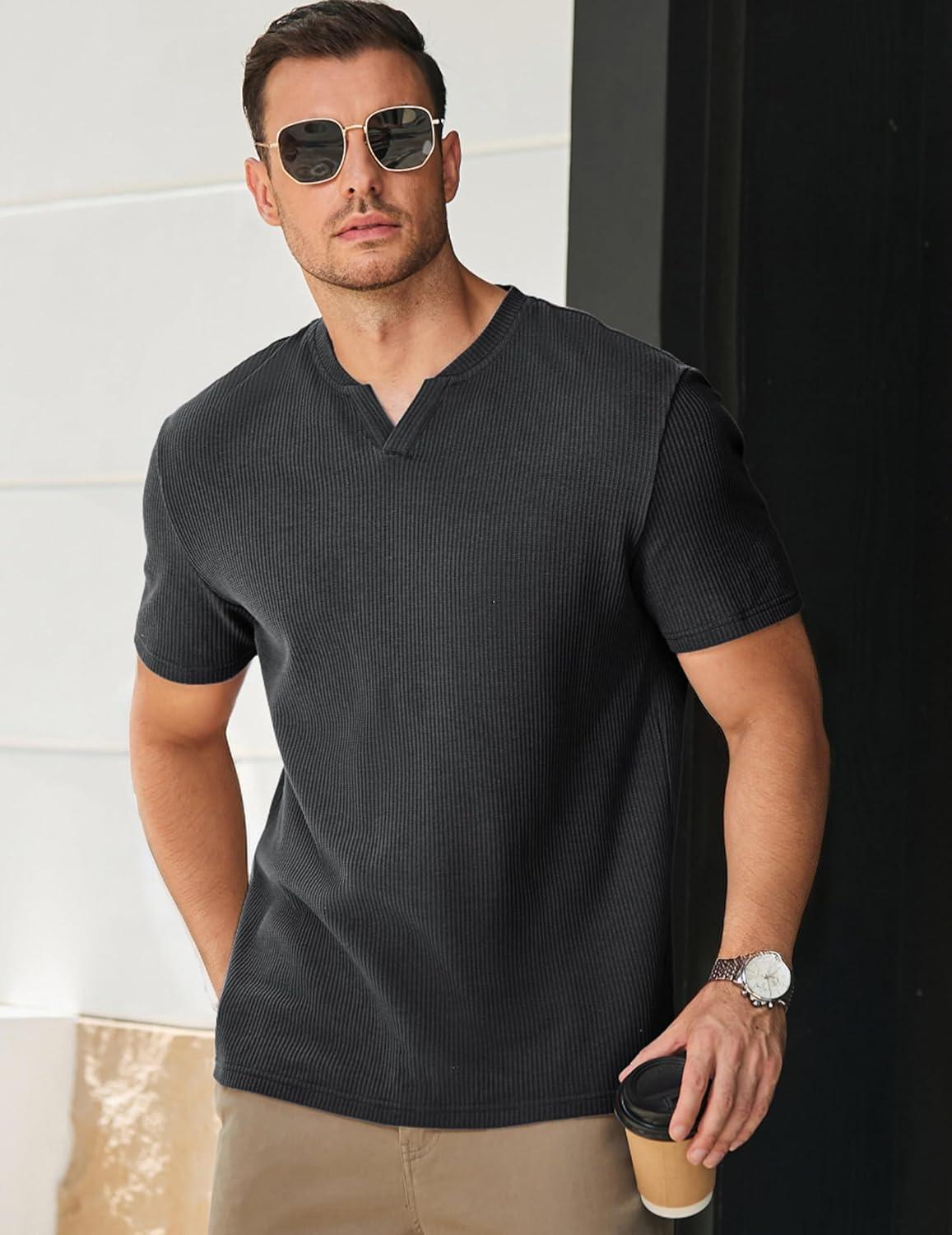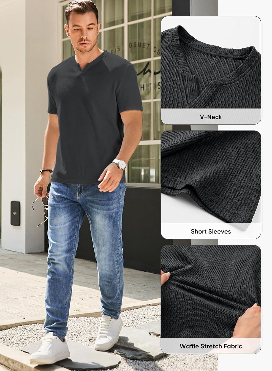 JMIERR Mens Waffle Cotton T Shirt V-Neck Henley Shirt Short Sleeve Work Casual Tee Shirts(Grey Black)