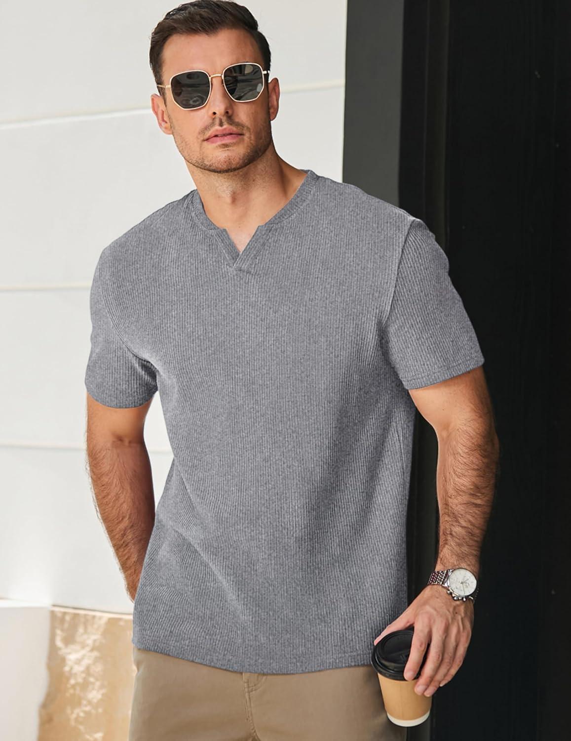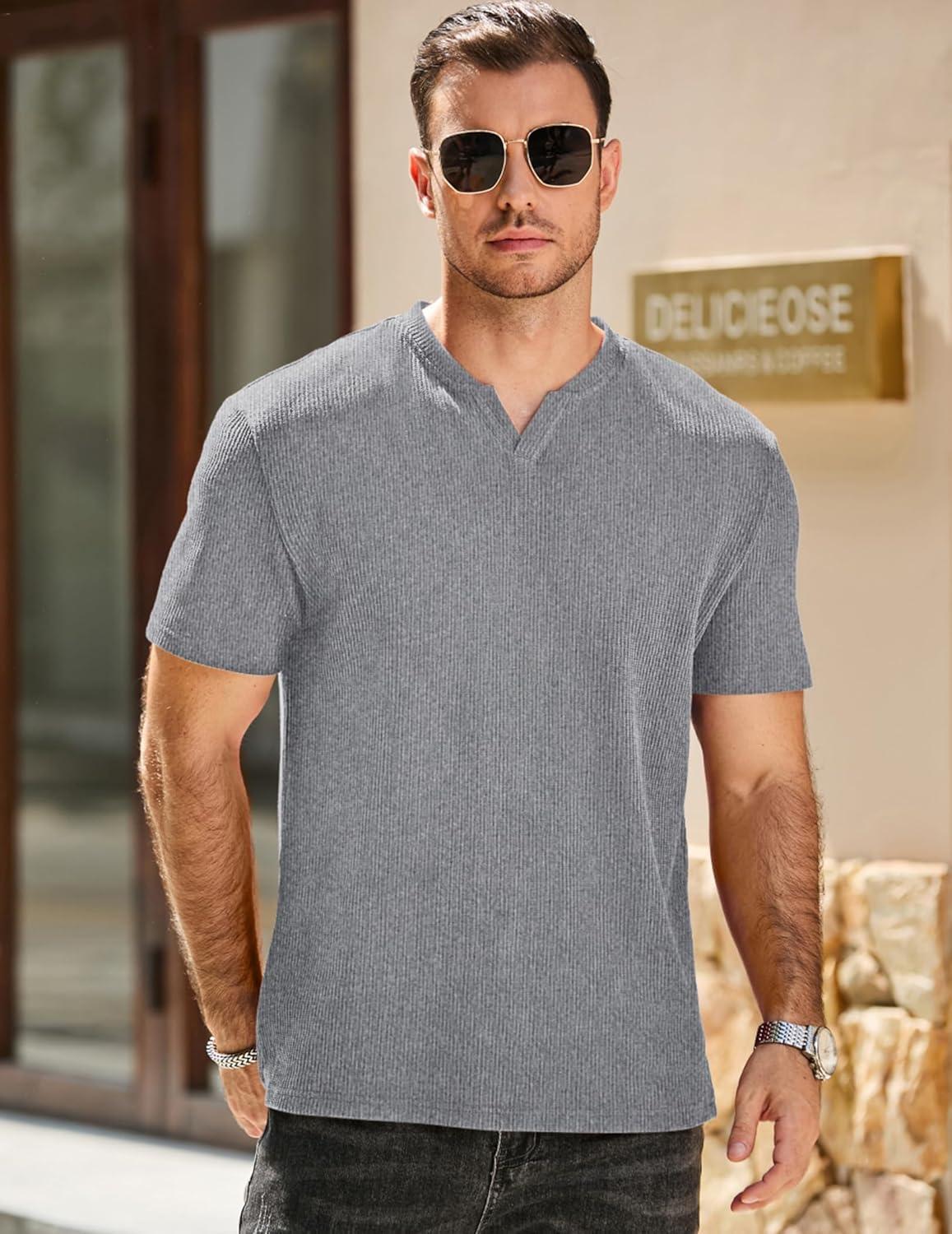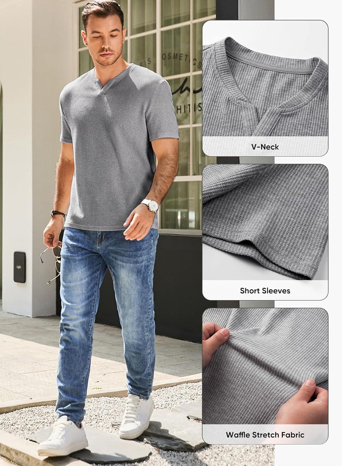 JMIERR Mens Waffle Cotton T Shirt V-Neck Henley Shirt Short Sleeve Work Casual Tee Shirts(Grey)