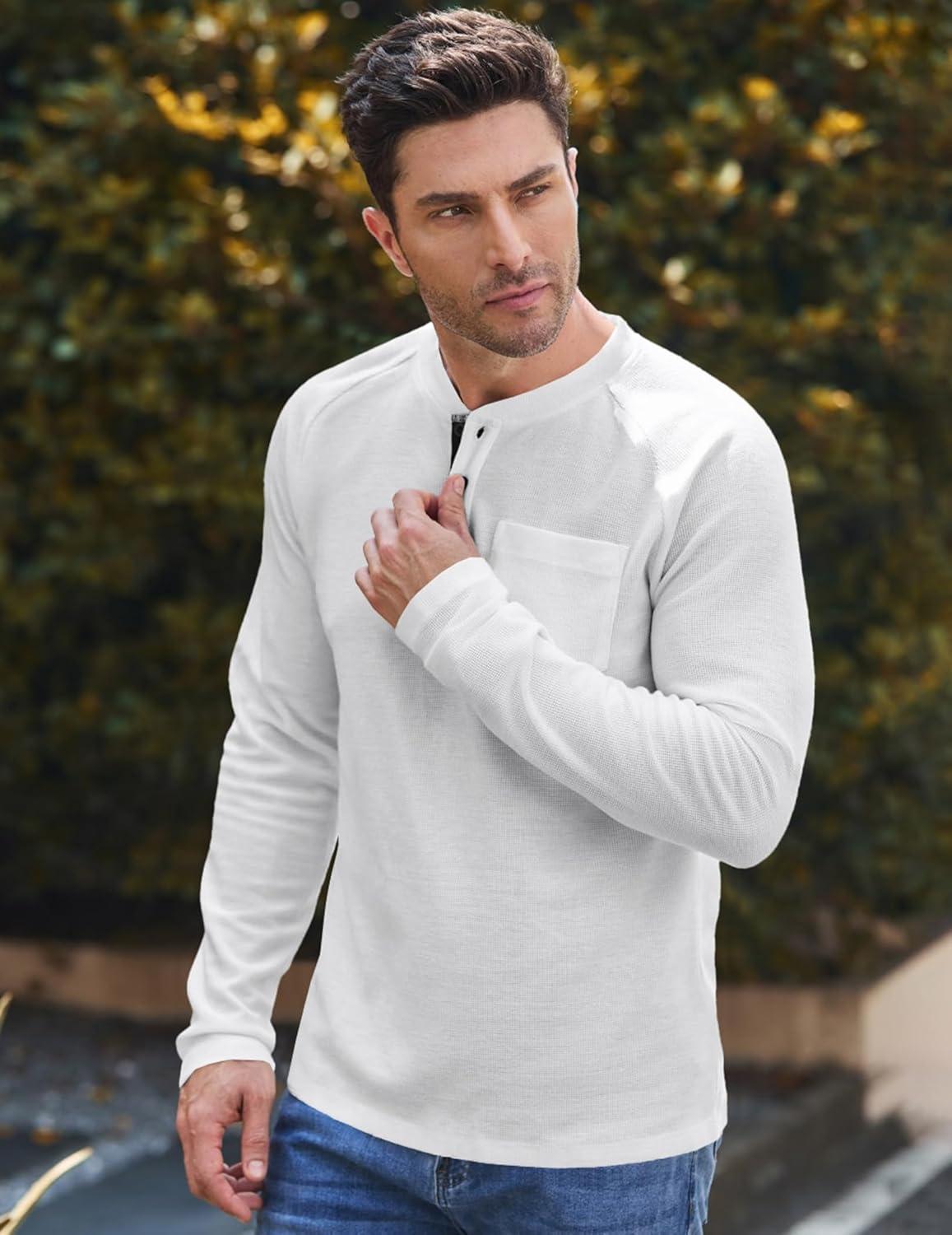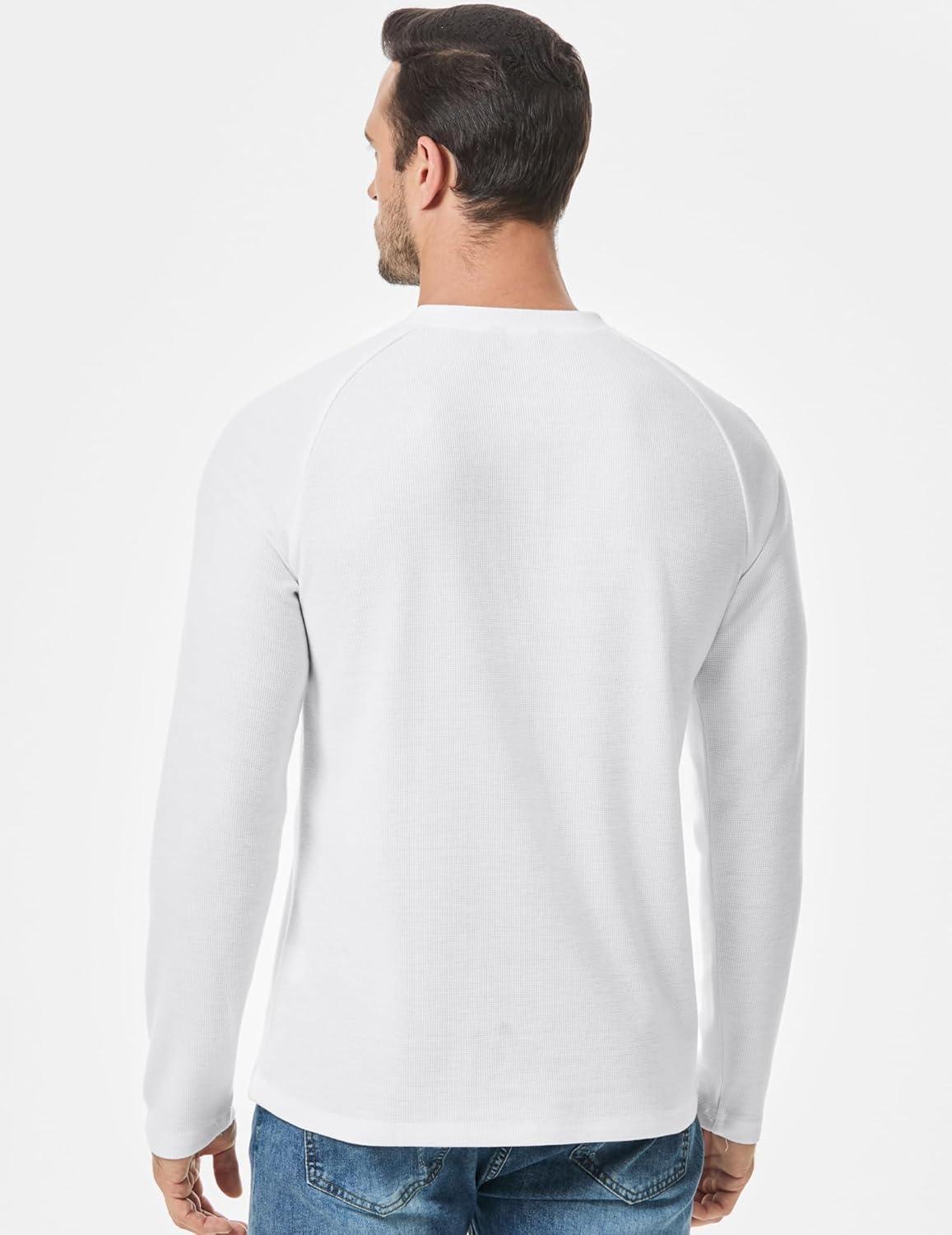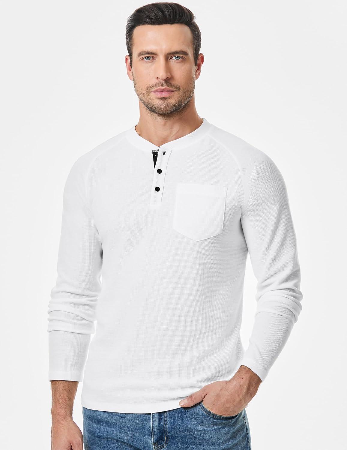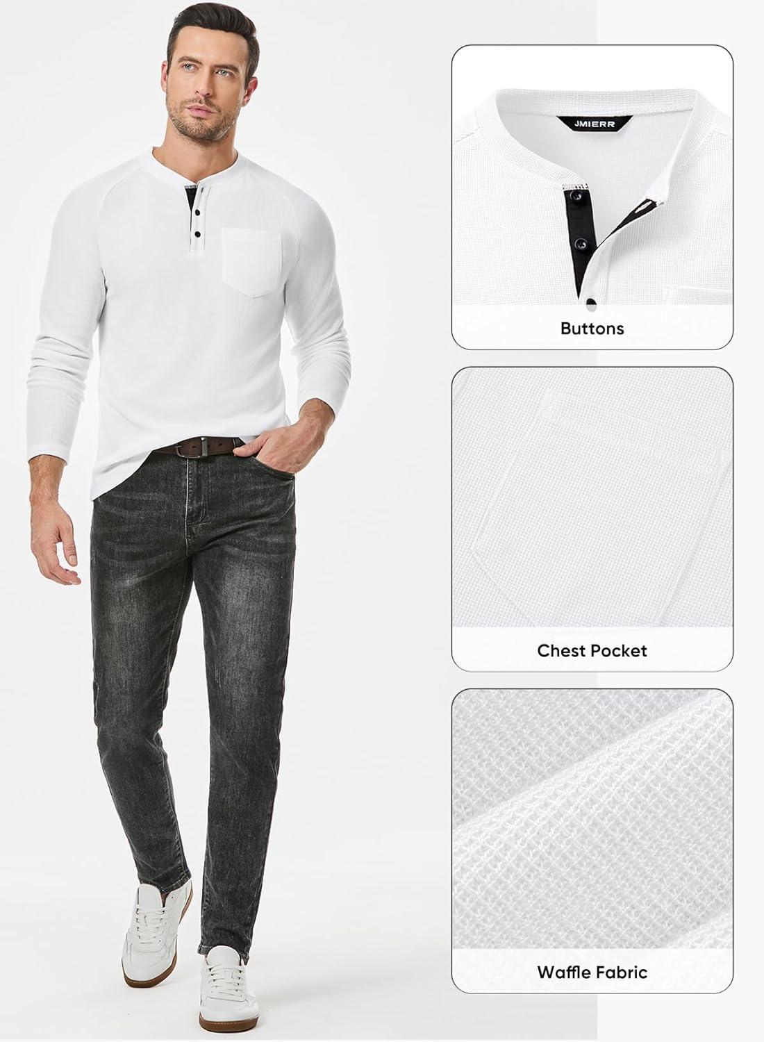 JMIERR Men’s Waffle Henley Shirts Crewneck Long Sleeve Button Casual T-Shirt with Pocket(White)