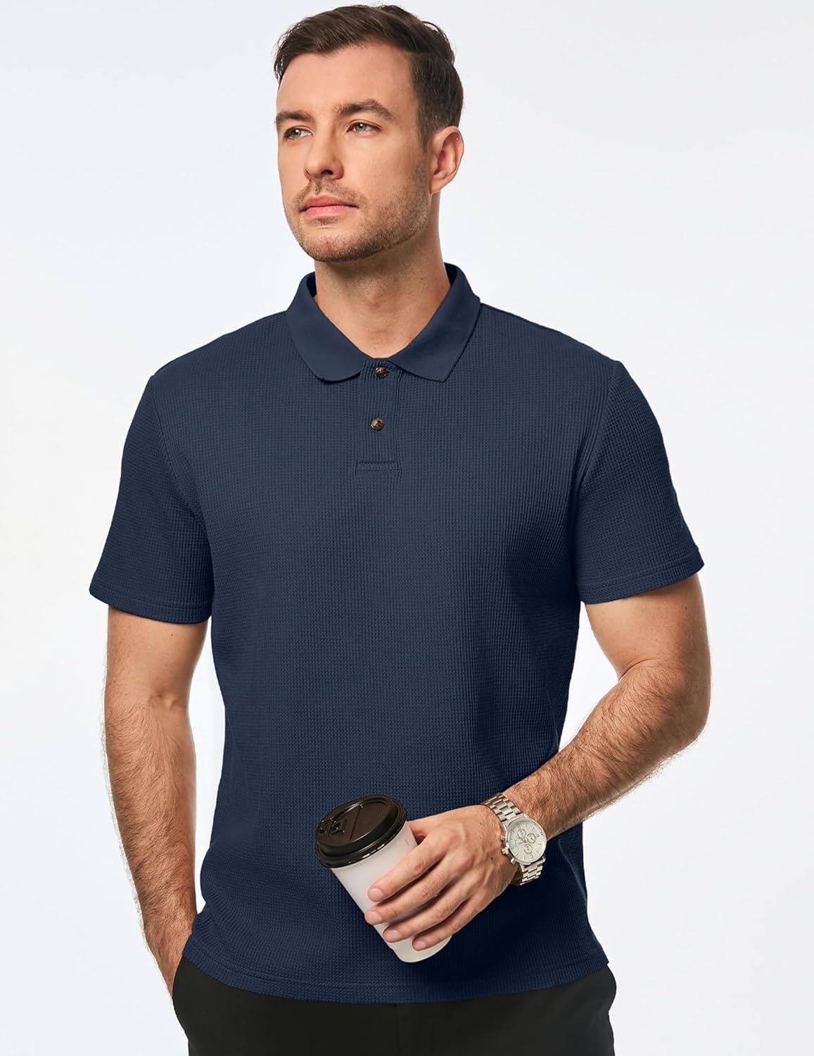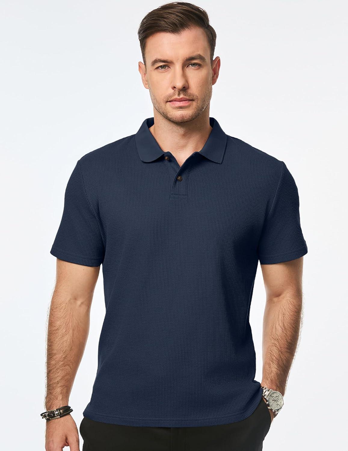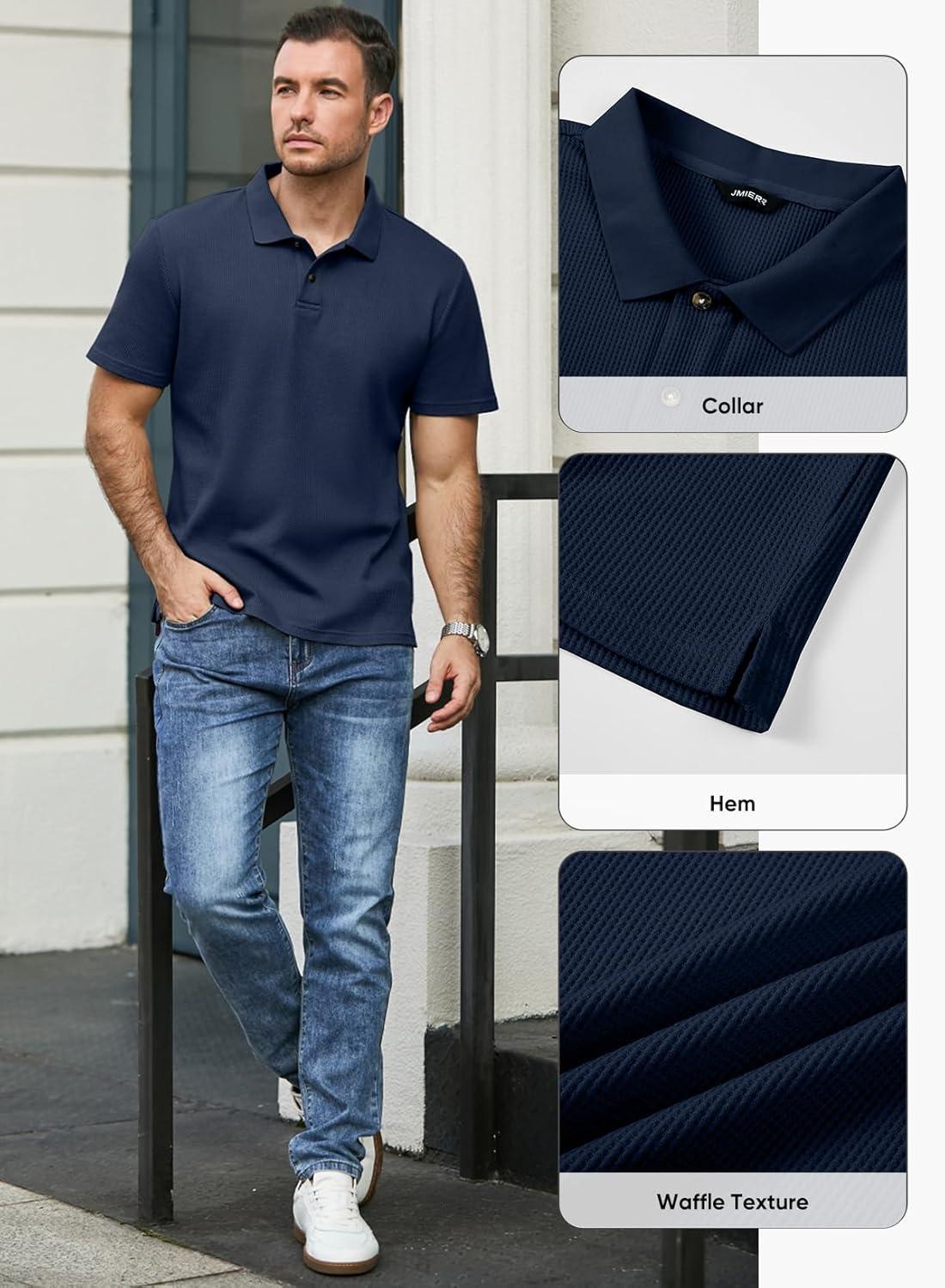 JMIERR Men’s Waffle Polo Shirts Summer Casual Short Sleeve T-Shirt Button Up Solid Color Henley Shirts(Navy Blue)