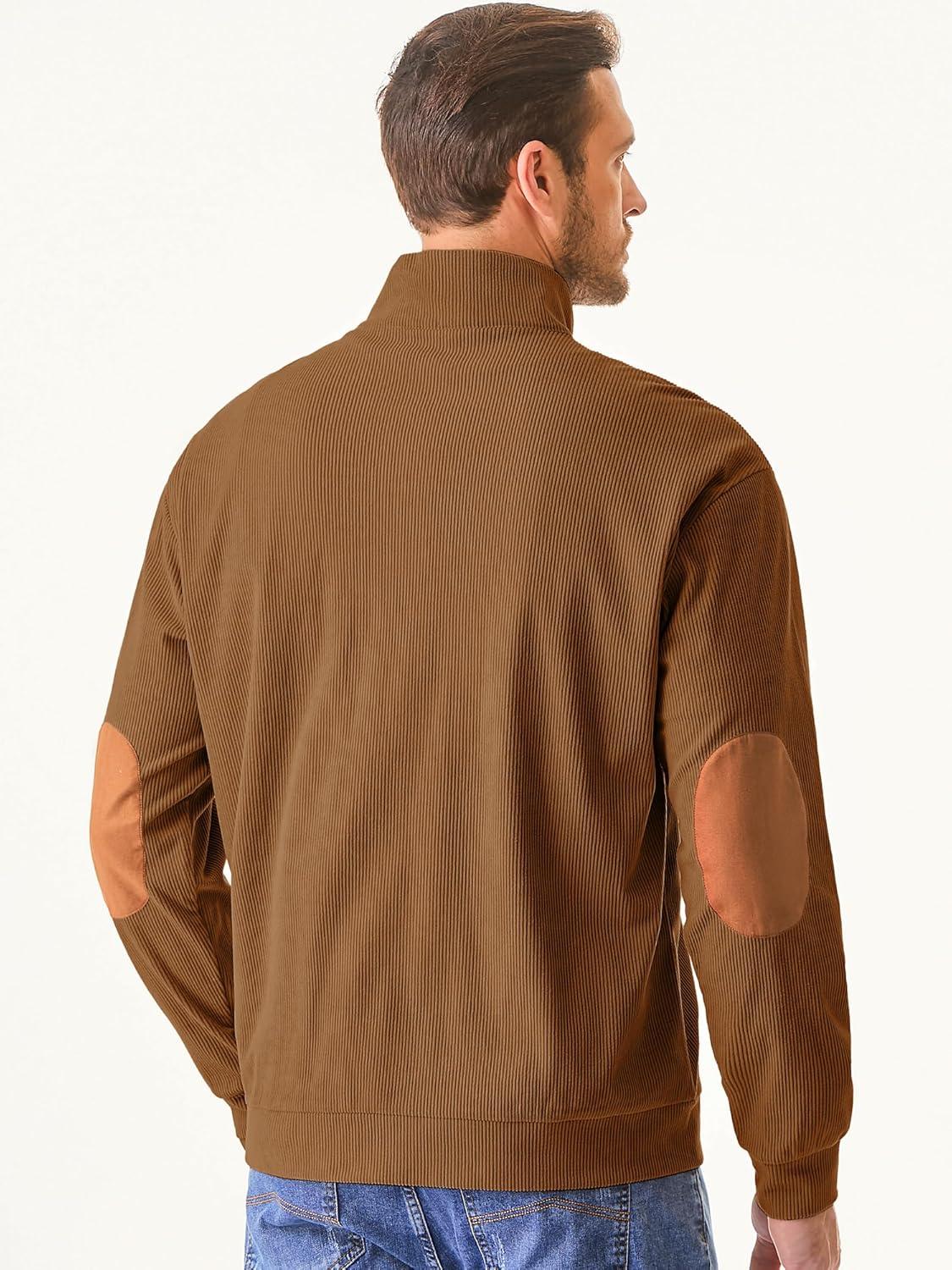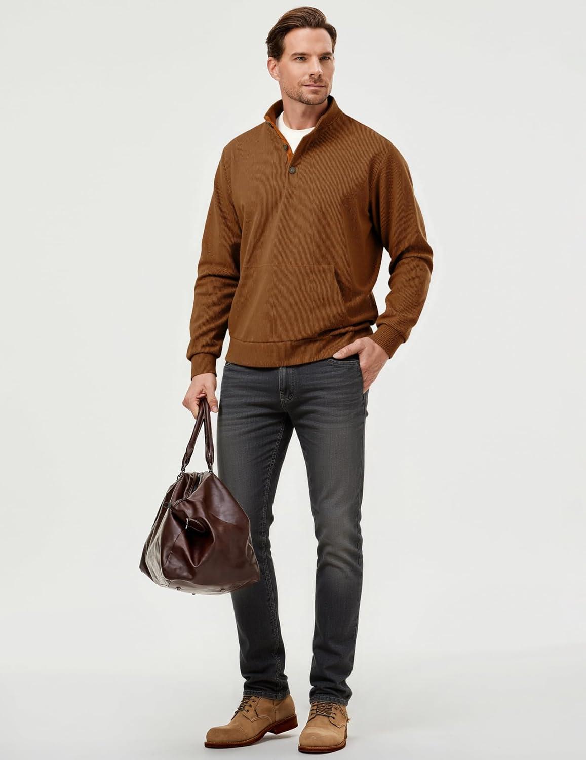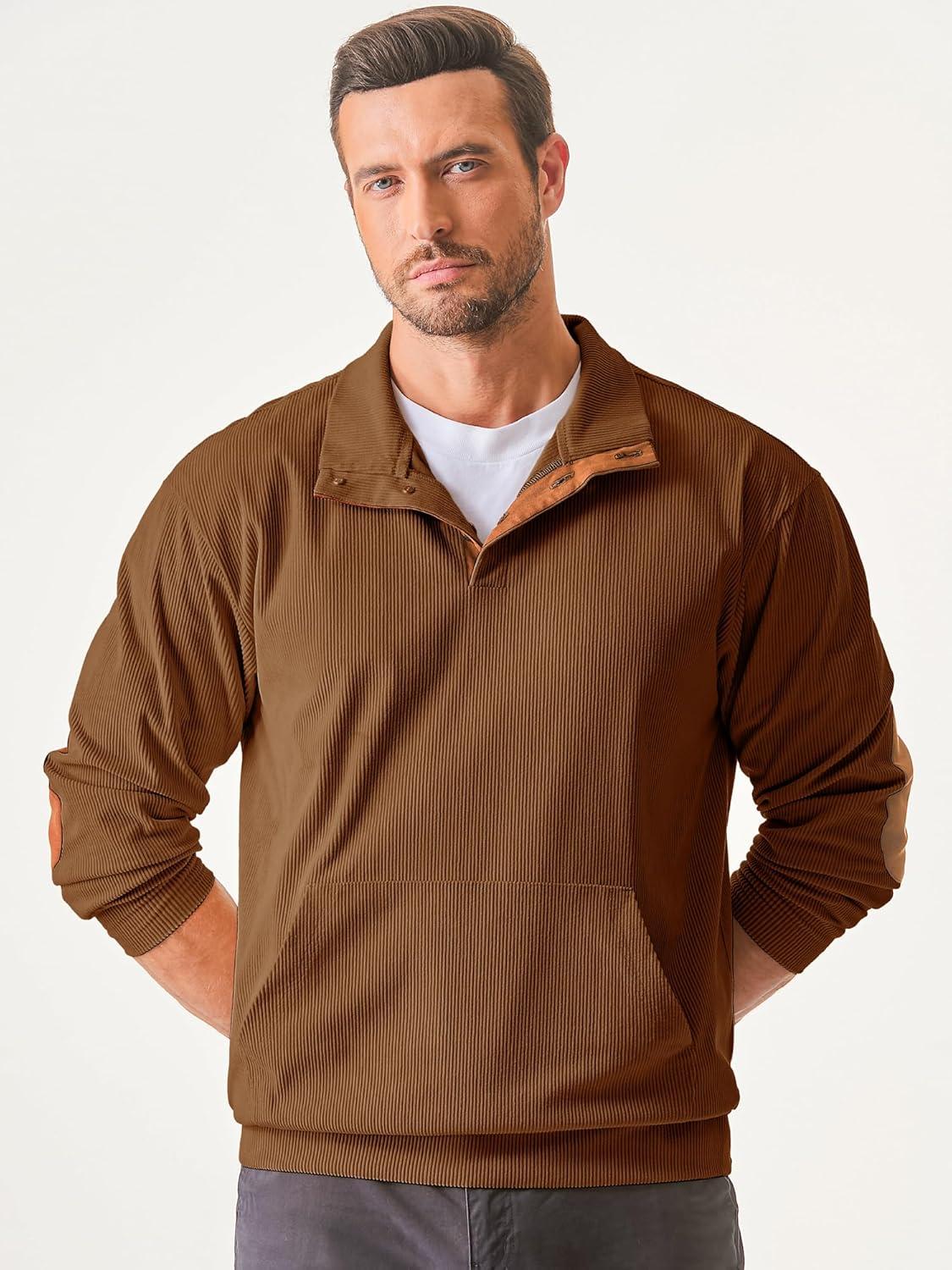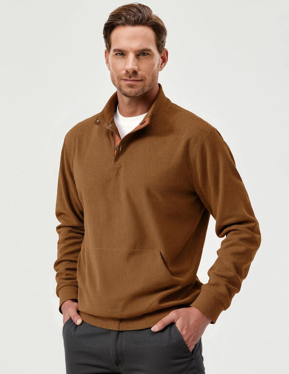 JMIERR Mens Warm Corduroy Sweatshirt Casual Stand Collar Quarter Fall Metal Button Pullover Sweaters Long Sleeve with Pockets(F Chestnut Brown)
