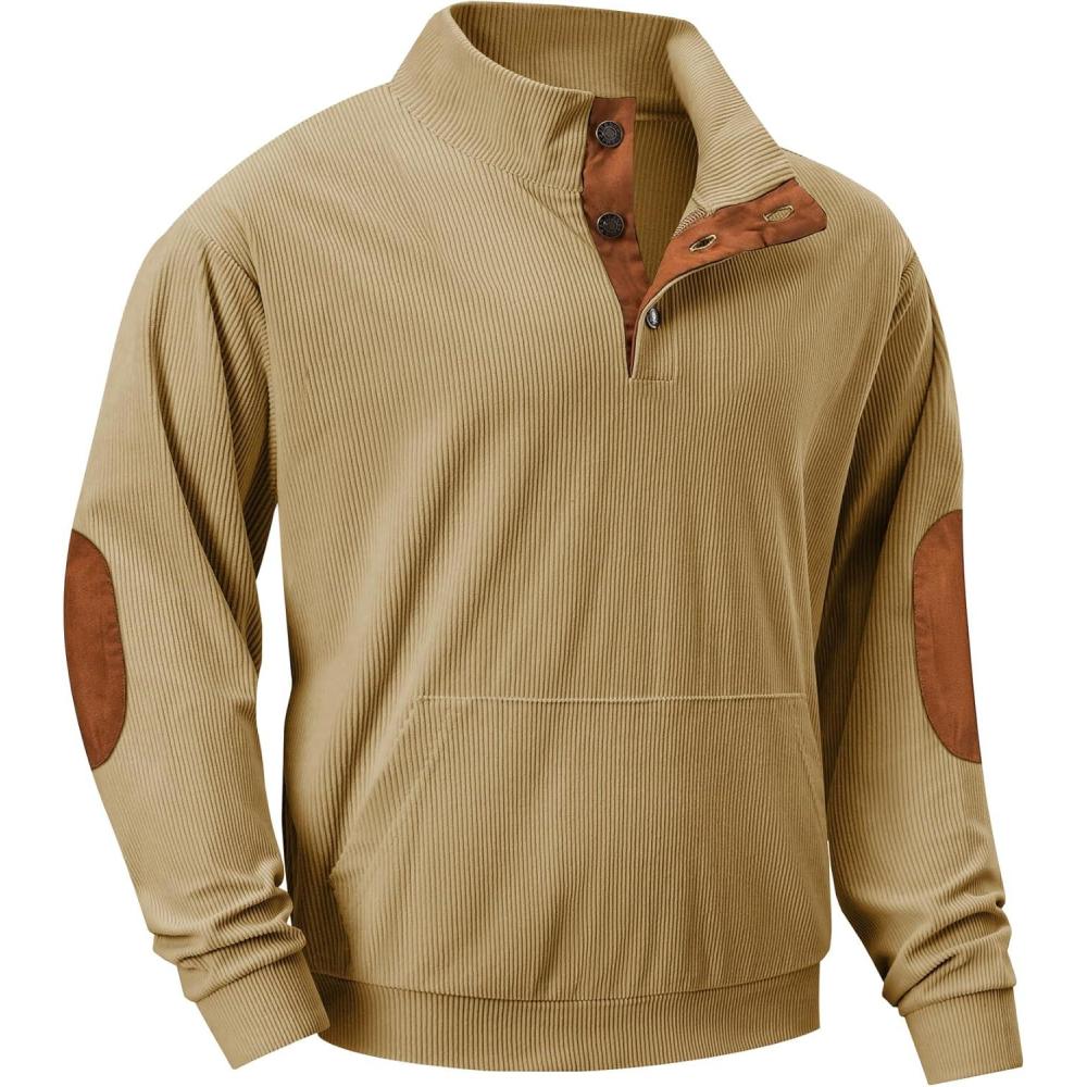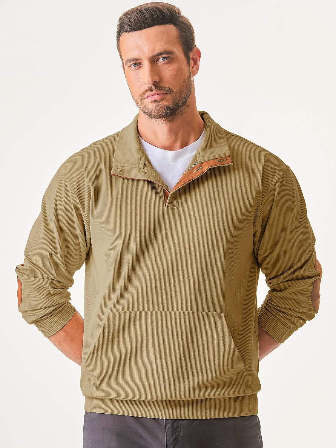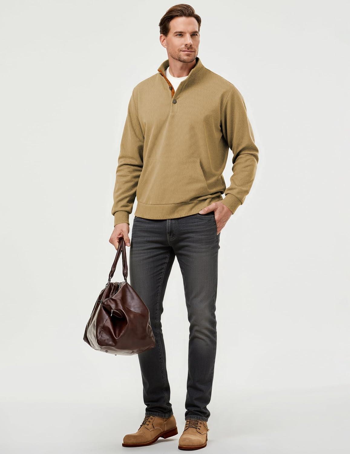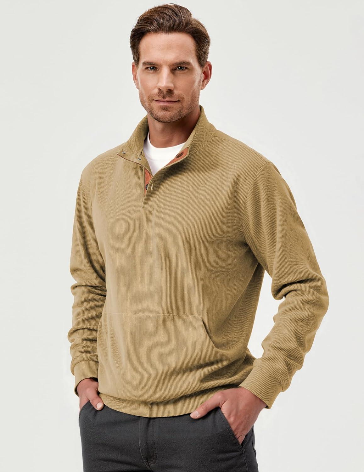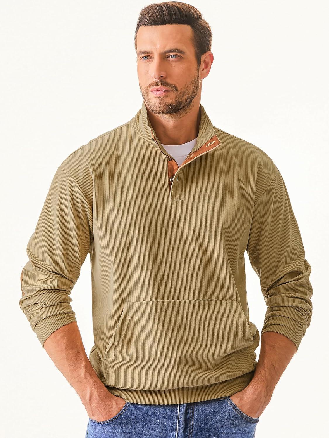 JMIERR Mens Warm Corduroy Sweatshirt Casual Stand Collar Quarter Fall Metal Button Pullover Sweaters Long Sleeve with Pockets(F Light French Beige)