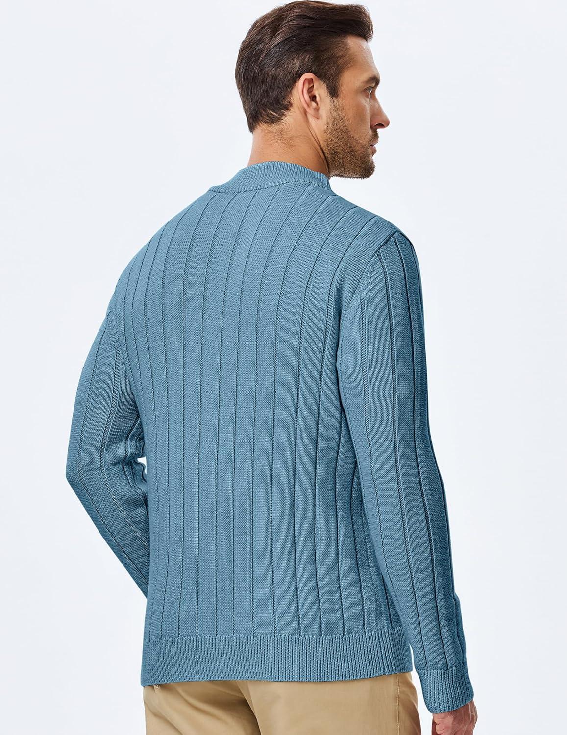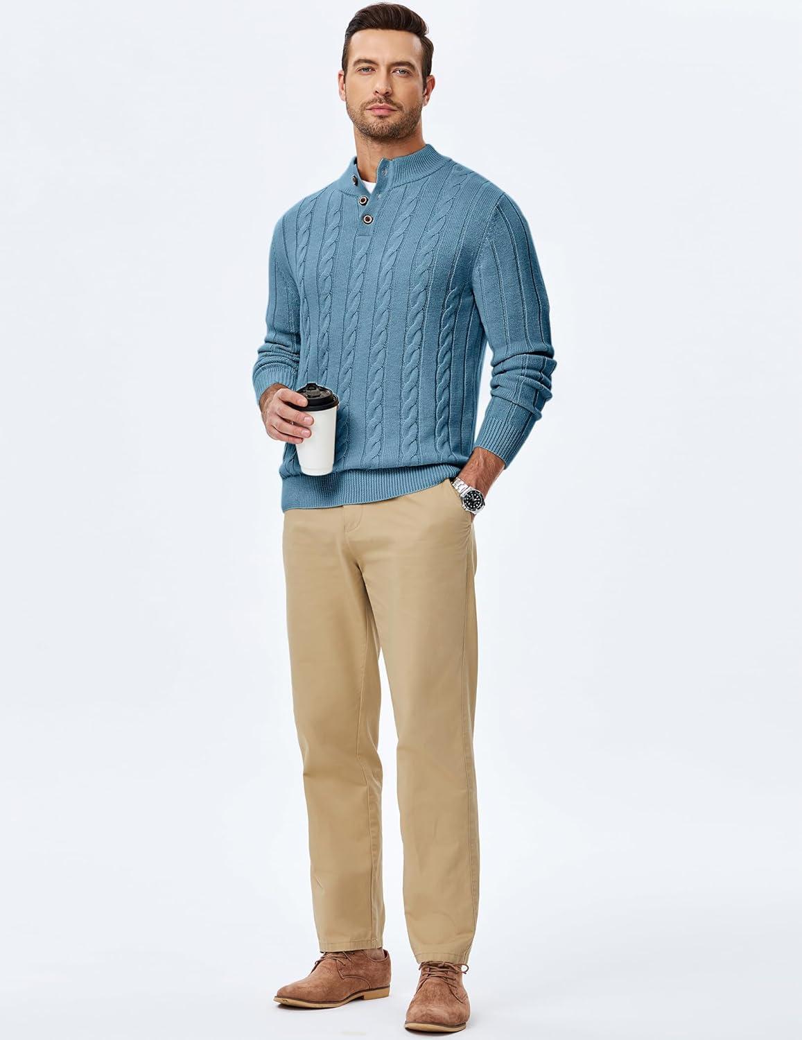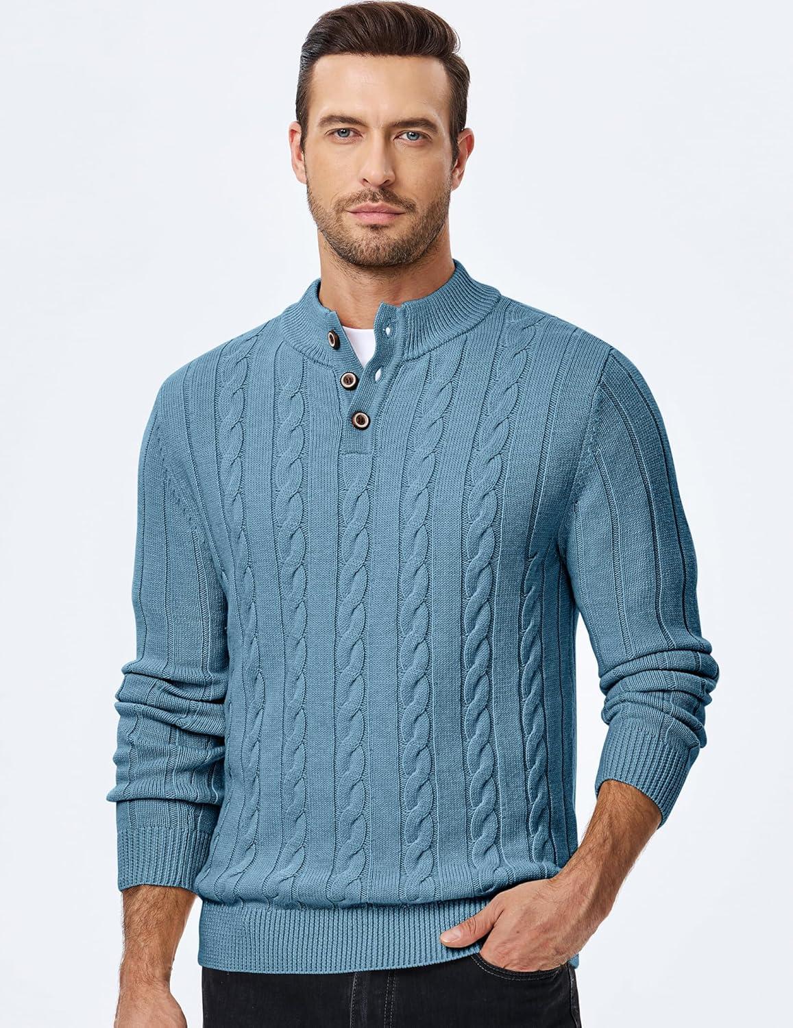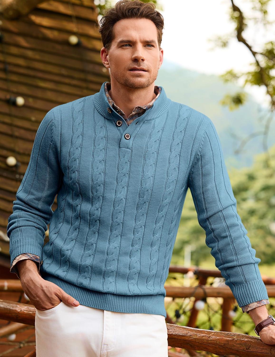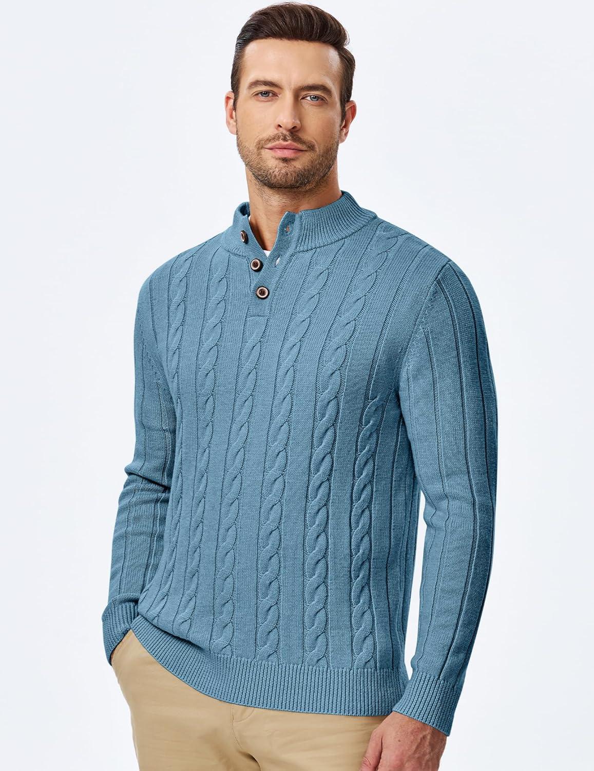 JMIERR Men’s Wool Blend Cable Knit Sweater Casual Long Sleeve Button Stand Collar Old Money Pullover Sweaters(Blue)